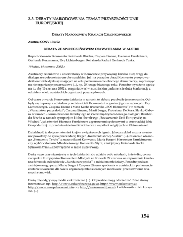 2.3. DEBATY NARODOWE NA TEMAT PRZYSZŁOŚCI UNII EUROPEJSKIEJ DEBATY NARODOWE W KRAJACH CZŁONKOWSKICH Austria; CONV 174/02 DEBATA ZE SPOŁECZEŃSTWEM OBYWATELSKIM W AUSTRII Raport członków Konwentu: Reinharda Böscha, Caspara Einema, Hannesa Farnleitnera, Gerharda Kurzmanna, Evy Lichtenberger, Reinharda Racka i Gerharda Tuska. Wiedeń, 14 czerwca 2002 r. Austriaccy członkowie i obserwatorzy w Konwencie przywiązują bardzo dużą wagę do dialogu ze społeczeństwem obywatelskim. Już na początku obrad Konwentu przeprowadzili oni wiele dyskusji mających na celu podsumowanie obecnego stanu rzeczy, zapraszając na nie organizacje pozarządowe (...), np. 25 lutego bieżącego roku. Ponadto wyrażono zgodę na to, aby 16 czerwca 2002 r. zorganizować w austriackim parlamencie dużą konferencję z udziałem wielu austriackich organizacji pozarządowych. Od czasu otwarcia Konwentu działania w ramach tej debaty przybrały jeszcze na sile. Odbyły się imprezy z udziałem przedstawicieli Konwentu i organizacji pozarządowych: Evy Lichtenberger, Caspara Enema i Maxa Kocha (rzecznika „SOS Bliźniemu”) w ramach „Warsztatów przyszłości”; Caspara Einema, Marii Berger, Proinsiasa De Rosa, Slavko Gabera w ramach „Forum Brunona Kreisky`ego na rzecz międzynarodowego dialogu”; Reinharda Böscha w ramach sympozjum klubu liberalnego „Rozszerzenie Unii Europejskiej na Wschód”, jak również Hannesa Farnleitnera z partnerami społecznymi w Austriackiej Izbie Gospodarczej i z przedstawicielami Kościoła oraz wspólnot religijnych w Kleinmariazell. Działalność ta dotyczy również krajów związkowych i gmin. Jako przykład można wymienić powołany do życia przez Marię Berger „Konwent Górnej Austrii” (...), założenie własnego „Konwentu Tyrolu” z uczestnikami Konwentu Marią Berger i Hannesem Farnleitnerem czy wybór członków Młodzieżowego Konwentu Styrii, z inicjatywy Reinharda Racka. Sprawom tym (...) poświęcono w radio dużo uwagi. Dużą wagę przywiązuje się w tych działanich do udziału osób młodych, i nie tylko, co ma związek z Europejskim Konwentem Młodych w Brukseli. 27 czerwca na zaproszenie kanclerza Schüssela odbędzie się „Runda europejska” z udziałem młodzieży. Ponadto podczas zainicjowanego przez Marię Berger i Caspara Einema spotkania w austriackim parlamencie zostanie stworzona dla wielu organizacji młodzieżowych możliwość przedstawienia własnych stanowisk. Dużą rolę odgrywają media elektroniczne (...). Obywatele mogą odwiedzać różne strony internetowe, np.: http://www.zukunfteuropa.gv.at, http://www.eukonvent.at, http://www.europakonvent.info czy http://eukonvent.fpoe.at). I wiele osób z nich korzysta. (...) 154 Podkreślono też znaczenie wspólnej polityki zagranicznej i polityki bezpieczeństwa, rezygnacji ze stosowania energii jądrowej, przejrzystości i jasności decyzji Unii Europejskiej, pełniejszego włączenia młodzieży, czytelnych regulacji dotyczących podziału kompetencji i wzmocnienia regionów granicznych. Pożądana jest wspólna Europa, ale z zachowaniem kulturalnej i regionalnej tożsamości. Belgia; CONV 137/02 RAPORT Z BELGIJSKIEJ DEBATY NARODOWEJ NAD PRZYSZŁOŚCIĄ UNII EUROPEJSKIEJ W Belgii debata nad przyszłością Unii Europejskiej została otwarta jeszcze przed przyjęciem Deklaracji z Laeken; w chwili powołania Konwentu zostały podjęte pewne inicjatywy na rzecz kontynuowania tej dyskusji, inne zaś są dopiero planowane, tak aby ją jeszcze bardziej zintensyfikować i rozszerzyć. Debata jest w dużej mierze zdecentralizowana, inicjatywy podejmują nie tylko członkowie Konwentu wskazani przez parlament i premiera, lecz także takie instytucje, jak parlament federalny, a w szczególności jego Komitet ds. opiniowania kwestii europejskich, partie polityczne, stowarzyszenia przedsiębiorstw, związki zawodowe (...), stowarzyszenia prywatne czy też organizacje pozarządowe, działające same lub wspólnie, ośrodki studiów i badań. Dąży się do tego, aby debacie nadać pewne ramy strukturalne. Zgodnie z życzeniem Prezydium, belgijscy członkowie Konwentu przywiązują wagę do rozwinięcia, w sposób indywidualny lub kolektywny, dwupoziomowej kampanii przy zaangażowaniu sieci i środków pozostających w dyspozycji każdego z nich. Kampania ta ma na celu, z jednej strony, informowanie i uwrażliwianie opinii publicznej na wyzwania stojące przed Konwentem, na poruszane w jego ramach tematy, a z drugiej – wysłuchanie obaw i zebranie opinii na temat przyszłości Unii. Jednym z celów jest uniknięcie sytuacji, gdy debata zostanie ograniczona wyłącznie do kręgu specjalistów – czy to ze świata polityki, środowiska akademickiego, czy ze środowiska lobbystów. W związku z tym wsparcie mediów i wykorzystanie Internetu – specjalna strona www.euconvention.be stworzona specjalnie na tę okazję – powinny się przyczynić do szerszego rozpowszechnienia informacji, tak by stała się ona dostępna dla wielu grup, w tym dla ludzi młodych. W tym samym celu przedstawiciele poszczególnych grup społeczeństwa, jakimi są partnerzy społeczni, środowiska edukacji i nauki, kultury, prasy lub partii politycznych, zostaną nie tylko bezpośrednio wysłuchani przez członków Konwentu, jako wyraziciele różnorodnych opinii społeczeństwa belgijskiego, ale także zostaną poproszeni o rozszerzenie prowadzonej debaty również na ich własne środowiska. 155 MONITOR INTEGRACJI EUROPEJSKIEJ – URZĄD KOMITETU INTEGRACJI EUROPEJSKIEJ Wśród młodzieży charakterystyczne jest coraz silniejsze poparcie dla Europy, przeważa liczba komentarzy proeuropejskich, mimo rzeczowej krytyki Unii Europejskiej, której też nie brak. Sceptyczne były głównie te komentarze, które wyraźnie nawiązywały do rozszerzenia. Główne punkty krytyki to: brak możliwości współdecydowania przez obywateli, zbyt mała rola Parlamentu Europejskiego i lekceważenie aspektów społeczno-poli