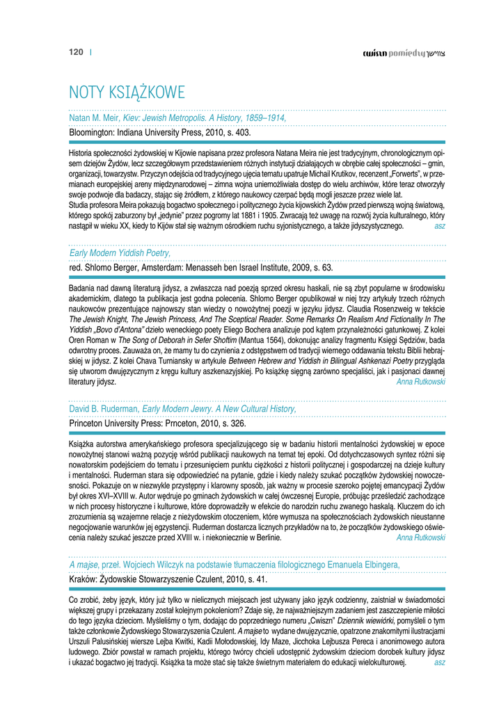 120 NOTY KSIĄŻKOWE Natan M. Meir, Kiev: Jewish Metropolis. A History, 1859–1914, Bloomington: Indiana University Press, 2010, s. 403. Historia społeczności żydowskiej w Kijowie napisana przez profesora Natana Meira nie jest tradycyjnym, chronologicznym opisem dziejów Żydów, lecz szczegółowym przedstawieniem różnych instytucji działających w obrębie całej społeczności – gmin, organizacji, towarzystw. Przyczyn odejścia od tradycyjnego ujęcia tematu upatruje Michail Krutikov, recenzent „Forwerts”, w przemianach europejskiej areny międzynarodowej – zimna wojna uniemożliwiała dostęp do wielu archiwów, które teraz otworzyły swoje podwoje dla badaczy, stając się źródłem, z którego naukowcy czerpać będą mogli jeszcze przez wiele lat. Studia profesora Meira pokazują bogactwo społecznego i politycznego życia kijowskich Żydów przed pierwszą wojną światową, którego spokój zaburzony był „jedynie” przez pogromy lat 1881 i 1905. Zwracają też uwagę na rozwój życia kulturalnego, który nastąpił w wieku XX, kiedy to Kijów stał się ważnym ośrodkiem ruchu syjonistycznego, a także jidyszystycznego. asz Early Modern Yiddish Poetry, red. Shlomo Berger, Amsterdam: Menasseh ben Israel Institute, 2009, s. 63. Badania nad dawną literaturą jidysz, a zwłaszcza nad poezją sprzed okresu haskali, nie są zbyt popularne w środowisku akademickim, dlatego ta publikacja jest godna polecenia. Shlomo Berger opublikował w niej trzy artykuły trzech różnych naukowców prezentujące najnowszy stan wiedzy o nowożytnej poezji w języku jidysz. Claudia Rosenzweig w tekście The Jewish Knight, The Jewish Princess, And The Sceptical Reader. Some Remarks On Realism And Fictionality In The Yiddish „Bovo d’Antona” dzieło weneckiego poety Eliego Bochera analizuje pod kątem przynależności gatunkowej. Z kolei Oren Roman w The Song of Deborah in Sefer Shoftim (Mantua 1564), dokonując analizy fragmentu Księgi Sędziów, bada odwrotny proces. Zauważa on, że mamy tu do czynienia z odstępstwem od tradycji wiernego oddawania tekstu Biblii hebrajskiej w jidysz. Z kolei Chava Turniansky w artykule Between Hebrew and Yiddish in Bilingual Ashkenazi Poetry przygląda się utworom dwujęzycznym z kręgu kultury aszkenazyjskiej. Po książkę sięgną zarówno specjaliści, jak i pasjonaci dawnej literatury jidysz. Anna Rutkowski David B. Ruderman, Early Modern Jewry. A New Cultural History, Princeton University Press: Prnceton, 2010, s. 326. Książka autorstwa amerykańskiego profesora specjalizującego się w badaniu historii mentalności żydowskiej w epoce nowożytnej stanowi ważną pozycję wśród publikacji naukowych na temat tej epoki. Od dotychczasowych syntez różni się nowatorskim podejściem do tematu i przesunięciem punktu ciężkości z historii politycznej i gospodarczej na dzieje kultury i mentalności. Ruderman stara się odpowiedzieć na pytanie, gdzie i kiedy należy szukać początków żydowskiej nowoczesności. Pokazuje on w niezwykle przystępny i klarowny sposób, jak ważny w procesie szeroko pojętej emancypacji Żydów był okres XVI–XVIII w. Autor wędruje po gminach żydowskich w całej ówczesnej Europie, próbując prześledzić zachodzące w nich procesy historyczne i kulturowe, które doprowadziły w efekcie do narodzin ruchu zwanego haskalą. Kluczem do ich zrozumienia są wzajemne relacje z nieżydowskim otoczeniem, które wymusza na społecznościach żydowskich nieustanne negocjowanie warunków jej egzystencji. Ruderman dostarcza licznych przykładów na to, że początków żydowskiego oświecenia należy szukać jeszcze przed XVIII w. i niekoniecznie w Berlinie. Anna Rutkowski A majse, przeł. Wojciech Wilczyk na podstawie tłumaczenia filologicznego Emanuela Elbingera, Kraków: Żydowskie Stowarzyszenie Czulent, 2010, s. 41. Co zrobić, żeby język, który już tylko w nielicznych miejscach jest używany jako język codzienny, zaistniał w świadomości większej grupy i przekazany został kolejnym pokoleniom? Zdaje się, że najważniejszym zadaniem jest zaszczepienie miłości do tego języka dzieciom. Myśleliśmy o tym, dodając do poprzedniego numeru „Cwiszn” Dziennik wiewiórki, pomyśleli o tym także członkowie Żydowskiego Stowarzyszenia Czulent. A majse to wydane dwujęzycznie, opatrzone znakomitymi ilustracjami Urszuli Palusińskiej wiersze Lejba Kwitki, Kadii Mołodowskiej, Idy Maze, Jicchoka Lejbusza Pereca i anonimowego autora ludowego. Zbiór powstał w ramach projektu, którego twórcy chcieli udostępnić żydowskim dzieciom dorobek kultury jidysz i ukazać bogactwo jej tradycji. Książka ta może stać się także świetnym materiałem do edukacji wielokulturowej. asz RECENZJE 121 Royaumes juifs: trésors de la literature yiddish, red. i wstęp Rachel Ertel, Paryż: Robert Laffont (Bouquins), tom 1–2 (2008–2009). W serii Bouquins wydawnictwa Robert Laffont ukazała się jakiś czas temu dwutomowa antologia prozy jidysz (razem ponad tysiąc osiemset stron), Les Royaumes juifs [Żydowskie królestwa]. Redaktorka tej monumentalnej publikacji, Rachel Ertel, wydała kilka ważnych książek, jak Le Shtetl [Sztetl, 1982], Dans la langue de personne: poésie yiddish de l’anéantissement [W języku niczyim: żydowska poezja Zagłady, 1993], Brasier de mots [Słowa gorejące, 2003]. Antologia obejmuje utwory trzynastu pisarzy, od trzech ojców literatury jidysz – Mendele Mojcher-Sforima, Szolem-Alejchema i Jicchoka Lejbusza Pereca, przez modernistów z początków dwudziestego wieku, jak Dowid Bergelson, Der Nister czy Mojsze Kulbak, po prozaików z okresu po drugiej wojnie światowej, jak Jeszaje Szpigl. Tytuł zaczerpnięty jest z cyklu pogromowych opowiadań Lameda Szapiro Di jidisze meluche [Żydowskie królestwo], który znajduje się w drugim tomie antologii. Całość dopełnia stustronicowy tekst Rachel Ertel o literaturze jidysz, a osobny wstęp jej autorstwa poprzedza każde