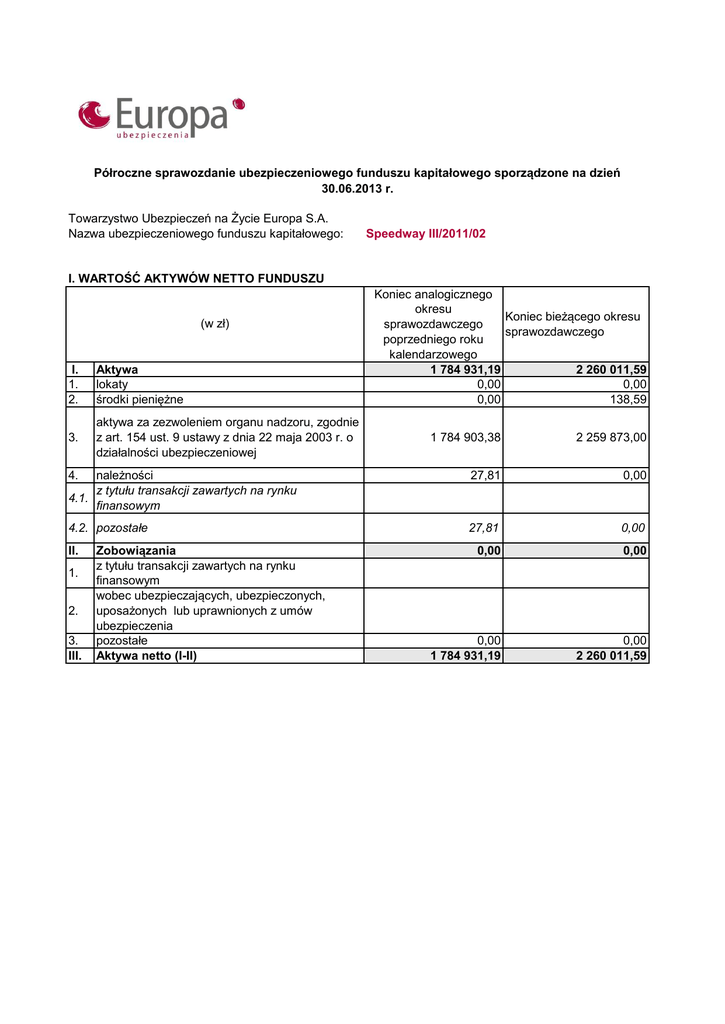 Półroczne sprawozdanie ubezpieczeniowego funduszu kapitałowego sporządzone na dzień 30.06.2013 r. Towarzystwo Ubezpieczeń na Życie Europa S.A. Nazwa ubezpieczeniowego funduszu kapitałowego: Speedway III/2011/02 I. WARTOŚĆ AKTYWÓW NETTO FUNDUSZU (w zł) I. 1. 2. Aktywa lokaty środki pieniężne 3. aktywa za zezwoleniem organu nadzoru, zgodnie z art. 154 ust. 9 ustawy z dnia 22 maja 2003 r. o działalności ubezpieczeniowej Koniec analogicznego okresu Koniec bieżącego okresu sprawozdawczego sprawozdawczego poprzedniego roku kalendarzowego 1 784 931,19 2 260 011,59 0,00 0,00 0,00 138,59 1 784 903,38 2 259 873,00 4. należności z tytułu transakcji zawartych na rynku 4.1. finansowym 27,81 0,00 4.2. pozostałe 27,81 0,00 0,00 0,00 0,00 1 784 931,19 0,00 2 260 011,59 II. 1. 2. 3. III. Zobowiązania z tytułu transakcji zawartych na rynku finansowym wobec ubezpieczających, ubezpieczonych, uposażonych lub uprawnionych z umów ubezpieczenia pozostałe Aktywa netto (I-II) Półroczne sprawozdanie ubezpieczeniowego funduszu kapitałowego sporządzone na dzień 30.06.2013 r. Towarzystwo Ubezpieczeń na Życie Europa S.A. Nazwa ubezpieczeniowego funduszu kapitałowego: Speedway III/2011/02 II. ZMIANY AKTYWÓW NETTO FUNDUSZU (w zł) A. B. I. 1. 2. 3. II. 1. 2. 3. 4. 5. 6. 7. Aktywa netto funduszu na początek okresu sprawozdawczego Stan netto z działalności operacyjnej (I-II) Zwiększenia funduszu tytułem składek zwiększających wartość funduszu pozostałe przychody pozostałe zwiększenia Zmniejszenia funduszu tytułem wykupu tytułem wypłat pozostałych świadczeń ubezpieczeniowych tytułem opłaty za ryzyko ubezpieczeniowe oraz innych opłat potrącanych z fuduszu tytułem zwrotu składek ubezpieczeniowych tytułem opłat za zarządzanie funduszem oraz innych opłat tytułem administrowania funduszem pozostałe koszty Analogiczny okres sprawozdawczy poprzedniego roku kalendarzowego Bieżący okres sprawozdawczy 1 878 962,79 2 029 381,19 0,00 0,00 0,00 0,00 0,00 0,00 0,00 0,00 0,00 0,00 0,00 0,00 0,00 0,00 -94 031,60 230 630,40 1 784 931,19 2 260 011,59 pozostałe zmniejszenia C. Wynik netto z działalności inwestycyjnej D. Aktywa netto funduszu na koniec okresu sprawozdawczego Półroczne sprawozdanie ubezpieczeniowego funduszu kapitałowego sporządzone na dzień 30.06.2013 r. Towarzystwo Ubezpieczeń na Życie Europa S.A. Nazwa ubezpieczeniowego funduszu kapitałowego: III LICZBA I WARTOŚĆ JEDNOSTEK ROZRACHUNKOWYCH (w zł) I. 1. 2. II. 1. 2. 3. 4. Speedway III/2011/02 Liczba jednostek rozrachunkowych: na początek okresu sprawozdawczego na koniec okresu sprawozdawczego Wartość jednostki rozrachunkowej (w zł): na początek okresu sprawozdawczego minimalna wartość jednostki rozrachunkowej w okresie sprawozdawczym maksymalna wartość jednostki rozrachunkowej w okresie sprawozdawczym na koniec okresu sprawozdawczego Analogiczny okres sprawozdawczy poprzedniego roku kalendarzowego Bieżący okres sprawozdawczy 27 819,9999 27 819,9999 27 719,9999 27 719,9999 67,54 73,21 61,00 73,21 67,54 64,16 84,34 81,53 Półroczne sprawozdanie ubezpieczeniowego funduszu kapitałowego sporządzone na dzień 30.06.2013 r. Towarzystwo Ubezpieczeń na Życie Europa S.A. Nazwa ubezpieczeniowego funduszu kapitałowego: IV ZESTAWIENIE AKTYWÓW NETTO FUNDUSZU (w zł) I. 1. 2. Speedway III/2011/02 Lokaty (suma 1-12) papiery wartościowe emitowane, poręczone lub gwarantowane przez Skarb Państwa lub organizacje międzynarodowe, których członkiem jest Rzeczpospolita Polska obligacje emitowane lub poręczone przez jednostki samorządu terytorialnego lub związki jednostek samorządu terytorialnego Udział w aktywach netto funduszu (w %) 0,00 0,00% Wartość bilansowa (w zł) 0,00 0,00% 0,00% 3. Inne dłużne papiery wartościowe o stałej stopie dochodu 0,00 0,00% 4. 5. 6. akcje udziały jednostki uczestnictwa lub certyfikaty inwestycyjne w funduszach inwestycyjnych instrumenty pochodne, o ile służą zmniejszeniu ryzyka związanego z innymi aktywami stanowiącymi pokrycie rezerw techniczno-ubezpieczeniowych inne papiery wartościowe o zmiennej stopie dochodu pożyczki nieruchomości depozyty bankowe pozostałe lokaty Aktywa za zezwoleniem organu nadzoru, zgodnie z art.. 154 ust.9 ustawy z dnia 22 maja 2003 r. o działalności ubezpieczeniowej Środki pieniężne Należności Zobowiązania Aktywa netto (w tym) krajowe zagraniczne - kraje UE zagraniczne - kraje poza UE 0,00 0,00% 0,00% 0,00 0,00% 0,00 0,00% 7. 8. 9. 10. 11. 12. II. III. IV V. VI. 1. 2. 3. 0,00 0,00 0,00% 0,00% 0,00% 0,00% 0,00% 2 259 873,00 138,59 0,00 0,00 2 260 011,59 138,59 2 259 873,00 0,00 99,99% 0,01% 0,00% 0,00% 100,00% 0,01% 99,99% 0,00% 0,00