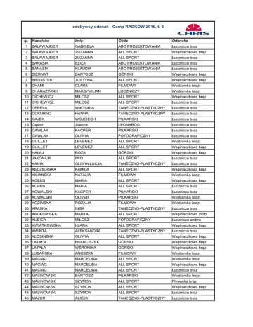 zdobywcy odznak - Camp RADKÓW 2016, t. 5 Imię Obóz Odznaka 1 BALAWAJDER GABRIELA ABC PROJEKTOWANIA Łucznicza brąz 2 BALAWAJDER ZUZANNA ALL SPORT Wspinaczkowa brąz 3 BALAWAJDER ZUZANNA ALL SPORT Łucznicza brąz 4 BANASIK ELIZA ABC PROJEKTOWANIA Łucznicza brąz 5 BANASIK KLAUDIA ABC PROJEKTOWANIA Łucznicza brąz 6 BIERNAT BARTOSZ GÓRSKI Wspinaczkowa brąz 7 BRZOSTEK JUSTYNA ALL SPORT Wspinaczkowa brąz 8 CHAMI CLARA FILMOWY Wioślarska brąz 9 CHARAZIŃSKI MAKSYMILIAN ŁUCZNICZY Wioślarska brąz 10 CICHEWICZ MIŁOSZ ALL SPORT Wspinaczkowa brąz 11 CICHEWICZ MIŁOSZ ALL SPORT Łucznicza brąz 12 DERELA WIKTORIA TANECZNO-PLASTYCZNY Łucznicza brąz 13 DOKURNO HANNA TANECZNO-PLASTYCZNY Łucznicza brąz 14 GAJEK WOJCIECH PIŁKARSKI Łucznicza brąz 15 Gąsior Joanna LEONARDO Łucznicza brąz 16 GAWLAK KACPER PIŁKARSKI Łucznicza brąz 17 GAWLAK OLIWIA FOTOGRAFICZNY Łucznicza brąz 18 GUILLET LEVENEZ ALL SPORT Wioślarska brąz 19 GUILLET LEVENEZ ALL SPORT Wspinaczkowa brąz 20 HAŁAJ RÓŻA GÓRSKI Wspinaczkowa brąz 21 JAKONIUK IWO ALL SPORT Łucznicza brąz 22 KANIA OLIWIA ŁUCJA TANECZNO-PLASTYCZNY Łucznicza brąz 23 KĘDZIERSKA KAMILA ALL SPORT Wspinaczkowa brąz 24 KILIAŃSKA NATALIA FILMOWY Wioślarska brąz 25 KOBUS MARIA ALL SPORT Wspinaczkowa brąz 26 KOBUS MARIA ALL SPORT Łucznicza brąz 27 KOWALSKI KACPER PIŁKARSKI Łucznicza brąz 28 KOWALSKI OLIVER PIŁKARSKI Wioślarska brąz 29 KOZIŃSKA ROZALIA FILMOWY Wioślarska brąz 30 KRASKA INGA TANECZNO-PLASTYCZNY Łucznicza brąz 31 KRUKOWSKA MARTA ALL SPORT Wspinaczkowa złoto 32 KUBICA MIŁOSZ FOTOGRAFICZNY Łucznicza srebro 33 KWIATKOWSKA KLARA ALL SPORT Wspinaczkowa brąz 34 KWINTA ALEKSANDRA TANECZNO-PLASTYCZNY Łucznicza brąz 35 KŁOSIŃSKA OLIWIA ALL SPORT Wspinaczkowa brąz 36 LATAŁA FRANCISZEK GÓRSKI Wspinaczkowa brąz 37 LATAŁA WERONIKA GÓRSKI Wspinaczkowa brąz 38 LUBAŃSKA ANUSZKA FILMOWY Wioślarska brąz 39 MACIĄG MARCELINA ALL SPORT Wioślarska brąz 40 MACIĄG MARCELINA ALL SPORT Wspinaczkowa brąz 41 MACIĄG MARCELINA ALL SPORT Łucznicza brąz 42 MALINOWSKI BARTOSZ PIŁKARSKI Wioślarska brąz 43 MALINOWSKI SZYMON ALL SPORT Pływacka brąz 44 MALINOWSKI SZYMON ALL SPORT Wspinaczkowa brąz 45 MALINOWSKI SZYMON ALL SPORT Łucznicza brąz 46 MAZUR ALICJA TANECZNO-PLASTYCZNY Łucznicza brąz lp. Nazwisko 47 MICHALAK-PALARZ JAKUB ALL SPORT Wspinaczkowa brąz 48 MICHALAK-PALARZ JAKUB ALL SPORT Łucznicza brąz 49 MRYGOŃ MARTA FILMOWY Wioślarska brąz 50 MŁOTKOWSKA EMILIA LEONARDO Łucznicza brąz 51 NIKIEL STANISŁAW FOTOGRAFICZNY Łucznicza srebro 52 PALUCHOWSKA OLIWIA GÓRSKI Wspinaczkowa brąz 53 PIOTROWSKA ZOFIA TANECZNO-PLASTYCZNY Łucznicza brąz 54 POTAPOWICZ MAKSYM PIŁKARSKI Wioślarska brąz 55 PRZYGODZKI RAFAŁ PIŁKARSKI Wioślarska brąz 56 RADZIUN PATRYK GÓRSKI Wspinaczkowa brąz 57 RAWA BARBARA TANECZNO-PLASTYCZNY Łucznicza brąz 58 RYTEL MELANIA ALL SPORT Wspinaczkowa brąz 59 RYTEL MELANIA ALL SPORT Łucznicza brąz 60 ŚCIBIOR BARTOSZ FOTOGRAFICZNY Łucznicza brąz 61 SEPESI MALGORZATA FILMOWY Pływacka srebro 62 SIEMION JULIA ALL SPORT Wspinaczkowa brąz 63 SIEMION JULIA ALL SPORT Łucznicza srebro 64 SIWIŃSKI SEBASTIAN ALL SPORT Wioślarska brąz 65 SIWIŃSKI SEBASTIAN ALL SPORT Wspinaczkowa brąz 66 SIWIŃSKI SEBASTIAN ALL SPORT Łucznicza brąz 67 SOBCZAK JAN ALL SPORT Wspinaczkowa brąz 68 SOBCZAK JAN ALL SPORT Łucznicza brąz 69 SULIK ANNA ALL SPORT Wspinaczkowa brąz 70 SULIK ANNA ALL SPORT Łucznicza brąz 71 SZELIGA SZYMON GÓRSKI Wspinaczkowa srebro 72 SZPALA OLIVER ALL SPORT Pływacka brąz 73 SZPALA OLIVER ALL SPORT Wspinaczkowa brąz 74 SZPALA OLIVER ALL SPORT Łucznicza brąz 75 TYNIEC JEREMI ŁUCZNICZY Wioślarska brąz 76 WAJDA MACIEJ ŁUCZNICZY Wioślarska brąz 77 WALCZAK PAULINA TANECZNO-PLASTYCZNY Łucznicza brąz 78 WALCZAK ZUZANNA FILMOWY Łucznicza brąz 79 WENCEL FILIP PIŁKARSKI Wioślarska brąz 80 ZALEWSKI ADAM ALL SPORT Wspinaczkowa srebro 81 ZALEWSKI ADAM ALL SPORT Łucznicza srebro 82 ZOMERFELD CYRYL ALL SPORT Pływacka brąz 83 ZOMERFELD CYRYL ALL SPORT Wspinaczkowa brąz 84 ZOMERFELD CYRYL ALL SPORT Łucznicza brąz 85 ZOMERFELD KACPER ALL SPORT Wspinaczkowa brąz 86 ZOMERFELD MATEUSZ ALL SPORT Pływacka brąz 87 ZOMERFELD MATEUSZ ALL SPORT Wspinaczkowa brąz 88 ZOMERFELD MATEUSZ ALL SPORT Łucznicza brąz 89 ŻUCHELKOWSKA BERENIKA TANECZNO-PLASTYCZNY Łucznicza brąz 90 ZWIERZ WERONIKA ALL SPORT Wspinaczkowa brąz 91 ZWIERZ WERONIKA ALL SPORT Łucznicza srebro 92 ZYCH KACPER ALL SPORT Wspinaczkowa brąz 93 ZYCH KACPER ALL SPORT Łucznicza brąz 94 ZYGOWSKI PIOTR PIŁKARSKI Łucznicza brąz