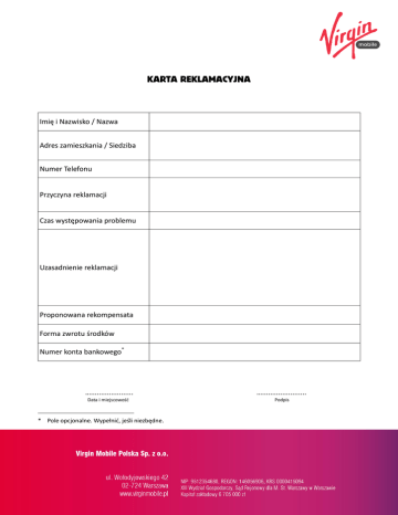 Imię i Nazwisko / Nazwa Adres zamieszkania / Siedziba Numer Telefonu Przyczyna reklamacji Czas występowania problemu Uzasadnienie reklamacji Proponowana rekompensata Forma zwrotu środków Numer konta bankowego* …..................... …...................... Data i miejscowość Podpis * Pole opcjonalne. Wypełnić, jeśli niezbędne.