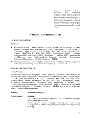Załącznik nr 4 do SWZ na wyłonienie wykonawcy robót budowlanych przygotowawczych zadania „Zasilanie elektryczne suwnic placowych RTG na terenie terminalu kontenerowego GCT w Gdyni na obszarze zadań 9 i10”- w postępowaniu przetargowym w ramach Projektu „Budowa infrastruktury i zakup sprzętu w ramach II etapu budowy Terminalu Kontenerowego GCT w Porcie Gdynia. Część I WARUNKI KONTRAKTU FIDIC A. WARUNKI OGÓLNE Kontrakt 1. Standardowe warunki Umowy stanowią „Warunki kontraktowe dla Budowy dla robót inżynieryjno- budowlanych projektowanych przez zamawiającego (CONDITIONS OF CONTRACT FOR CONSTRUCTION FOR BUILDING AND ENGINEERING WORKS DESIGNED BY THE EMPLOYER) Wydawnictwo: SIDIR; 4 wydanie angielsko-polskie niezmienione 2008 (tłumaczenie 1 wydania 1999) przygotowane i opublikowane przez Międzynarodową Federację Inżynierów Konsultantów (International Federation of Consulting Engineers – FIDIC). 2. Strony postanawiają, iż umowa będzie realizowana na warunkach określonych punkcie 1.01 ze zmianami zawartymi w warunkach szczególnych. – cz. II, zał. 4. B. WARUNKI SZCZEGÓLNE Strony Umowy: postanawiają wprowadzić następujące zmiany ogólnych „Warunków kontraktowych dla Budowy dla robót inżynieryjno - budowlanych projektowanych przez zamawiającego (CONDITIONS OF CONTRACT FOR CONSTRUCTION FOR BUILDING AND ENGINEERING WORKS DESIGNED BY THE EMPLOYER) Wydawnictwo: SIDIR; 4 wydanie angielsko-polskie niezmienione 2008 (tłumaczenie 1 wydania 1999) przygotowane i opublikowane przez Międzynarodową Federację Inżynierów Konsultantów (International Federation of Consulting Engineers – FIDIC), przyjętych do wykonania umowy - zwanych dalej warunkami. Klauzula 1 Postanowienia ogólne Subklauzula 1.1 Definicje 1.1.2.2 Definicję zawarta w subklauzuli 1.1.2.2 warunków zastępuje się postanowieniem o treści: “Zamawiający” oznacza osobę(y) określoną jako zamawiający w Załączniku do Oferty oraz prawnych następców lub cesjonariuszy tej osoby. 1 1.1.3.1 Definicja zawarta w subklauzuli 1.1.3.1 warunków – nie ma zastosowania do umowy. Subklauzula 1.5 Kolejność pierwszeństwa dokumentów Ostatni akapit subklauzuli 1.5 warunków zastępuje się postanowieniem o treści: Jeśli w dokumentach stwierdzona zostanie nieścisłość lub rozbieżność to Inżynier będzie miał prawo do wydania wszelkich poleceń, jakie uzna za konieczne dla wyjaśnienia nieścisłości czy rozbieżności. Subklauzula 1.7 Cesja Treść subklauzuli 1.7 warunków zastąpić postanowieniem o treści: (a) Wykonawca nie dokona cesji Kontraktu ani jakichkolwiek praw z niego bez pisemnej zgody Zamawiającego. Cesja taka zostanie dokonana w formie zaakceptowanej przez Zamawiającego. (b) Zamawiający będzie mieć prawo do dokonania cesji Kontraktu lub części lub całości praw i korzyści z niego wynikających bez uprzedniej zgody Wykonawcy. Ponadto, każda ze stron stanowiących Zamawiającego będzie mieć prawo do cesji całości lub części swoich praw i korzyści z Kontraktu bez uprzedniej zgody Wykonawcy. Po Subklauzuli 1.14 warunków dodać subklauzulę 1.15 o treści: Subklauzula 1.15 Szczegóły poufne Z wyjątkiem zakresu, w jakim będzie to niezbędne w celu wykonania obowiązków wynikających z niniejszego Kontraktu lub przestrzegania obowiązującego prawa, Wykonawca zachowa szczegóły niniejszego Kontraktu, jako prywatne i poufne. Wykonawca nie opublikuje, nie zezwoli na opublikowanie ani nie ujawni żadnych szczegółów Robót w jakimkolwiek piśmie branżowym lub technicznym ani gdziekolwiek indziej bez uprzedniego uzgodnienia z Zamawiającym. Klauzula 3 Inżynier Subklauzula 3.1 Obowiązki i zakres uprawnień Inżyniera Na końcu subklauzuli 3.1 warunków dodać postanowienie treści: “Podjęcie działań w oparciu o następujące Subklauzule niniejszych Warunków, będzie wymagało uzyskania przez Inżyniera pisemnej zgody Zamawiającego”. (a) Subklauzula 13.1 Prawo do zmian – Przyspieszenie Robót; (b) Subklauzula 13.3 Procedury zmian - Przyspieszenie Robót. Ponadto, Inżynier zobowiązany jest uzyskać pisemną zgodę Zamawiającego przed skorzystaniem ze swych uprawnień w odniesieniu do jakiejkolwiek Zmiany pociągającej za sobą jakikolwiek wydatek. 2 Subklauzula 3.4 Zmiana Inżyniera Treść subklauzuli 3.4 warunków zastąpić postanowieniem o treści: Jeśli Zamawiający będzie zamierzał dokonać zmiany Inżyniera, poinformuje on, z co najmniej 14–dniowym wyprzedzeniem, Wykonawcę o nazwie, adresie oraz istotnym doświadczeniu nowego Inżyniera. Wykonawca nie będzie mieć prawa do zgłaszania zastrzeżeń wobec nowego Inżyniera. Klauzula 4 Wykonawca Subklauzula 4.2 Zabezpieczenie Wykonania Pierwszy akapit subklauzuli 4.2 zastąpić postanowieniem o treści: Wykonawca na własny koszt uzyska i przedłoży w ciągu 14 dni od Daty Listu Akceptującego Zabezpieczenie Wykonania gwarantujące należyte wykonanie w kwocie i walucie określonej w Załączniku do Oferty oraz według wzoru zamieszczonego w Zestawieniu 2. Na końcu subklauzuli 4.2 dodać postanowienie o treści: W przypadku nie przedstawienia wymaganych w subklauzuli 4.2 dokumentów w określonym czasie, Zamawiający będzie miał prawo do wstrzymania, w całości lub części, którejkolwiek bądź wszystkich płatności należnych na podstawie Kontraktu do czasu pełnego wykonania niniejszej Subklauzuli bez prawa Wykonawcy do wstrzymania robót. Subklauzula 4.10 Dane o Terenie Budowy Usunąć treść subklauzuli 4.10 i zastąpić postanowieniem o treści: Uznaje się, iż Wykonawca dokonał badania i inspekcji Terenu Budowy oraz jego sąsiedztwa i uzyskał przed złożeniem oferty zadowalającą go wiedzę odnośnie istniejącego dostępu drogowego lub innych środków komunikacji i dostępu do Terenu Budowy, warunków hydrologicznych i klimatycznych, gruntowych, sztucznych przeszkód, ze wszelkich źródeł i warunków przez nie tworzonych, formy i charakteru Terenu Budowy