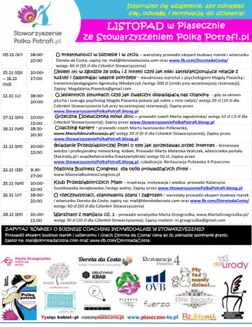 05.11 (śr) 18:0021:00 15.11 (sb) – 16.11 (nd) 10:0017:00 12.11 (śr) 18:0020:00 17.11 (pn) 10:0012:00 18:3020:30 18.11 (wt) O kreatywności w biznesie i w życiu – warsztaty prowadzi ekspert budowy marek i wizerunku Dorota da Costa; zapisy na: [email protected] oraz www.fb.com/DorotadaCosta/ wstęp: 60 zł (50 zł dla Członkiń Stowarzyszenia) Umiem żyć w zgodzie ze sobą i z innymi czyli jak mieć satysfakcjonujące relacje z ludźmi i zaspokajać własne potrzeby - dwudniowy warsztat z psychologiem Magdą Piasecką i trenerem/pedagogiem Agnieszką Włodarczyk /wstęp 300 zł (zniżki przy wcześniejszej rezerwacji); Zapisy: [email protected] O jesiennych smutkach czyli jak zwalczyć dopadającą nas chandrę - gdy za oknem plucha i szaruga psycholog Magda Piasecka pokaże jak sobie z nimi radzić/ wstęp 20 zł (10 zł dla Członkiń Stowarzyszenia lub przy wcześniejszej rezerwacji), Zapisy przez www.StowarzyszeniePolkaPotrafi.bloog.pl Grzeczna Dziewczynka mówi dość – prowadzi coach Marta Jagodzińska/ wstęp 10 zł ( 0 zł dla Członkiń Stowarzyszenia); Zapisy przez www.StowarzyszeniePolkaPotrafi.bloog.pl Coaching kariery - prowadzi coach Marta Iwanowska-Polkowska, www.ManufakturaRozwoju.pl/ wstęp 20 zł (0 zł dla Członkiń Stowarzyszenia); Zapisy przez www.StowarzyszeniePolkaPotrafi.bloog.pl 21.11 (pt) 10:0012:00 Śniadanie Przedsiębiorczej Polki o tym jak sprzedawać przez internet - biznesowa wiedza i profesjonalny networking kobiet; Prowadzi Marta Malarska-Walczak, właścicielka portalu DlaUrody.pl i współwłaścicielka KreatywnyKrab/ wstęp 50 zł, Zapisy przez www.StowarzyszeniePolkaPotrafi.bloog.pl; Lokalizacja: Restauracja Puławska 4 Piaseczno 22.11 (sb) 9:3017:00 Mazovia Business Congress dla osób prowadzących firmy www.MazoviaBusinessCongress.pl 25.11 (wt) 10:0012:00 18:0021:00 Klub Przedsiębiorczych Mam – inspiracja, motywacja i wiedza: prowadzi Katarzyna Szustkowska-Jarzębowska /wstęp wolny; Zapisy przez www.StowarzyszeniePolkaPotrafi.bloog.pl 10.0013.00 Warsztaty z makijażu cz. 1 - prowadzi wizażystka Marta Grzegrzułka, www.MartaGrzegrzulka.pl/ wstęp 30 zł (10 zł dla Członkiń Stowarzyszenia); Zapisy mailem: [email protected] 26.11 (śr) 28.11 (pt) O rzeczywistości, szanowaniu szans i zagrożeń - warsztaty prowadzi ekspert budowy marek i wizerunku Dorota da Costa; zapisy na: [email protected] oraz www.fb.com/DorotadaCosta/ wstęp: 60 zł (50 zł dla Członkiń Stowarzyszenia) ZAPYTAJ RÓWNIEŻ O BUSINESS COACHING INDYWIDUALNIE W STOWARZYSZENIU! Prowadzi ekspert budowy marek i wizerunku i coach Dorota da Costa/ cena 60 zł; pierwsze spotkanie gratis; zapisy na: [email protected] oraz www.fb.com/DorotadaCosta
