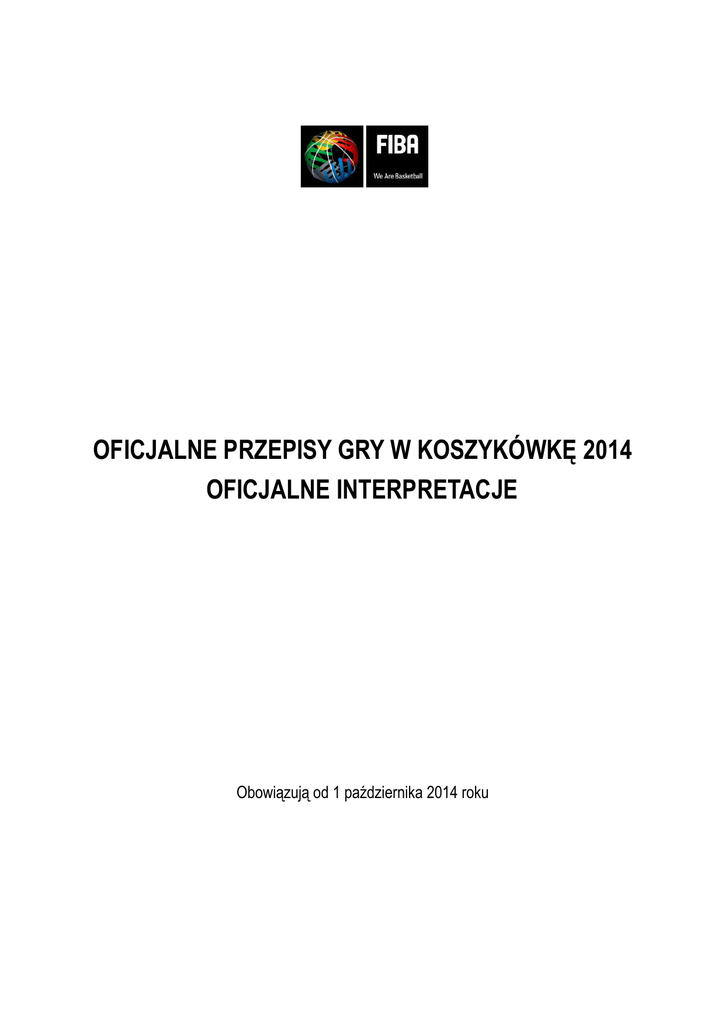 OFICJALNE PRZEPISY GRY W KOSZYKÓWKĘ 2014 OFICJALNE INTERPRETACJE Obowiązują od 1 października 2014 roku Interpretacje przedstawione w niniejszym dokumencie są Oficjalnymi Interpretacjami Oficjalnych Przepisów Gry w Koszykówkę FIBA 2014 i obowiązują od 1 października 2014r. Jeżeli interpretacje zawarte w tym dokumencie różnią się od publikowanych poprzednio Oficjalnych Interpretacji FIBA, niniejszy dokument ma pierwszeństwo. Oficjalne Przepisy Gry w Koszykówkę FIBA są zatwierdzane przez Zarząd Główny FIBA i są okresowo zmieniane przez Komisję Techniczną FIBA. Przepisy te, są formułowane tak przejrzyście i zrozumiale jak to tylko możliwe, ale omawiają raczej zasady niż sytuacje meczowe. Nie wyjaśniają one w pełni wszystkich, różnorodnych sytuacji, które mogą wydarzyć się podczas meczu koszykówki. Celem tego materiału jest przedstawienie zasad i pojęć zawartych w przepisach gry, na przykładzie praktycznych sytuacji, które mogą wydarzyć się podczas każdego meczu koszykówki. Interpretacje różnych sytuacji, mogą inspirować umysły sędziów i uzupełniać szczegółową wiedzę na temat samych przepisów. Podstawowym dokumentem, który określa zasady gry w zawodach FIBA pozostają jednak Oficjalne Przepisy Gry w Koszykówkę FIBA, zgodnie z którymi sędzia główny ma pełne prawo podejmowania decyzji w sytuacjach, które nie są określone w Oficjalnych Przepisach Gry w Koszykówkę FIBA lub w Oficjalnych Interpretacjach FIBA. W celu zachowania spójności w całym dokumencie, „drużyna A” jest (pierwotnie) drużyną atakującą, a „drużyna B” drużyną broniącą. Zawodnicy oznaczani są A1-A5 oraz B1-B5, a zmiennicy A6-A12 oraz B6-B12. * Tekst wyróżniony na żółto – nowe interpretacje oraz zmiany w interpretacjach publikowanych poprzednio Art. 5 Zawodnicy: Kontuzja 5-1 Reguła Jeżeli zawodnik jest kontuzjowany lub istnieje podejrzenie, że doznał kontuzji i w wyniku tego trener, asystent trenera, zmiennik lub inna osoba z personelu ławki tej drużyny wchodzi na boisko, to należy uznać, że zawodnikowi została udzielona pomoc medyczna, niezależnie od tego czy taka pomoc została faktycznie udzielona, czy też nie. 5-2 Przykład: A1 wygląda jakby uległ kontuzji kostki i gra zostaje zatrzymana. (a) Lekarz drużyny A wchodzi na boisko i opatruje kostkę A1. (b) Lekarz drużyny A wchodzi na boisko, ale A1 jest już zdolny do gry. (c) Trener drużyny A wchodzi na boisko, aby ocenić kontuzję A1. (d) Asystent trenera, zmiennik lub osoba towarzysząca drużynie A wchodzi na boisko, ale nie udziela pomocy A1. Interpretacja: We wszystkich sytuacjach, uznaje się, że A1 została udzielona pomoc medyczna i musi on zostać zmieniony. 5-3 Reguła Nie ma limitu czasu na usunięcie z boiska poważnie kontuzjowanego zawodnika, jeśli w opinii lekarza może to być niebezpieczne dla tego zawodnika. 5-4 Przykład: A1 jest poważnie kontuzjowany i gra zostaje zatrzymana na piętnaście (15) minut, ponieważ w opinii lekarza opuszczenie boiska przez zawodnika mogłoby być dla niego niebezpieczne. Interpretacja: Opinia lekarza określa właściwy moment, kiedy można usunąć kontuzjowanego zawodnika z boiska. Po dokonanej zmianie, gra zostanie wznowiona bez żadnych konsekwencji. 5-5 Reguła Jeżeli zawodnik jest kontuzjowany, krwawi lub ma otwartą ranę i nie może kontynuować gry natychmiast (w ciągu piętnastu (15) sekund), to musi zostać zmieniony. Jeżeli którejkolwiek z drużyn, podczas tego samego okresu zatrzymania zegara, zostanie przyznana przerwa na żądanie i zawodnik ten odzyska sprawność do gry w czasie tej przerwy, to będzie mógł kontynuować grę pod warunkiem, OFICJALNE INTERPRETACJE 2014 Strona 2 z 41 że sygnał sekretarza na tę przerwę na żądanie, zabrzmiał wcześniej niż sędzia swoim gestem przywołał zmiennika na boisko. 5-6 Przykład: A1 jest kontuzjowany i gra zostaje zatrzymana. Ponieważ A1 nie może kontynuować gry natychmiast, sędzia gwiżdże i sygnalizuje zmianę umownym gestem. Trener drużyny A (lub trener drużyny B) prosi o przerwę na żądanie: (a) Zanim zmiennik zawodnika A1 wejdzie na boisko. (b) Po tym, jak zmiennik zawodnika A1 wszedł na boisko. Pod koniec przerwy na żądanie, A1 zgłasza, że jest gotowy do gry i prosi o pozostanie w grze. Interpretacja: (a) Przerwa na żądanie została przyznana, a zatem jeśli A1 odzyskał sprawność do gry w trakcie jej trwania, to może on pozostać w grze. (b) Przerwa na żądanie została przyznana, ale ponieważ zmiennik zawodnika A1 wszedł już na boisko, A1 nie może stać się zawodnikiem, aż do kolejnej możliwości dokonania zmiany po fazie gry z włączonym zegarem. 5-7 Reguła Można dokonać zmiany zawodników w sytuacji, kiedy kontuzji ulegli zawodnicy wyznaczeni przez trenera do rozpoczęcia meczu lub zawodnicy, którym udzielona została pomoc pomiędzy rzutami wolnymi. W takiej sytuacji, drużyna przeciwna ma prawo dokonania zmiany takiej samej liczby zawodników. 5-8 Przykład: A1 jest faulowany przez B1 i zostają mu przyznane dwa (2) rzuty wolne. Po wykonaniu pierwszego rzutu wolnego, sędziowie stwierdzają, że A1 krwawi i zarządzają jego zmianę. W jego miejsce wchodzi A6, który ma wykonać drugi (2) rzut wolny. W tym momencie drużyna B prosi o zmianę dwóch (2) zawodników. Interpretacja: Drużyna B może dokonać zmiany tylko jednego (1) zawodnika. 5-9 Przykład: A1 jest faulowany przez B1 i zostają mu przyznane dwa (2) rzuty wolne. Po wykonaniu pierwszego rzutu wolnego sędziowie stwierdzają, że B3 krwawi i zarządzają jego zmianę. W jego miejsce wchodzi B6, a drużyna A prosi o zmianę jednego (1) zawodnika. Interpretacja: Drużyna A może dokonać zmiany jednego (1) zawodnika. Art. 7 Trenerzy: obowiązki i uprawnienia 7-1 Reguła Co najmniej dwadzieścia (20) minut przed wyznaczoną godziną rozpoczęcia meczu, każdy trener lub jego reprezentant, wręczy sekretarzowi listę nazwisk i nu