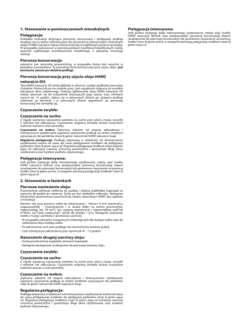 1. Stosowanie w pomieszczeniach mieszkalnych Pielęgnacja: Dokładka instrukcja dotycząca pierwszej konserwacji i pielęgnacji podłogi znajduje się na ulotce informacyjnej dla powierzchni pokrywanych naturalnym olejem HARO naturaLin, którą można otrzymać w najbliższym punkcie sprzedaży. W przypadku zastosowań w pomieszczeniach handlowych/publicznych należy poprosić najbliższego przedstawiciela handlowego o specjalną instrukcję obsługi. Pierwsza konserwacja: naturaLin jest naturalną powierzchnią, w przypadku której olej wysycha w kontakcie z powietrzem. Ta pierwotna forma konserwacji przy użyciu oleju jest konieczna zawsze po ułożeniu podłogi. Pierwsza konserwacja przy użyciu oleju HARO naturaLin Oil: Olej HARO naturaLin Oil wnika głęboko w drewno i nadaje podłodze pierwotny charakter. Powierzchnia ma otwarte pory i jest wyjątkowo odporna na wszelkie obciążenia dnia codziennego. Podczas aplikowania oleju HARO naturaLin Oil należy stosować się do wskazówek dotyczących jego użycia. Czas schnięcia wynosi ok. 12 godzin. Zaleca się w pierwszych dniach po ułożeniu podłogi traktować ją ostrożnie i w pierwszych dwóch tygodniach po pierwszej konserwacji nie namydlać jej. Czyszczenie zwykłe: Czyszczenie na sucho: Z reguły wystarcza czyszczenie parkietu na sucho przy użyciu mopa, szczotki z włosiem lub odkurzacza. Czyszczenie wilgotną szmatką można oczywiście wykonać zawsze w razie potrzeby. Czyszczenie na mokro: Zalecamy zależnie od stopnia zabrudzenia i intensywności użytkowania regularne czyszczenie podłogi na mokro środkiem czyszczącym do parkietów clean & green natural lub HARO naturaLin Soap Regularna pielęgnacja: Podłogę olejowaną w zależności od intensywności użytkowania można od czasu do czasu pielęgnować środkiem do pielęgnacji parkietów clean & green aqua oil. Regularna pielęgnacja środkiem clean & green aqua oil odświeża warstwę ochronną powierzchni i gwarantuje długi okres użytkowania oraz trwałość parkietu olejowanego. Pielęgnacja intensywna: Jeśli parkiet wykazuje ślady intensywnego użytkowania, należy użyć środka HARO naturaLin Refresh oraz przeprowadzić ponowną konserwację olejem (analogicznie do pierwszej konserwacji) lub gruntowne czyszczenie za pomocą środka clean & green active, a następnie pierwszą pielęgnację środkiem clean & green aqua oil. 2. Stosowanie w łazienkach Pierwsze naniesienie oleju: Powierzchnię szlifować szlifierką do podłóg i zieloną podkładką Superpad co najmniej 48 godzin po ułożeniu. Zaraz po tym dokładnie odkurzyć. Następnie dwukrotnie posmarować powierzchnię olejem naturalnym HARO Spa zgodnie z instrukcją. Nanieść olej przy pomocy wałka do lakierowania – Velours 4 mm (zawieraj¹cy rozpuszczalnik) – równomiernie i w duæej iloci na suchej powierzchni, rozprowadzię (ok. 50 ml/²), tzn. ustawię poprzecznie i rozprowadzaę wzd³uæ w³ókien wy³¹cznie przesuwaj¹c wa³ek do przodu i ty³u. Następnie przesunąć wałek o ¾ jego szerokości i powtórzyć czynność. -W przypadku obszarów brzegowych niedostępnych dla dużego wałka użyć do naniesienia oleju małego wałka. -Po zakończeniu tych prac podłoga ma równomierny matowy połysk. -Czas schnięcia po zakończeniu prac wynosi ok. 8 – -12 godzin. Nanoszenie drugiej warstwy oleju: -Suchą powierzchnię wygładzić zielonym Superpad. -Następnie postępować analogicznie do pierwszej warstwy oleju. Czyszczenie zwykłe: Czyszczenie na sucho: Z reguły wystarcza czyszczenie parkietu na sucho przy użyciu mopa, szczotki z włosiem lub odkurzacza. Czyszczenie wilgotną szmatką można oczywiście wykonać zawsze w razie potrzeby. Czyszczenie na mokro: Zalecamy zależnie od stopnia zabrudzenia i intensywności użytkowania regularne czyszczenie podłogi na mokro środkiem czyszczącym do parkietów clean & green natural lub HARO naturaLin Soap Regularna pielęgnacja: Podłogę olejowaną w zależności od intensywności użytkowania można od czasu do czasu pielęgnować środkiem do pielęgnacji parkietów clean & green aqua oil. Regularna pielęgnacja środkiem clean & green aqua oil odświeża warstwę ochronną powierzchni i gwarantuje długi okres użytkowania oraz trwałość parkietu olejowanego. Pielęgnacja intensywna: Jeśli parkiet wykazuje ślady intensywnego użytkowania, należy użyć środka HARO naturaLin Refresh oraz przeprowadzić ponowną konserwację olejem (analogicznie do pierwszej konserwacji) lub gruntowne czyszczenie za pomocą środka clean & green active, a następnie pierwszą pielęgnację środkiem clean & green aqua oil. Ogólne wskazówki Przed przystąpieniem do układania należy koniecznie dokładnie przeczytać całą instrukcję! Typ kleju Klej elastyczny Przechowywanie kleju: Przechowywać w suchym i chłodnym miejscu, klej nadaje się do użytku przez około 6 miesięcy. Czynności przed przystąpieniem do układania: Paczki można otwierać dopiero bezpośrednio przed przystąpieniem do układania. W miesiącach zimowych, panele w zamknietym, oryginalnym opakowaniu należy przystosować do temperaturu układania ok. 18°C. Paczki należy otwierać dopiero przed rozpoczęciem układania, a pozostałe klepki w przypadku dłuższych przerw w układaniu należy ponownie zapakować w folię. W nowych budynkach nie należy przechowywać wysuszonych i poddanych obróbce materiałów wysokiej jakości. Ważne: Przed przystąpieniem do układania parkietu sprawdzić elementy w świetle dziennym z uwagi na widoczne wady lub uszkodzenia oraz kolor i strukturę. Po ułożeniu roszczenia reklamacyjne tego typu są wykluczone. Kierunek układania: Kierunek układania jest najczęściej orientowany względem głównego źródła światła w pomieszczeniu, np. okno. Elementy należy układać wzdłużnie do kierunku padania światła. Proporcje pomieszczenia można podkreślić przez zręczny wybór kierunku układania. Małe pomieszczenia wydają si