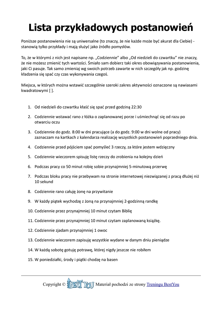 Lista przykładowych postanowień Poniższe postanowienia nie są uniwersalne (to znaczy, że nie każde może być akurat dla Ciebie) stanowią tylko przykłady i mają służyć jako źródło pomysłów. To, że w którymś z nich jest napisane np. „Codziennie” albo „Od niedzieli do czwartku” nie znaczy, że nie możesz zmienić tych wartości. Śmiało sam dobierz taki okres obowiązywania postanowienia, jaki Ci pasuje. Tak samo zmieniaj wg swoich potrzeb zawarte w nich szczegóły jak np. godzinę kładzenia się spać czy czas wykonywania czegoś. Miejsca, w których można wstawić szczególnie szeroki zakres aktywności oznaczone są nawiasami kwadratowymi [ ]. 1. Od niedzieli do czwartku kłaść się spać przed godziną 22:30 2. Codziennie wstawać rano z łóżka o zaplanowanej porze i uśmiechnąć się od razu po otwarciu oczu 3. Codziennie do godz. 8:00 w dni pracujące (a do godz. 9:00 w dni wolne od pracy) zaznaczam na kartkach z kalendarza realizację wszystkich postanowień poprzedniego dnia. 4. Codziennie przed pójściem spać pomyśleć 3 rzeczy, za które jestem wdzięczny 5. Codziennie wieczorem spisuję listę rzeczy do zrobienia na kolejny dzień 6. Podczas pracy co 50 minut robię sobie przynajmniej 5-minutową przerwę 7. Podczas bloku pracy nie przebywam na stronie internetowej niezwiązanej z pracą dłużej niż 10 sekund 8. Codziennie rano całuję żonę na przywitanie 9. W każdy piątek wychodzę z żoną na przynajmniej 2-godzinną randkę 10. Codziennie przez przynajmniej 10 minut czytam Biblię 11. Codziennie przez przynajmniej 10 minut czytam zaplanowaną książkę. 12. Codziennie zjadam przynajmniej 1 owoc 13. Codziennie wieczorem zapisuję wszystkie wydane w danym dniu pieniądze 14. W każdą sobotę gotuję potrawę, której nigdy jeszcze nie robiłem 15. W poniedziałki, środy i piątki chodzę na basen Copyright © Materiał pochodzi ze strony Treningu BestYou 16. We wtorki i soboty przez przynajmniej 10 minut [tutaj jakaś forma aktywności fizycznej np. biegam, spaceruję po lesie, wykonuję trening siłowy] 17. Realizuję zaplanowany harmonogram ćwiczeń (jeśli masz go rozpisanego na dni, to takie postanowienie wystarczy, bo to harmonogram treningu wyznacza w jakie dni ćwiczysz, a w jakie nie) 18. Codziennie modlę się przez przynajmniej 10 minut 19. Codziennie medytuję przez przynajmniej 10 minut 20. Codziennie wykonuję zaplanowaną liczbę 50-minutowych bloków pracy 21. W czwartek i piątek przez przynajmniej 30 minut uczę się [np. obcego języka, gry na instrumencie, szybkiego czytania, naukowo potwierdzonych metod rozwoju osobistego] 22. Codziennie od poniedziałku do piątku przez przynajmniej 30 minut pracuję nad [np. własnym biznesem, jakimś elementem biznesu, swoją edukacją, podnoszenie kwalifikacji, rozwojem osobistym] 23. Nie podnoszę na nikogo głosu 24. Poza żartami nie wypowiadam żadnego wulgaryzmu 25. Nie piję kawy, ani żadnego napoju z kofeiną po godz. 17:00 26. Po godz. 20:00 niczego nie jem 27. Nie oglądam żadnej pornografii 28. Poza imprezami okolicznościowymi nie piję alkoholu 29. Nie palę 30. Nie pracuję w niedzielę 31. Poza spotkaniami rodzinnymi i towarzyskimi nie jem żadnych słodyczy 32. Nie wchodzę na Facebooka przed godz. 18:00 33. Od poniedziałku do piątku nie oglądam telewizji dłużej niż 45 minut dziennie 34. Od poniedziałku do piątku nie gram w żadne gry elektroniczne więcej niż 45 minut dziennie 35. Nie dopuszczam by jakakolwiek kłótnia z partnerem życiowym trwała dłużej niż 15 minut (mam max 15 minut na pogodzenie się) 36. Nie robię [tutaj rzecz/nawyk/zwyczaj którego chcesz się pozbyć np. obgryzanie paznokci, krytykowanie innych] Copyright © Materiał pochodzi ze strony Treningu BestYou