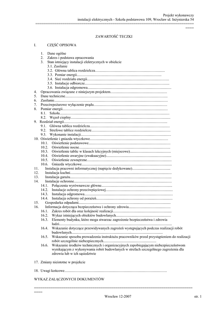Projekt wykonawczy instalacji elektrycznych - Szkoła podstawowa 109, Wrocław ul. Inżynierska 54 ============================================================================ ==== ZAWARTOŚĆ TECZKI I. CZĘŚĆ OPISOWA 1. 2. 3. Dane ogólne Zakres i podstawa opracowania Stan istniejący instalacji elektrycznych w obiekcie 3.1. Zasilanie 3.2. Główna tablica rozdzielcza........................................................................... 3.3. Pomiar energii........................................................................................... 3.4. Sieć rozdziału energii........................................................................................ 3.5. Instalacje odbiorcze........................................................................................... 3.6. Instalacja odgromowa.......................................................................................... 4. Opracowania związane z niniejszym projektem............................................................. 5. Dane techniczne.............................................................................................................. 6. Zasilanie.......................................................................................................................... 7. Przeciwpożarowe wyłączenie prądu............................................................................... 8. Pomiar energii................................................................................................................. 8.1. Szkoła...................................................................................................................... 8.2. Węzeł cieplny........................................................................................................... 9. Rozdział energii............................................................................................................... 9.1. Główna tablica rozdzielcza...................................................................................... 9.2. Strefowe tablice rozdzielcze..................................................................................... 9.3. Wykonanie instalacji................................................................................................. 10. Oświetlenie i gniazda wtyczkowe.................................................................................... 10.1. Oświetlenie podstawowe........................................................................................ 10.2. Oświetlenie nocne.................................................................................................. 10.3. Oświetlenie tablic w klasach lekcyjnych (miejscowe)............................................ 10.4. Oświetlenie awaryjne (ewakuacyjne)...................................................................... 10.5. Oświetlenie zewnętrzne........................................................................................... 10.6. Gniazda wtyczkowe................................................................................................. 11. Instalacja pracowni informatycznej (napięcie dedykowane)......................................... 12. Instalacja kuchni............................................................................................................. 13. Instalacja garażu............................................................................................................. 14. Instalacje ochronne......................................................................................................... 14.1. Połączenia wyrównawcze główne............................................................................ 14.2. Instalacje ochrony przeciwpięciowej........................................................................ 14.3. Instalacja odgromowa............................................................................................... 14.4. Instalacja ochrony od porażeń.................................................................................. 15. Gospodarka odpadami................................................................................................... 16. Informacja dotycząca bezpieczeństwa i ochrony zdrowia............................................. 16.1. Zakres robót dla oraz kolejność realizacji............................................................... 16.2. Wykaz istniejących obiektów budowlanych........................................................... 16.3. Elementy budynku, które moga stwarzac zagrożenie bezpieczeństwa i zdrowia ludzi......................................................................................................................... 16.4. Wskazanie dotyczące przewidywanych zagrożeń występujących podczas realizacji robót budowlanych.................................................................................................. 16.5. Wskazanie sposobu prowadzenia instruktażu pracowników przed przystąpieniem do realizacji robót szczególnie niebezpiecznych......................................................... 16.6. Wskazanie środków technicznych i organizacyjnych zapobiegającym niebezpieczeństwom wynikającym z wykonywania robót budowlanych w strefach szczególnego zagrożenia dla zdrowia lub w ich sąsiedztwie 17. Zmiany nieistotne w projekcie 18. Uwagi końcowe.............................................................................................................. WYKAZ ZAŁĄCZONYCH DOKUMENTÓW ============================================================================ ==== Wrocław 12-2007 str. 1 Projekt wykonawczy instalacji elektrycznych - Szkoła podstawowa 109, Wrocław ul. Inżynierska 54 ============================================================================ ==== A. Techniczne warunki przyłączenia do sieci EnergiaPro B. Notatka służbowa z dnia 11.10.2007 r. C. Notatka słuzbowa z dnia 04.12.2007 r. II. CZĘŚĆ RYSUNKOWA 1E 2E 3E 4