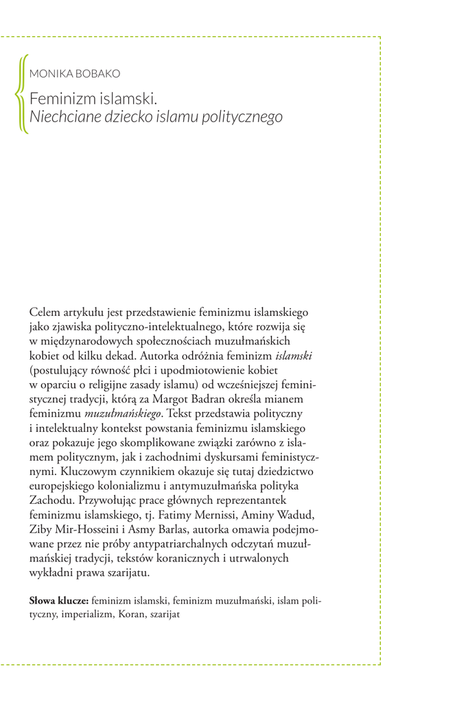 } Monika Bobako Feminizm islamski. Niechciane dziecko islamu politycznego Celem artykułu jest przedstawienie feminizmu islamskiego jako zjawiska polityczno-intelektualnego, które rozwija się w międzynarodowych społecznościach muzułmańskich kobiet od kilku dekad. Autorka odróżnia feminizm islamski (postulujący równość płci i upodmiotowienie kobiet w oparciu o religijne zasady islamu) od wcześniejszej feministycznej tradycji, którą za Margot Badran określa mianem feminizmu muzułmańskiego. Tekst przedstawia polityczny i intelektualny kontekst powstania feminizmu islamskiego oraz pokazuje jego skomplikowane związki zarówno z islamem politycznym, jak i zachodnimi dyskursami feministycznymi. Kluczowym czynnikiem okazuje się tutaj dziedzictwo europejskiego kolonializmu i antymuzułmańska polityka Zachodu. Przywołując prace głównych reprezentantek feminizmu islamskiego, tj. Fatimy Mernissi, Aminy Wadud, Ziby Mir-Hosseini i Asmy Barlas, autorka omawia podejmowane przez nie próby antypatriarchalnych odczytań muzułmańskiej tradycji, tekstów koranicznych i utrwalonych wykładni prawa szarijatu. Słowa klucze: feminizm islamski, feminizm muzułmański, islam polityczny, imperializm, Koran, szarijat anzpraktyka cyteroet 2(8)/2013 220 Ziba Mir-Hosseini określiła feminizm islamski – trafnie i prowokująco zarazem – jako „niechciane dziecko islamu politycznego”1. Jednak trudne relacje rodzinne łączą feminizm islamski nie tylko z islamem politycznym, ale także z szeroko rozumianą tradycją feministyczną. Widać to bardzo wyraźnie w nieustannym zmaganiu feministek islamskich z samym pojęciem „feminizmu”, z którym czasami, warunkowo i ostrożnie, potrafią się identyfikować, a które często z niechęcią odrzucają. Omawiając w poniższym tekście fenomen feminizmu islamskiego, chciałabym pokazać, iż dla kojarzonych z nim autorek jego problematyczność wynika przede wszystkim ze skomplikowania ich politycznego i intelektualnego usytuowania w postkolonialnej rzeczywistości społeczności muzułmańskich. Społeczności te, z jednej strony, poddane są neoimperialnej presji ze strony zachodnich mocarstw kształtujących swoje relacje ze światem muzułmańskim w kategoriach „konfliktu cywilizacji” i „wojny z terroryzmem”, z drugiej – stają się sceną odrodzenia religijnego, w którym islam w coraz większym stopniu definiuje tożsamości i relacje społeczne i polityczne. Ta sytuacja oznacza, że wiele muzułmańskich intelektualistek i działaczek staje wobec konieczności balansowania między patriarchalizmem muzułmańskich dyskursów religijnych a neokolonialnymi tendencjami zachodnich dyskursów feministycznych, które nierzadko współuczestniczą w kształtowaniu zachodniej polityki antymuzułmańskiej. Intelektualistki te funkcjonują zatem w swoistym politycznym i intelektualnym potrzasku, który sprawia, że nie mogą one swobodnie korzystać z dostępnych, wypracowanych głównie na Zachodzie języków krytycznego opisu rzeczywistości społecznej i sytuacji kobiet. Zaczynają zatem wykuwać własne kategorie, które wykraczają poza ramy pojęciowe organizujące dotychczasowe sposoby rozumienia religii, nowoczesności, emancypacji kobiet, muzułmańskiej tradycji, prawa i świętych tekstów. W tej sytuacji trzeba sobie uświadomić, że ważność feminizmu islamskiego daleko wykracza poza lokalny kontekst muzułmańskich społeczności i nie sprowadza się do bycia etnograficzną czy akademicką ciekawostką, interesującą dla zachodniego oka ze względu na imputowany jej charakter „oksymoronu”. Ważność ta nie sprowadza się także do miejsca feminizmu islamskiego w wewnętrznych dyskusjach prowadzonych na gruncie teorii i polityki feministycznej. Moja teza głosi, że fundamentalne znaczenie feminizmu islamskiego polega przede wszystkim na tym, że stanowi on próbę przełamania kolonialnego, orientalistycznego dyskursu, który poprzez operowanie binarnymi 1 Z. Mir-Hosseini, Beyond “Islam vs ‘Feminism”, “IDS Bulletin” 2011, vol. 42, no. 1, s. 71. Monika Bobako 221 anzpraktyka cyteroet 2(8)/2013 opozycjami, np. między tym, co cywilizowane i europejskie a tym, co zacofane i muzułmańskie, przyczynia się do inspirowania i legitymizowania antagonizmu między „Zachodem” a „światem islamu”. Jak będę chciała pokazać, feminizm islamski należy interpretować nie tylko jako interesującą bazę dla nowych form mobilizacji politycznej kobiet w społecznościach muzułmańskich, ale również jako szczególną interwencję w utrwalone, niefortunne sposoby rozumienia relacji między „Zachodem” i „Orientem”, między religią i feminizmem, między tradycją i nowoczesnością. Co najważniejsze jednak, jest to interwencja, która nie tylko wprowadza nowe sposoby myślenia w kontekstach muzułmańskich, ale także domaga się poważnej redefinicji kategorii określających dominujące formy kulturowych i politycznych tożsamości europejskich czy „zachodnich”. Feminizm islamski versus feminizmy muzułmańskie Feminizm islamski narodził się na przełomie lat osiemdziesiątych i dziewięćdziesiątych dwudziestego wieku, nie tyle jako oddolny ruch społeczny czy oficjalna polityka państwowa, ile jako dyskurs. Zapoczątkowany został przez działające w międzynarodowych instytucjach akademickich muzułmańskie intelektualistki, wśród których szczególne miejsce zajmują Marokanka Fatima Mernissi, Afroamerykanka Amina Wadud, Iranka Ziba Mir-Hosseini czy Pakistanka Asma Barlas. Ów międzynarodowy kontekst narodzin feminizmu islamskiego wart jest szczególnego podkreślenia. Wskazuje on bowiem na tworzenie się nowych form religijnych identyfikacji i religijnej wspólnotowości, a także religijnie motywowanego aktywizmu politycznego, które pojawiają się wraz z rozwojem nowych, globalnych form komunikacji oraz intensyfikującego się przepływu ludzi i powstawania nowych diasporyc
