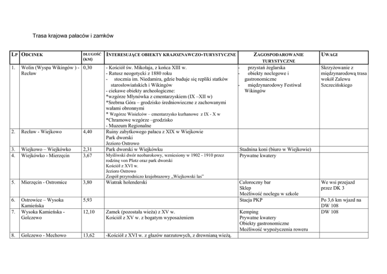 Trasa krajowa pałaców i zamków LP ODCINEK DŁUGOŚĆ (KM) INTERESUJĄCE OBIEKTY KRAJOZNAWCZO-TURYSTYCZNE Wolin (Wyspa Wikingów ) - 0,30 Recław 2. Recław - Wiejkowo 4,40 3. 4. Wiejkowo – Wiejkówko Wiejkówko - Mierzęcin 2,31 3,67 5. Mierzęcin - Ostromice 3,80 6. Ostrowice – Wysoka Kamieńska Wysoka Kamieńska Golczewo 5,93 12,10 Zamek (pozostała wieża) z XV w. Kościól z XV w. z bogatym wyposażeniem Golczewo - Mechowo 13,62 -Kościół z XVI w. z głazów narzutowych, z drewnianą wieżą. 8. UWAGI TURYSTYCZNE - Kościół św. Mikołaja, z końca XIII w. - Ratusz neogotycki z 1880 roku - stocznia im. Niedamira, gdzie buduje się repliki statków starosłowiańskich i Wikingów - ciekawe obiekty archeologiczne: *wzgórze Młynówka z cmentarzyskiem (IX –XII w) *Srebrna Góra – grodzisko średniowieczne z zachowanymi wałami obronnymi * Wzgórze Wisielców – cmentarzysko kurhanowe z IX - X w *Chramowe wzgórze –grodzisko - Muzeum Regionalne Ruiny zabytkowego pałacu z XIX w Wiejkowie Park dworski Jezioro Ostrowo Park dworski w Wiejkówku 1. 7. ZAGOSPODAROWANIE Myśliwski dwór neobarokowy, wzniesiony w 1902 - 1910 przez rodzinę von Plotz oraz park dworski Kościół z XVI w. Jezioro Ostrowo Zespół przyrodniczo krajobrazowy „Wiejkowski las” Wiatrak holenderski przystań żeglarska obiekty noclegowe i gastronomiczne międzynarodowy Festiwal Wikingów - Skrzyżowanie z międzynarodową trasa wokół Zalewu Szczecińskiego Stadnina koni (biuro w Wiejkowie) Prywatne kwatery Całoroczny bar Sklep Możliwość noclegu w szkole Stacja PKP Kemping Prywatne kwatery Obiekty gastronomiczne Możliwość wypożyczenia roweru We wsi przejazd przez DK 3 Po 3,6 km wjazd na DW 108 DW 108 9. Mechowo - Płoty 10. Płoty - Resko 8,65 11,90 -Dwór z XIX w. Przed Płotami rezerwat przyrody „Wrzosowisko Sowno - Stary Zamek z początku XIII w. Przebudowany w okresie Renesansu, cenne wyposażenie (obecne archiwum - Nowy Zamek renesansowy z XVII w. [przebudowany w XIX w. Z zabudowaniami gospodarczymi - zabytkowy budynek poczty - Park przy zamku - Park Miejski -Zabytki Reska *zamek (ruina) z XV w. *kościół Niepokalanego Poczęcia NMP z XV w. - kwatery prywatne punkty gastronomiczne zawody wędkarskie na Redze spływy kajakowe po Redze gminny punkt informacji turystycznej - baza gastronomiczna stanowiska wędkarskie wypożyczalnia kajaków *willa przy ul. Wojska Polskiego 4 *Stare Miasto *sąd (ob. poczta) przy ul. Wojska Polskiego 8 11. Resko – Starogard Łobeski 10,95 - 12. Starogard Łobeski Oparzno 13. Oparzno - Świdwin 12, 52 6,23 14. Świdwin - Krzecko 14,70 15. Krzecko - Podwilcze 7,70 16. Podwilcze - Zagórze 4,85 kościół filialny z 1729 r., zabytkowy park dworski z 1870 r. - Zabytki Świdwina *zamek z XIII w . przebudowany w 1384 przez Krzyżaków *kościół gotycki z 1338 r. *gotycka Brama Kamienna z 1475 r. *średniowieczny układ urbanistyczny *fragment kamiennego muru obronnego z XIVw. *cmentarz żydowski *park miejski - Pałac z parkiem dworskim z pol. XIX w. - kościół ryglowy z XVII w - Kościół filialny z XV w. - Pałac - Park dworski z cmentarzem rodowym - Pałac z XIX w z parkiem Dolina Regi Kościół Pałac (ruina ) z XVIII w. z parkiem dworskim - - - Baza noclegowa i gastronomiczna - Przebieg po zamkniętej linii kolejowej 17. Zagórze - Nasutowo 1,74 - 18. Nasutowo- Kamosowo 2,40 19. Kamosowo - Białogard 7,66 - 20. Białogard - Nosowo 13,10 21. Nosowo - Strzekęcin 15,70 Założenie pałacowe z XIX w. Park dworski Kościół gotycki z 1310 r pw. Narodzenia NMP. z cennym wyposarzeniem - Gotycki kościół p.w. św. Jerzego z XIVw. przebudowany - Brama Wysoka (Połczyńska), gotycka (XIV/XV w.) - Pozostałość murów miejskich - Neoklasycystyczny Ratusz Nowy (1847r.) - Dwór zw. Zamkiem - hala fabryczna o oryginalnej konstrukcji drewniano-szachulcowej zapewne z II połowy XVIII w. lub z przełomu XVIII i XIX w - kamienice z XIX – XX w. - Park miejski – pomnikowa aleja 12 dębów (400-600 l.) - Pałac XIXw.. z 16- hektarowym parkiem - Dolina Radwi W odległym 3,5 kilometra Parsowie pałac barokowy z XVIII w. - 22. Strzekęcin – Niedalino elektrownia 6,55 23. Niedalino - Rosnowo 6,40 - - 24. Rosnowo - Kopanino 6,55 25. Kopanino - Darżewo 1,55 Zespól willowo – parkowy z XIX w. - malownicza dolina Radwi eklektyczny Pałac Bursztynowy z 1899-1901 r. z 8-boczną wieżą, park krajobrazowy z poł XIXw. Biały Pałac – dwór neoklasycystyczny z 1935 r., obrośnięty kolcowojem1, park krajobrazowy z XVIII/XIX w. park dworski młyn wodny i elektrownia wodna na Narwi zaporowe jezioro Hajka na Radwi zespól folwarczny w Rosnowie z przełomu XIX i XX w., składający się z budynku mieszkalnego zarządcy, gorzelni i budynków gospodarczych zespół hydrotechniczny na rzece Radew w Lisowie, zbudowany w latach 1910-24, złożony z budynku elektrowni wodnej, śluzy o wys. 17 m i kanału o długości 2,8 km. zaporowe jezioro Rosnowskie Obszar chronionego krajobrazu neogotycki pałac myśliwski z połowy XIX w. z parkiem leśnym obszar chronionego krajobrazu park dworski - - Przebieg po zamkniętej linii kolejowej po zamkniętej linii kolejowej Baza noclegowa i gastronomiczna Przebieg po Szlaki rowerowe lokalne zamkniętej linii Szlak kajakowy kolejowej W pałacu ośrodek szkoleniowy, polecający usługi hotelowe i gastronomiczne; - W pałacach hotele - Przyrodnicza ścieżka edukacujna - kwatery prywatne ośrodek wypoczynkowy - Baza noclegowa i gastronomiczna - Szlaki piesze i rowerowe - Aeroklub (skoki spadachronowe) - 26. Darżewo - Dargiń 27. Dargiń – Kłanino 28. Kłanino - Cybulino 2,75 5,80 - dwór I ćw. XIXw. z parkiem dworskim - 10,30 - Kościół zbudowany w XVII w. jako ryglowy później przebudowany (XX w.) Park dworski pałac rodowy (dwór) z I połowy XIX wieku (obecnie remontowany) wraz z parkiem naturalistycznym kaplica grobowa z 1662 r. o konstrukcji ryglowej budynek magazynu o konstrukcji ryglowej stroma krawędź pradoliny Radwi j
