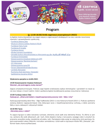 Program [g. 12.00-18.00] Strefa organizacji pozarządowych (NGO) tu będzie można dowiedzieć się czegoś więcej o organizacjach działających na rzecz szeroko rozumianej równości i sprawiedliwości społecznej. - Fundacja Jedyna Taka - Muzeum Historii Żydów Polskich POLIN - Fundacja Trans-Fuzja - Fundacja eF kropka - Fundacja Zaczyn - Afryka Connect Foundation - Ośrodek Kultury Muzułmańskiej w Warszawie وارسو- مركز الثقافة السلمية - Fundacja Feminoteka - Stowarzyszenie Inicjatyw Kobiecych OPP - Stowarzyszenie "Bardziej Kochani" - JCC Warszawa - Stowarzyszenie Jump'93 - Forum Odpowiedzialnego Biznesu - Lambda Warszawa - Ruchomy Klub Sportowy "Gwiazda" - Spółdzielnia Socjalna WOLA Wydarzenia specjalne w strefie NGO: 14:00 Stowarzyszenie Inicjatyw Kobiecych Warsztat „Jak postrzegamy osoby starsze?” Zajęcia antydyskryminacyjne. Podczas zajęć będzie analizowany wpływ stereotypów i uprzedzeń na nasze życie oraz relacje z innymi ludźmi. Celem spotkania będzie kształtowanie postaw zrozumienia i tolerancji. 15:00 Fundacja Jedyna Taka Dyskusja pn. „Wizerunek kobiet z niepełnosprawnością wczoraj i dziś – fakty i mity” Dyskusję poprowadzą dwie Miss - Olga Fijałkowska (2013 r.) oraz Katarzyna Kozioł (2015 r.). Podczas spotkania zostaną obalone najpopularniejsze mity dotyczące życia z niepełnosprawnością ruchową, a także poznamy fakty o życiu ciekawych i aktywnych kobiet. 16:30 RKS Tęcza „Warsztaty pracy z ciałem” To zajęcia łączące w sobie ćwiczenia ruchowe, elementy sztuk walk oraz elementy fitness. To oferta w sam raz, zarówno dla osób aktywnych, jak i tych, które dopiero myślą o rozruszaniu swojego ciała (i umysłu)! Zapraszamy wszystkie osoby, niezależnie od wieku i płci. Pamiętajcie żeby wziąć ze sobą luźny strój sportowy. Zajęcia poprowadzi Łukasz Wójcicki, instruktor samoobrony i sztuk walk w tęczowym klubie RKS „Gwiazda”, performer teatru Komuna/Warszawa. [g. 12.00-17.00] Żywa Biblioteka To szansa poznania i porozmawiania z przedstawicielami i przedstawicielkami różnych grup społecznych: Syryjka, osoba poliamoryczna, gej,osoba biseksualna, matka osoby transpłciowej, żydówka, feministka, wegańska para, osoba z doświadczeniem choroby psychicznej, osoba zakażona HIV, osoba z niepełnosprawnością ruchu, były więzień, ateistka, osoba starsza, skłoters [g. 12.00-18.00] Cykl sześciu wydarzeń edukacyjnych na terenie Muzeum POLIN 12.00-13.00 Stowarzyszenie Nigdy Więcej Dyskusja z elementem warsztatu pn. „Uprzedzenia, nietolerancja, nienawiść. Skąd się biorą? Czy potrafimy je zrozumieć?” Większość z nas, z różnych względów spotkała się w swoim życiu z przejawami nienawiści. Czy nasze doświadczenia związane z nienawiścią są takimi, które chcemy szybko wymazać z pamięci? Czy może nosimy je w sobie pielęgnując lęki i urazy. Czy zastanawialiśmy się kiedyś, co kieruje agresorami, dlaczego atakują bez powodu? O tym i innych ciekawych zagadnieniach porozmawiamy podczas spotkania. 13.00-14.00 Stowarzyszenie JUMP’93 Warsztat pn. "Kakofonia" - mający na celu umożliwienie uczestnikom wczucie się w sytuację osoby zażywającej narkotyki jednocześnie pokazując jak powinna wyglądać interwencja wobec takiej osoby. 14.00-15.00 UNHCR Urząd Wysokiego Komisarza Narodów Zjednoczonych do spraw Uchodźców Kryzys migracyjny w Europie. Czy na pewno „migracyjny” i czy w ogóle „kryzys”? Rozmowa o uchodźcach. Prezentacja plus dyskusja na temat kryzysu migracyjnego w Europie. 15.00-16.00 Fundacja Afryka Connect Afryka Connect pokaże jak ze zwykłych rzeczy można zrobić niezwykłe zabawki. 16.00-17.00 Stowarzyszenie Inicjatyw Kobiecych Czy możliwe jest porozumienie międzypokoleniowe? Warsztaty dla seniorek/seniorów oraz młodzieży dotyczące zagadnień dyskryminacji i tolerancji. Uczestnicy będą dyskutować na temat asertywności oraz zastanawiać się jak twórczo rozwiązywać konflikty międzypokoleniowe. 17.00-18.00 Centrum Społeczności Żydowskiej JCC Warszawa Warsztaty "Żydzi w dzisiejszej Warszawie - dyskusje o poszukiwaniu tożsamości". Zastanowimy się nad tym kim jest dzisiaj warszawski Żyd/Żydówka, z jakimi dylematami mierzy się nasza społeczność, co buduje naszą tożsamość i jak żyć bez jednoznacznej odpowiedzi na te pytania. [g. 18.30-20.00] Koncerty chóru Voces Gaudiae, Anety Anton i formacji Back to the Ocean. WSTĘP WOLNY * Wydarzenia edukacyjne odbędą się w przestrzeni Muzeum POLIN