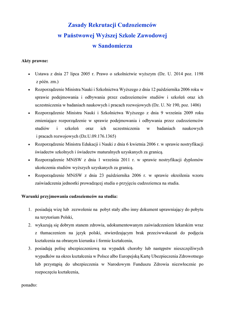 Zasady Rekrutacji Cudzoziemców w Państwowej Wyższej Szkole Zawodowej w Sandomierzu Akty prawne: Ustawa z dnia 27 lipca 2005 r. Prawo o szkolnictwie wyższym (Dz. U. 2014 poz. 1198 z późn. zm.) Rozporządzenie Ministra Nauki i Szkolnictwa Wyższego z dnia 12 października 2006 roku w sprawie podejmowania i odbywania przez cudzoziemców studiów i szkoleń oraz ich uczestniczenia w badaniach naukowych i pracach rozwojowych (Dz. U. Nr 190, poz. 1406) Rozporządzenie Ministra Nauki i Szkolnictwa Wyższego z dnia 9 września 2009 roku zmieniające rozporządzenie w sprawie podejmowania i odbywania przez cudzoziemców studiów i szkoleń oraz ich uczestniczenia w badaniach naukowych i pracach rozwojowych (Dz.U.09.176.1365) Rozporządzenie Ministra Edukacji i Nauki z dnia 6 kwietnia 2006 r. w sprawie nostryfikacji świadectw szkolnych i świadectw maturalnych uzyskanych za granicą. Rozporządzenie MNiSW z dnia 1 września 2011 r. w sprawie nostryfikacji dyplomów ukończenia studiów wyższych uzyskanych za granicą. Rozporządzenie MNiSW z dnia 23 października 2006 r. w sprawie określenia wzoru zaświadczenia jednostki prowadzącej studia o przyjęciu cudzoziemca na studia. Warunki przyjmowania cudzoziemców na studia: 1. posiadają wizę lub zezwolenie na pobyt stały albo inny dokument uprawniający do pobytu na terytorium Polski, 2. wykazują się dobrym stanem zdrowia, udokumentowanym zaświadczeniem lekarskim wraz z tłumaczeniem na język polski, stwierdzającym brak przeciwwskazań do podjęcia kształcenia na obranym kierunku i formie kształcenia, 3. posiadają polisę ubezpieczeniową na wypadek choroby lub następstw nieszczęśliwych wypadków na okres kształcenia w Polsce albo Europejską Kartę Ubezpieczenia Zdrowotnego lub przystąpią do ubezpieczenia w Narodowym Funduszu Zdrowia niezwłocznie po rozpoczęciu kształcenia, ponadto: ukończą roczny kurs przygotowawczy do podjęcia nauki w języku polskim w jednostkach wyznaczonych przez ministra do spraw szkolnictwa wyższego, lub posiadają certyfikat znajomości języka polskiego wydany przez Państwową Komisję Poświadczania Znajomości Języka Polskiego jako Obcego, lub uzyskają potwierdzenie uczelni przyjmującej na studia, że ich przygotowanie oraz stopień znajomości języka polskiego pozwalają na podjęcie studiów w języku polskim. Cudzoziemcy, którzy podejmują i odbywają kształcenie oraz uczestniczą w badaniach naukowych i pracach rozwojowych, na zasadach obowiązujących obywateli polskich: 1. Cudzoziemcy, którym udzielono zezwolenia na pobyt stały. 2. Cudzoziemcy posiadający status uchodźcy nadany w RP. 3. Cudzoziemcy korzystający z ochrony czasowej na terytorium RP. 4. Pracownicy migrujący, będący obywatelami państwa członkowskiego UE lub państwa członkowskiego EFTA /Europejskiego Porozumienia o Wolnym Handlu/ - strony umowy o Europejskim Obszarze Gospodarczym, a także członkowie ich rodzin, jeżeli są lub byli zatrudnieni w Polsce, a także członkowie ich rodzin, jeżeli mieszkają na terytorium RP. 5. Cudzoziemcy którym na terytorium RP udzielono zezwolenia na pobyt rezydenta długoterminowego Wspólnot Europejskich. 6. Cudzoziemcy, którym na terytorium RP udzielono zezwolenia na zamieszkanie na czas oznaczony w związku z okolicznością, o której mowa w art. 53 ust. 1 pkt 7, 13 i 14 ustawy z dnia 13 czerwca 2003 roku o cudzoziemcach. 7. Cudzoziemcy, którym udzielono ochrony uzupełniającej na terytorium RP. 8. Obywatele państw członkowskich UE, państw członkowskich EFTA /Europejskiego Porozumienia o Wolnym Handlu/ - strony umowy o Europejskim Obszarze Gospodarczym lub Konfederacji Szwajcarskiej i członkowie ich rodzin, posiadający prawo stałego pobytu. Cudzoziemcy, którzy podejmują i odbywają kształcenie oraz uczestniczą w badaniach naukowych i pracach rozwojowych, na zasadach innych niż obowiązujące obywateli polskich, tj. na podstawie: 1. Umów międzynarodowych - na zasadach określonych w tych umowach. 2. Umów zawieranych z podmiotami zagranicznymi przez uczelnie, na zasadach określonych w tych umowach. 3. Decyzji ministra właściwego do spraw szkolnictwa wyższego. 4. Decyzji Rektora uczelni. jako: 1. Na zasadach odpłatności. 2. Stypendyści strony polskiej. 3. Bez odpłatności i świadczeń stypendialnych. 4. Stypendyści strony wysyłającej, bez ponoszenia opłat za naukę. 5. Stypendyści uczelni. Na pierwszy rok studiów mogą być przyjęci cudzoziemcy z pominięciem zasad rekrutacji, którzy: legitymują się zalegalizowanym lub opatrzonym apostille świadectwem lub innym dokumentem uzyskanym za granicą, uprawniającym do ubiegania się o przyjęcie na studia w uczelniach każdego typu w państwie, w którego systemie działała instytucja wydająca świadectwo, uznanym za równoważny odpowiedniemu polskiemu świadectwu dojrzałości zgodnie z przepisami w sprawie nostryfikacji świadectw szkolnych i świadectw maturalnych uzyskanych za granicą, albo uznanym, lub na podstawie umowy międzynarodowej, za równoważny odpowiedniemu polskiemu świadectwu dojrzałości lub za uprawniający do podjęcia takich studiów w Rzeczpospolitej Polskiej (informacje w sprawie nostryfikacji – Kuratorium Oświaty w Warszawie www.kuratorium.waw.pl w zakładce PORADNIK KLIJENTA, INNE SPRAWY, NOSTRYFIKACJA /tel. 22 5512400/). wykażą wymagane w uczelni przyjmującej szczególne predyspozycje do podjęcia studiów na kierunkach wymagających takich predyspozycji. W przypadku gdy świadectwa, dyplomy albo inne dokumenty uzyskane za granicą podlegają uznaniu w trybie nostryfikacji, cudzoziemiec jest zobowiązany przedstawić zaświadczenie stwierdzające równorzędność z odpowiednim polskim świadectwem dojrzałości. Wymagane dokumenty: 1. Wypełniony przez kandydata kwestionariusz osobowy. 2. Podanie do Rektora PWSZ w Sandomierzu w przypadku osób ubiegających się o przyjęcie z pominięciem zasad rekrutacji, na zasadach innych niż obowiązują