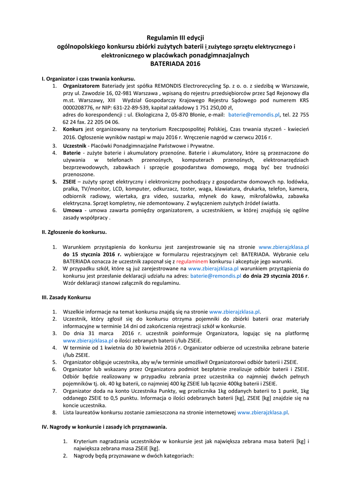 Regulamin III edycji ogólnopolskiego konkursu zbiórki zużytych baterii i zużytego sprzętu elektrycznego i elektronicznego w placówkach ponadgimnazjalnych BATERIADA 2016 I. Organizator i czas trwania konkursu. 1. Organizatorem Bateriady jest spółka REMONDIS Electrorecycling Sp. z o. o. z siedzibą w Warszawie, przy ul. Zawodzie 16, 02-981 Warszawa , wpisaną do rejestru przedsiębiorców przez Sąd Rejonowy dla m.st. Warszawy, XIII Wydział Gospodarczy Krajowego Rejestru Sądowego pod numerem KRS 0000208776, nr NIP: 631-22-89-539, kapitał zakładowy 1 751 250,00 zł, adres do korespondencji : ul. Ekologiczna 2, 05-870 Błonie, e-mail: [email protected], tel. 22 755 62 24 fax. 22 205 04 06. 2. Konkurs jest organizowany na terytorium Rzeczpospolitej Polskiej, Czas trwania styczeń - kwiecień 2016. Ogłoszenie wyników nastąpi w maju 2016 r. Wręczenie nagród w czerwcu 2016 r. 3. Uczestnik - Placówki Ponadgimnazjalne Państwowe i Prywatne. 4. Baterie - zużyte baterie i akumulatory przenośne. Baterie i akumulatory, które są przeznaczone do używania w telefonach przenośnych, komputerach przenośnych, elektronarzędziach bezprzewodowych, zabawkach i sprzęcie gospodarstwa domowego, mogą być bez trudności przenoszone. 5. ZSEIE – zużyty sprzęt elektryczny i elektroniczny pochodzący z gospodarstw domowych np. lodówka, pralka, TV/monitor, LCD, komputer, odkurzacz, toster, waga, klawiatura, drukarka, telefon, kamera, odbiornik radiowy, wiertaka, gra video, suszarka, młynek do kawy, mikrofalówka, zabawka elektryczna. Sprzęt kompletny, nie zdemontowany. Z wyłączeniem zużytych źródeł światła. 6. Umowa - umowa zawarta pomiędzy organizatorem, a uczestnikiem, w której znajdują się ogólne zasady współpracy . II. Zgłoszenie do konkursu. 1. Warunkiem przystąpienia do konkursu jest zarejestrowanie się na stronie www.zbierajzklasa.pl do 15 stycznia 2016 r. wybierające w formularzu rejestracyjnym cel: BATERIADA. Wybranie celu BATERIADA oznacza że uczestnik zapoznał się z regulaminem konkursu i akceptuje jego warunki. 2. W przypadku szkół, które są już zarejestrowane na www.zbierajzklasa.pl warunkiem przystąpienia do konkursu jest przesłanie deklaracji udziału na adres: [email protected] do dnia 29 stycznia 2016 r. Wzór deklaracji stanowi załącznik do regulaminu. III. Zasady Konkursu 1. 2. 3. 4. 5. 6. 7. 8. Wszelkie informacje na temat konkursu znajdą się na stronie www.zbierajzklasa.pl. Uczestnik, który zgłosił się do konkursu otrzyma pojemniki do zbiórki baterii oraz materiały informacyjne w terminie 14 dni od zakończenia rejestracji szkół w konkursie. Do dnia 31 marca 2016 r. uczestnik poinformuje Organizatora, logując się na platformę www.zbierajzklasa.pl o ilości zebranych baterii i/lub ZSEiE. W terminie od 1 kwietnia do 30 kwietnia 2016 r. Organizator odbierze od uczestnika zebrane baterie i/lub ZSEIE. Organizator obliguje uczestnika, aby w/w terminie umożliwił Organizatorowi odbiór baterii i ZSEIE. Organizator lub wskazany przez Organizatora podmiot bezpłatnie zrealizuje odbiór baterii i ZSEIE. Odbiór będzie realizowany w przypadku zebrania przez uczestnika co najmniej dwóch pełnych pojemników tj. ok. 40 kg baterii, co najmniej 400 kg ZSEIE lub łącznie 400kg baterii i ZSEIE. Organizator doda na konto Uczestnika Punkty, wg przelicznika 1kg oddanych baterii to 1 punkt, 1kg oddanego ZSEIE to 0,5 punktu. Informacja o ilości odebranych baterii [kg], ZSEIE [kg] znajdzie się na koncie uczestnika. Lista laureatów konkursu zostanie zamieszczona na stronie internetowej www.zbierajzklasa.pl. IV. Nagrody w konkursie i zasady ich przyznawania. 1. 2. Kryterium nagradzania uczestników w konkursie jest jak największa zebrana masa baterii [kg] i największa zebrana masa ZSEiE [kg]. Nagrody będą przyznawane w dwóch kategoriach: - lider zbiórki baterii, - lider zbiórki sprzętu. 3. Ogłoszenie wyników oraz przekazanie nagród w konkursie odbędzie się podczas finału XXXI edycji Olimpiady Wiedzy Ekologicznej w czerwcu 2016 r. 4. W konkursie zostaną przyznane następujące nagrody: Kategoria lider zbiórki baterii I miejsce - LAPTOP Lenovo II miejsce - LAPTOP Lenovo III miejsce - PROJEKTOR Sony lub Benq Kategoria lider zbiórki sprzętu I miejsce - LAPTOP Lenovo II miejsce - LAPTOP Lenovo III miejsce - PROJEKTOR Sony lub Benq Nagrody indywidualne Nagroda dla koordynatora szkoły, która zajęła I miejsce w kategorii lider zbiórki baterii - TABLET Lenovo Nagroda dla koordynatora szkoły, która zajęła I miejsce w kategorii lider zbiórki sprzętu - TABLET Lenovo V. Przetwarzanie danych osobowych uczestników. 1. Dane uczestników przetwarza się zgodnie z ustawą z dnia 29 sierpnia 1997 r. o ochronie danych osobowych (Dz. U. Nr 101, poz. 926 z późn. zm.) – w zakresie niezbędnym do przeprowadzenia konkursu. 2. Administratorem danych udostępnianych przez uczestników konkursu jest REMONDIS Electrorecycling sp. z o.o. z siedzibą w Warszawie przy ul. Zawodzie 16, 02-981 Warszawa. 3. Uczestnik wyraża zgodę na gromadzenie i przetwarzanie przez Organizatora w celach operacyjnych i marketingowych konkursu, swoich danych osobowych. Wyrażenie zgody na przetwarzanie danych w zakresie niezbędnym do realizacji konkursu jest warunkiem przystąpienia do konkursu. VI. Reklamacje. 1. Reklamacje odnoszące się do przebiegu konkursu mogą być zgłaszane Organizatorowi wyłącznie w formie pisemnej na adres korespondencyjny. 2. Prawo złożenia reklamacji przysługuje jedynie uczestnikom. 3. Pisemna reklamacja powinna zawierać dane i dokładny adres uczestnika, jak również dokładny opis i wskazanie przyczyn reklamacji. 4. Reklamacje rozpatrywane są przez Organizatora w terminie 21 dni od daty doręczenia pisma Organizatorowi. 5. Organizator rozpatrywać będzie reklamacje na podstawie niniejszego regulaminu. 6. Decyzja Organizatora o przedmiocie reklamacji jest ostateczna i wiążąca. Uczestnik projektu zostanie poinform