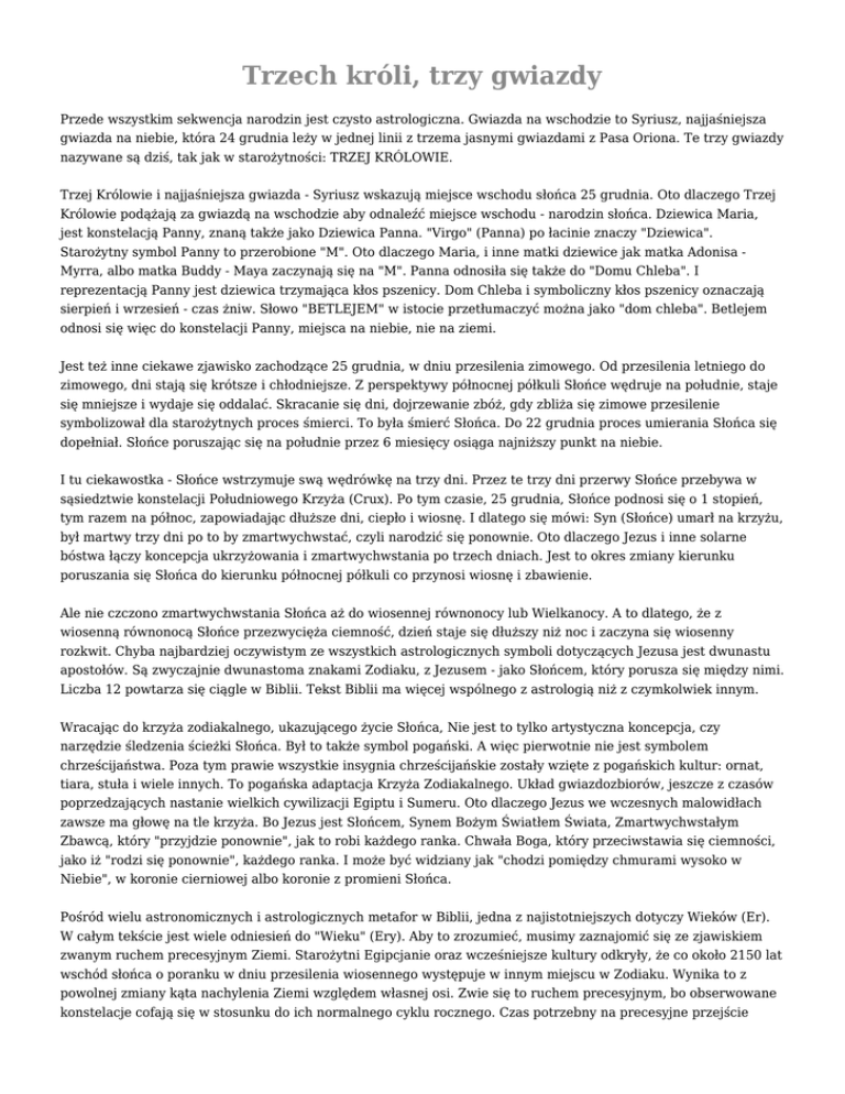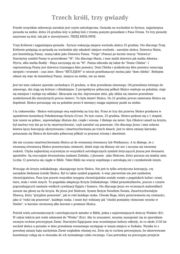 Trzech króli, trzy gwiazdy Przede wszystkim sekwencja narodzin jest czysto astrologiczna. Gwiazda na wschodzie to Syriusz, najjaśniejsza gwiazda na niebie, która 24 grudnia leży w jednej linii z trzema jasnymi gwiazdami z Pasa Oriona. Te trzy gwiazdy nazywane są dziś, tak jak w starożytności: TRZEJ KRÓLOWIE. Trzej Królowie i najjaśniejsza gwiazda - Syriusz wskazują miejsce wschodu słońca 25 grudnia. Oto dlaczego Trzej Królowie podążają za gwiazdą na wschodzie aby odnaleźć miejsce wschodu - narodzin słońca. Dziewica Maria, jest konstelacją Panny, znaną także jako Dziewica Panna. "Virgo" (Panna) po łacinie znaczy "Dziewica". Starożytny symbol Panny to przerobione "M". Oto dlaczego Maria, i inne matki dziewice jak matka Adonisa Myrra, albo matka Buddy - Maya zaczynają się na "M". Panna odnosiła się także do "Domu Chleba". I reprezentacją Panny jest dziewica trzymająca kłos pszenicy. Dom Chleba i symboliczny kłos pszenicy oznaczają sierpień i wrzesień - czas żniw. Słowo "BETLEJEM" w istocie przetłumaczyć można jako "dom chleba". Betlejem odnosi się więc do konstelacji Panny, miejsca na niebie, nie na ziemi. Jest też inne ciekawe zjawisko zachodzące 25 grudnia, w dniu przesilenia zimowego. Od przesilenia letniego do zimowego, dni stają się krótsze i chłodniejsze. Z perspektywy północnej półkuli Słońce wędruje na południe, staje się mniejsze i wydaje się oddalać. Skracanie się dni, dojrzewanie zbóż, gdy zbliża się zimowe przesilenie symbolizował dla starożytnych proces śmierci. To była śmierć Słońca. Do 22 grudnia proces umierania Słońca się dopełniał. Słońce poruszając się na południe przez 6 miesięcy osiąga najniższy punkt na niebie. I tu ciekawostka - Słońce wstrzymuje swą wędrówkę na trzy dni. Przez te trzy dni przerwy Słońce przebywa w sąsiedztwie konstelacji Południowego Krzyża (Crux). Po tym czasie, 25 grudnia, Słońce podnosi się o 1 stopień, tym razem na północ, zapowiadając dłuższe dni, ciepło i wiosnę. I dlatego się mówi: Syn (Słońce) umarł na krzyżu, był martwy trzy dni po to by zmartwychwstać, czyli narodzić się ponownie. Oto dlaczego Jezus i inne solarne bóstwa łączy koncepcja ukrzyżowania i zmartwychwstania po trzech dniach. Jest to okres zmiany kierunku poruszania się Słońca do kierunku północnej półkuli co przynosi wiosnę i zbawienie. Ale nie czczono zmartwychwstania Słońca aż do wiosennej równonocy lub Wielkanocy. A to dlatego, że z wiosenną równonocą Słońce przezwycięża ciemność, dzień staje się dłuższy niż noc i zaczyna się wiosenny rozkwit. Chyba najbardziej oczywistym ze wszystkich astrologicznych symboli dotyczących Jezusa jest dwunastu apostołów. Są zwyczajnie dwunastoma znakami Zodiaku, z Jezusem - jako Słońcem, który porusza się między nimi. Liczba 12 powtarza się ciągle w Biblii. Tekst Biblii ma więcej wspólnego z astrologią niż z czymkolwiek innym. Wracając do krzyża zodiakalnego, ukazującego życie Słońca, Nie jest to tylko artystyczna koncepcja, czy narzędzie śledzenia ścieżki Słońca. Był to także symbol pogański. A więc pierwotnie nie jest symbolem chrześcijaństwa. Poza tym prawie wszystkie insygnia chrześcijańskie zostały wzięte z pogańskich kultur: ornat, tiara, stuła i wiele innych. To pogańska adaptacja Krzyża Zodiakalnego. Układ gwiazdozbiorów, jeszcze z czasów poprzedzających nastanie wielkich cywilizacji Egiptu i Sumeru. Oto dlaczego Jezus we wczesnych malowidłach zawsze ma głowę na tle krzyża. Bo Jezus jest Słońcem, Synem Bożym Światłem Świata, Zmartwychwstałym Zbawcą, który "przyjdzie ponownie", jak to robi każdego ranka. Chwała Boga, który przeciwstawia się ciemności, jako iż "rodzi się ponownie", każdego ranka. I może być widziany jak "chodzi pomiędzy chmurami wysoko w Niebie", w koronie cierniowej albo koronie z promieni Słońca. Pośród wielu astronomicznych i astrologicznych metafor w Biblii, jedna z najistotniejszych dotyczy Wieków (Er). W całym tekście jest wiele odniesień do "Wieku" (Ery). Aby to zrozumieć, musimy zaznajomić się ze zjawiskiem zwanym ruchem precesyjnym Ziemi. Starożytni Egipcjanie oraz wcześniejsze kultury odkryły, że co około 2150 lat wschód słońca o poranku w dniu przesilenia wiosennego występuje w innym miejscu w Zodiaku. Wynika to z powolnej zmiany kąta nachylenia Ziemi względem własnej osi. Zwie się to ruchem precesyjnym, bo obserwowane konstelacje cofają się w stosunku do ich normalnego cyklu rocznego. Czas potrzebny na precesyjne przejście poprzez wszystkie 12 znaków wynosi 25 765 lat. Jest to tak zwany "Wielki Rok", a starożytni byli go bardzo świadomi. Każdy okres 2150 lat zwali "Erą". Od 4300 przed naszą erą do 2150 przed naszą erą trwała Era Byka. Od 2150 przed naszą erą do 1 n.e. Era Barana. I od 1 n.e. do 2150 n.e. do dziś trwająca Era Ryb. W roku 2150 wkroczymy w nową Erę. Erę Wodnika. Jest to fragment tekstu pt.: "Czy plagiat chrześcijaństwa był możliwy?"