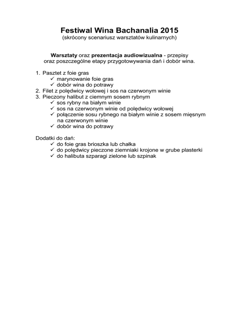 Festiwal Wina Bachanalia 2015 (skrócony scenariusz warsztatów kulinarnych) Warsztaty oraz prezentacja audiowizualna - przepisy oraz poszczególne etapy przygotowywania dań i dobór wina. 1. Pasztet z foie gras marynowanie foie gras dobór wina do potrawy 2. Filet z polędwicy wołowej i sos na czerwonym winie 3. Pieczony halibut z ciemnym sosem rybnym sos rybny na białym winie sos na czerwonym winie od polędwicy wołowej połączenie sosu rybnego na białym winie z sosem mięsnym na czerwonym winie dobór wina do potrawy Dodatki do dań: do foie gras brioszka lub chałka do polędwicy pieczone ziemniaki krojone w grube plasterki do halibuta szparagi zielone lub szpinak