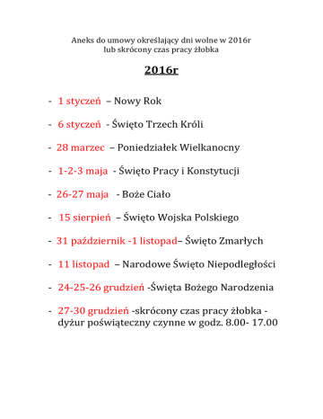 Aneks do umowy określający dni wolne w 2016r lub skrócony czas pracy żłobka 2016r - 1 styczeń – Nowy Rok - 6 styczeń - Święto Trzech Króli - 28 marzec – Poniedziałek Wielkanocny - 1-2-3 maja - Święto Pracy i Konstytucji - 26-27 maja - Boże Ciało - 15 sierpień – Święto Wojska Polskiego - 31 październik -1 listopad– Święto Zmarłych - 11 listopad – Narodowe Święto Niepodległości - 24-25-26 grudzień -Święta Bożego Narodzenia - 27-30 grudzień -skrócony czas pracy żłobka dyżur poświąteczny czynne w godz. 8.00- 17.00
