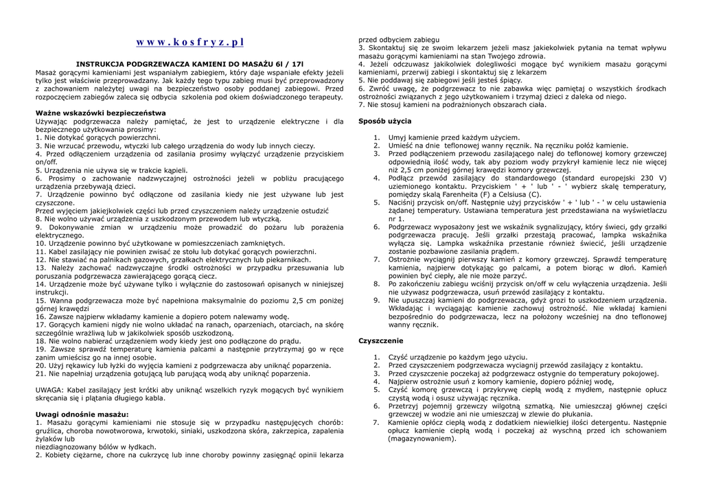 www.kosfryz.pl INSTRUKCJA PODGRZEWACZA KAMIENI DO MASAŻU 6l / 17l Masaż gorącymi kamieniami jest wspaniałym zabiegiem, który daje wspaniałe efekty jeżeli tylko jest właściwie przeprowadzany. Jak każdy tego typu zabieg musi być przeprowadzony z zachowaniem należytej uwagi na bezpieczeństwo osoby poddanej zabiegowi. Przed rozpoczęciem zabiegów zaleca się odbycia szkolenia pod okiem doświadczonego terapeuty. Ważne wskazówki bezpieczeństwa Używając podgrzewacza należy pamiętać, że jest to urządzenie elektryczne i dla bezpiecznego użytkowania prosimy: 1. Nie dotykać gorących powierzchni. 3. Nie wrzucać przewodu, wtyczki lub całego urządzenia do wody lub innych cieczy. 4. Przed odłączeniem urządzenia od zasilania prosimy wyłączyć urządzenie przyciskiem on/off. 5. Urządzenia nie używa się w trakcie kąpieli. 6. Prosimy o zachowanie nadzwyczajnej ostrożności jeżeli w pobliżu pracującego urządzenia przebywają dzieci. 7. Urządzenie powinno być odłączone od zasilania kiedy nie jest używane lub jest czyszczone. Przed wyjęciem jakiejkolwiek części lub przed czyszczeniem należy urządzenie ostudzić 8. Nie wolno używać urządzenia z uszkodzonym przewodem lub wtyczką. 9. Dokonywanie zmian w urządzeniu może prowadzić do pożaru lub porażenia elektrycznego. 10. Urządzenie powinno być użytkowane w pomieszczeniach zamkniętych. 11. Kabel zasilający nie powinien zwisać ze stołu lub dotykać gorących powierzchni. 12. Nie stawiać na palnikach gazowych, grzałkach elektrycznych lub piekarnikach. 13. Należy zachować nadzwyczajne środki ostrożności w przypadku przesuwania lub poruszania podgrzewacza zawierającego gorącą ciecz. 14. Urządzenie może być używane tylko i wyłącznie do zastosowań opisanych w niniejszej instrukcji. 15. Wanna podgrzewacza może być napełniona maksymalnie do poziomu 2,5 cm poniżej górnej krawędzi 16. Zawsze najpierw wkładamy kamienie a dopiero potem nalewamy wodę. 17. Gorących kamieni nigdy nie wolno układać na ranach, oparzeniach, otarciach, na skórę szczególnie wrażliwą lub w jakikolwiek sposób uszkodzoną. 18. Nie wolno nabierać urządzeniem wody kiedy jest ono podłączone do prądu. 19. Zawsze sprawdź temperaturę kamienia palcami a następnie przytrzymaj go w ręce zanim umieścisz go na innej osobie. 20. Użyj rękawicy lub łyżki do wyjęcia kamieni z podgrzewacza aby uniknąć poparzenia. 21. Nie napełniaj urządzenia gotującą lub parującą wodą aby uniknąć poparzenia. UWAGA: Kabel zasilający jest krótki aby uniknąć wszelkich ryzyk mogących być wynikiem skręcania się i plątania długiego kabla. Uwagi odnośnie masażu: 1. Masażu gorącymi kamieniami nie stosuje się w przypadku następujęcych chorób: gruźlica, choroba nowotworowa, krwotoki, siniaki, uszkodzona skóra, zakrzepica, zapalenia żylaków lub niezdiagnozowany bólów w łydkach. 2. Kobiety ciężarne, chore na cukrzycę lub inne choroby powinny zasięgnąć opinii lekarza przed odbyciem zabiegu 3. Skontaktuj się ze swoim lekarzem jeżeli masz jakiekolwiek pytania na temat wpływu masażu gorącymi kamieniami na stan Twojego zdrowia. 4. Jeżeli odczuwasz jakikolwiek dolegliwości mogące być wynikiem masażu gorącymi kamieniami, przerwij zabiegi i skontaktuj się z lekarzem 5. Nie poddawaj się zabiegowi jeśli jesteś śpiący. 6. Zwróć uwagę, że podgrzewacz to nie zabawka więc pamiętaj o wszystkich środkach ostrożności związanych z jego użytkowaniem i trzymaj dzieci z daleka od niego. 7. Nie stosuj kamieni na podrażnionych obszarach ciała. Sposób użycia 1. 2. 3. 4. 5. 6. 7. 8. 9. Umyj kamienie przed każdym użyciem. Umieść na dnie teflonowej wanny ręcznik. Na ręczniku połóż kamienie. Przed podłączeniem przewodu zasilającego nalej do teflonowej komory grzewczej odpowiednią ilość wody, tak aby poziom wody przykrył kamienie lecz nie więcej niż 2,5 cm poniżej górnej krawędzi komory grzewczej. Podłącz przewód zasilający do standardowego (standard europejski 230 V) uziemionego kontaktu. Przyciskiem ' + ' lub ' - ' wybierz skalę temperatury, pomiędzy skalą Farenheita (F) a Celsiusa (C). Naciśnij przycisk on/off. Następnie użyj przycisków ' + ' lub ' - ' w celu ustawienia żądanej temperatury. Ustawiana temperatura jest przedstawiana na wyświetlaczu nr 1. Podgrzewacz wyposażony jest we wskaźnik sygnalizujący, który świeci, gdy grzałki podgrzewacza pracuję. Jeśli grzałki przestają pracować, lampka wskaźnika wyłącza się. Lampka wskaźnika przestanie również świecić, jeśli urządzenie zostanie pozbawione zasilania prądem. Ostrożnie wyciągnij pierwszy kamień z komory grzewczej. Sprawdź temperaturę kamienia, najpierw dotykając go palcami, a potem biorąc w dłoń. Kamień powinien być ciepły, ale nie może parzyć. Po zakończeniu zabiegu wciśnij przycisk on/off w celu wyłączenia urządzenia. Jeśli nie używasz podgrzewacza, usuń przewód zasilający z kontaktu. Nie upuszczaj kamieni do podgrzewacza, gdyż grozi to uszkodzeniem urządzenia. Wkładając i wyciągając kamienie zachowuj ostrożność. Nie wkładaj kamieni bezpośrednio do podgrzewacza, lecz na położony wcześniej na dno teflonowej wanny ręcznik. Czyszczenie 1. 2. 3. 4. 5. 6. 7. Czyść urządzenie po każdym jego użyciu. Przed czyszczeniem podgrzewacza wyciagnij przewód zasilający z kontaktu. Przed czyszczenie poczekaj aż podgrzewacz ostygnie do temperatury pokojowej. Najpierw ostrożnie usuń z komory kamienie, dopiero później wodę, Czyść komorę grzewczą i przykrywę ciepłą wodą z mydłem, następnie opłucz czystą wodą i osusz używając ręcznika. Przetrzyj pojemnij grzewczy wilgotną szmatką. Nie umieszczaj głównej części grzewczej w wodzie ani nie umieszczaj w zlewie do płukania. Kamienie opłócz ciepłą wodą z dodatkiem niewielkiej ilości detergentu. Następnie opłucz kamienie ciepłą wodą i poczekaj aż wyschną przed 
