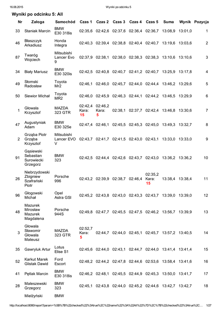 16.08.2015 Wyniki po odcinku 5 Wyniki po odcinku 5: All Nr Załoga Samochód Czas 1 Czas 2 Czas 3 Czas 4 Czas 5 Suma Wynik Pozycja 33 Staniak Marcin BMW E30 318is 02:35,6 02:42,6 02:37,6 02:36,4 02:36,7 13:08,9 13:01,0 1 46 Błaszczyk Arkadiusz Honda Integra 02:40,3 02:39,4 02:38,8 02:40,4 02:40,7 13:19,6 13:03,6 2 87 Twaróg Wojciech Mitsubishi Lancer Evo 9 02:37,9 02:38,1 02:38,0 02:38,3 02:38,3 13:10,6 13:10,6 3 34 Biały Mariusz BMW E30 320is 02:42,5 02:40,8 02:40,7 02:41,2 02:40,7 13:25,9 13:17,8 4 49 Słomski Radosław Toyota Mr2 02:46,1 02:46,0 02:45,7 02:44,0 02:44,4 13:46,2 13:29,6 5 50 Siewior Michał Toyota MR2 02:46,0 02:45,9 02:46,3 02:44,1 02:44,2 13:46,5 13:29,9 6 Głowala Krzysztof MAZDA 323 GTR 02:42,4 02:46,2 Kara: Kara: 02:38,1 02:37,7 02:42,4 13:46,8 13:30,6 15 5 7 47 Augustyniak Adam BMW E30 325e 02:47,4 02:46,1 02:45,5 02:45,3 02:45,0 13:49,3 13:32,7 8 2 Grząba Piotr Grząba Krzysztof Mitsubishi Lancer EVO 02:43,7 02:41,7 02:41,5 02:43,0 02:43,1 13:33,0 13:33,0 V 9 91 Gąsiewski Sebastian Surowiecki Grzegorz BMW 323 02:42,5 02:44,4 02:42,6 02:43,7 02:43,0 13:36,2 13:36,2 10 26 Niebrzydowski Zbigniew Szafrański Piotr Porsche 996 02:35,2 02:43,2 02:39,9 02:38,7 02:46,4 Kara: 13:38,4 13:38,4 15 11 96 Głogowski Michał Opel Astra GSI 02:45,2 02:43,8 02:43,0 02:43,3 02:43,7 13:39,0 13:39,0 12 48 Mazurek Mirosław Mazurek Magdalena Porsche 944S 02:49,8 02:47,7 02:45,5 02:47,5 02:46,2 13:56,7 13:39,9 13 Głowala Sławomir Głowala Mateusz MAZDA 323 GTR 02:52,7 Kara: 02:44,7 02:44,0 02:45,1 02:45,7 13:57,2 13:40,5 5 14 35 Gawryluk Artur Lotus Elise S1 02:45,6 02:44,0 02:43,1 02:44,7 02:44,0 13:41,4 13:41,4 15 52 Karkut Marek Glistak Dawid Ford Escort 02:48,2 02:44,2 02:47,8 02:44,6 02:53,6 13:58,4 13:41,6 16 41 Pętlak Marcin BMW E30 318is 02:46,2 02:48,1 02:45,5 02:44,9 02:45,3 13:50,0 13:41,7 17 28 Maleszewski Grzegorz BMW 323 02:45,1 02:43,8 02:44,0 02:45,2 02:44,6 13:42,7 13:42,7 18 Mielżyński BMW 1 3 http://localhost:8080/report?param=%5B%7B%22checked%22%3Atrue%2C%22name%22%3A%22All%22%7D%2C%7B%22checked%22%3Atrue%2C… 1/27 16.08.2015 Wyniki po odcinku 5 29 Maksymilian 323ti 02:59,9 02:50,7 02:49,1 02:48,4 02:49,1 14:17,2 13:42,9 19 62 Kaminski Jaroslaw Kamińska Aleksandra ALPINE RENAULT A310 V6 02:47,6 02:48,2 02:45,2 02:46,9 02:48,2 13:56,1 13:47,7 20 17 Kowalski Jarosław MERCEDES 02:46,4 02:46,5 02:44,5 02:47,3 02:46,0 13:50,7 13:50,7 190 2.3 16V 21 79 Lemieszek Marcin Mazda RX7 02:45,4 02:47,2 02:45,5 02:45,7 02:47,9 13:51,7 13:51,7 22 42 Głowiński BMW Michał 318 Walerych Irena 02:50,4 02:48,7 02:48,0 02:47,6 02:48,2 14:02,9 13:54,4 23 92 Kaczmarek Andrzej BMW e36 325 02:44,3 Kara: 02:45,0 02:44,8 02:44,6 02:42,7 13:56,4 13:56,4 15 24 80 Słomska Agata Toyota Mr2 02:53,2 02:51,8 02:51,3 02:50,6 02:47,7 14:14,6 13:57,5 25 86 Szafrański Piotr Niebrzydowski Zbigniew Ferrari F355 02:46,6 03:00,8 02:52,6 02:43,2 02:42,8 14:06,0 13:57,5 26 64 Grzegory Konrad Opel Manta B 02:46,2 02:49,3 02:46,1 02:47,0 02:50,2 13:58,8 13:58,8 27 44 Mackiewicz Krzysztof Honda Civic 02:53,7 Kara: 02:46,6 02:44,5 02:43,2 02:44,7 14:07,7 13:59,3 15 28 4 Kajdanowicz Marek Szafrański Piotr Subaru 02:51,5 02:48,5 02:48,3 02:47,3 02:44,6 14:00,2 14:00,2 Impreza STI 29 68 Sobolewski Jarosław Porsche 924 02:49,3 02:49,0 02:47,1 02:47,8 02:48,3 14:01,5 14:01,5 30 94 Lewiński Marcin Toyota GT86 02:49,3 02:48,3 02:47,5 02:50,5 02:48,3 14:03,9 14:03,9 31 77 Chwist Marcin Porsche 944 02:50,7 02:49,5 02:48,4 02:48,2 02:47,2 14:04,0 14:04,0 32 16 Machudera Andrzej Mercedes W107 SLC 02:55,8 03:03,3 02:52,3 02:54,0 02:54,0 14:39,4 14:04,2 33 27 Goszczycki Paweł BMW M Power E36 02:52,9 Kara: 02:47,3 02:46,4 02:45,9 02:47,0 14:14,5 14:06,1 15 34 65 Śliwka Waldemar Porsche 924 02:52,5 02:49,3 02:49,3 02:49,4 02:48,6 14:09,1 14:09,1 35 40 Nowopolski Jakub Ford Fiesta 02:54,4 02:51,2 02:47,8 02:47,9 02:48,6 14:09,9 14:09,9 36 36 Kacperek Marcin BMW 318 is 02:46,5 02:55,9 02:48,0 02:46,8 02:47,9 Kara: 14:20,1 14:11,6 15 37 60 Maleszewski Mariusz BMW 635 CSi 02:51,3 02:50,3 02:50,2 02:50,0 02:50,9 14:12,7 14:12,7 38 http://localhost:8080/report?param=%5B%7B%22checked%22%3Atrue%2C%22name%22%3A%22All%22%7D%2C%7B%22checked%22%3Atrue%2C… 2/27 16.08.2015 Wyniki po odcinku 5 Baran Andrzej Karus Łukasz BMW 320is 02:56,4 02:54,3 02:51,1 02:51,2 02:49,6 14:22,6 14:13,9 39 51 Kaczmarek Filip BMW 325 (E30) 02:51,9 02:52,9 02:50,9 02:57,4 02:58,7 14:31,8 14:14,3 40 63 Tomczak Tomasz Toyota Celica 02:56,9 02:55,2 02:55,0 02:52,7 02:53,0 14:32,8 14:15,3 41 Rola Bartosz Nowak Krystian Subaru Impreza GT 02:54,3 02:51,4 02:50,8 02:51,3 02:54,4 14:22,2 14:22,2 42 78 Zachowicz Marcin Porsche 911 03:02,7 02:59,1 03:00,3 02:59,9 02:57,8 14:59,8 14:23,8 43 43 Konaszewski Sławomir Konaszewski Tomasz Polonez Atu 02:55,6 02:54,9 02:51,1 02:51,8 02:50,9 14:24,3 14:24,3 44 57 Piechowicz Tomasz Mazda Miata 02:54,1 02:49,9 02:49,9 Kara: Kara: 02:48,4 02:49,4 14:41,7 14:24,6 15 15 45 7 Kozdryk Bartlomiej Ford Mustang 03:01,1 02:51,1 02:50,6 02:51,6 02:51,4 14:25,8 14:25,8 46 88 Całka Jakub Subaru Poszytek Kamil Impreza 02:48,4 02:48,7 Kara: 02:51,8 02:51,0 02:51,6 14:26,5 14:26,5 15 47 55 Grycza Maciej Renault Clio 02:56,2 02:55,8 02:56,4 02:53,0 02:55,0 14:36,4 14:27,6 48 31 Śliwka Michał Porsche 924 02:54,4 02:54,1 02:52,6 02:54,6 02:52,0 14:27,7 14:27,7 49 61 Ernst Jacek Wypyski Błażej Volvo Amazon 03:01,3 02:58,5 02:57,7 02:59,5 02:59,8 14:56,8 14:29,8 50 99 Wrona Paweł Fiat 125p 02:55,2 Kara: 02:57,9 02:54,9 02:51,0 02:46,6 14:40,6 14:31,9 15 51 13 Zorga Krzysztof Wnuk Aleksandra Pontiac Trans Am 02:56,8 02:55,2 02:53,7 02:52,9 02:54,1 14:32,7 14:32,7 52 93 Pobudkiewicz Zbigniew Renault Clio 02:54,3 02:54,7 02:54,6 02:53,6 02:55,9 14:33,1 14:33,1 53 30 Pałacha Marek Cyrkowicz Wojciech Mazda 323 4WD turbo 02:55,7 02:57,1 02:55,4 02:57,9 02:59,1 14:45,2 14:36,3 54 56 Biegoń Jan TOYOTA MR 2 03:01,4 02:58,7 02:59,6 02:58,5 02:58,1 14:56,3 14:38,3 55 Slomski Jarosław Toyota Celica 02:58,6 02:58,7 03:01,0 03:00,4 