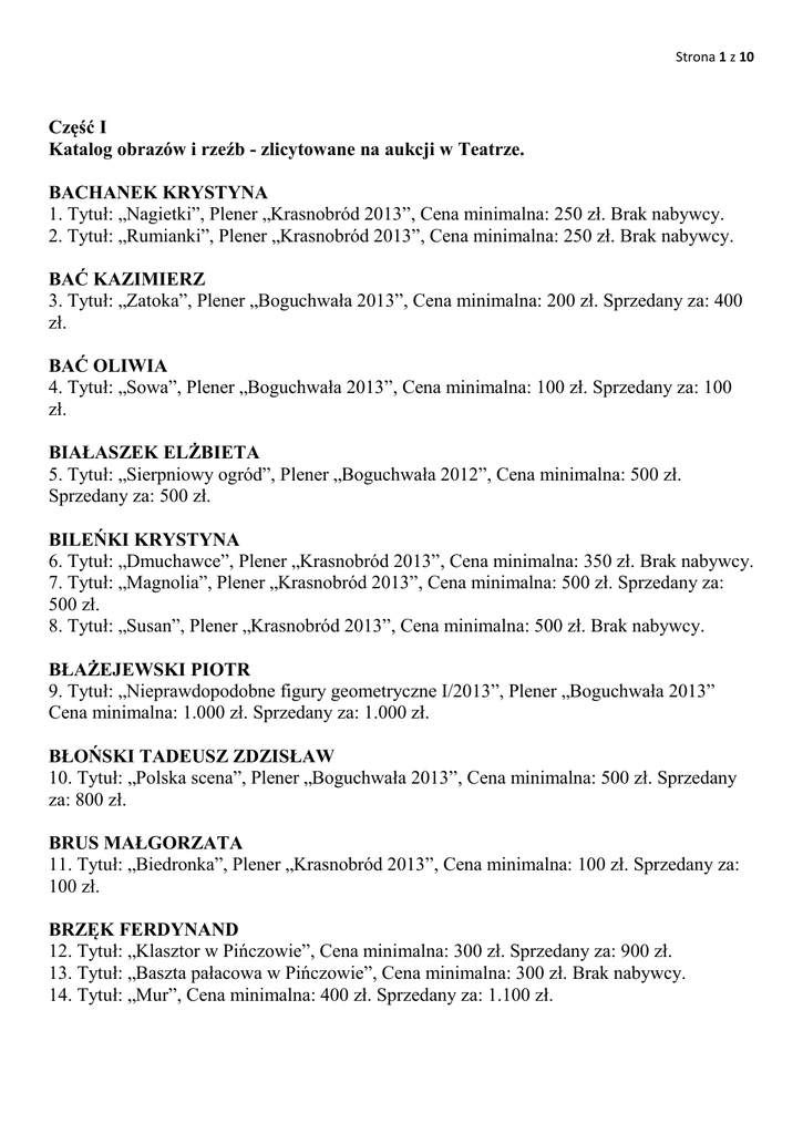 Strona 1 z 10 Część I Katalog obrazów i rzeźb - zlicytowane na aukcji w Teatrze. BACHANEK KRYSTYNA 1. Tytuł: „Nagietki”, Plener „Krasnobród 2013”, Cena minimalna: 250 zł. Brak nabywcy. 2. Tytuł: „Rumianki”, Plener „Krasnobród 2013”, Cena minimalna: 250 zł. Brak nabywcy. BAĆ KAZIMIERZ 3. Tytuł: „Zatoka”, Plener „Boguchwała 2013”, Cena minimalna: 200 zł. Sprzedany za: 400 zł. BAĆ OLIWIA 4. Tytuł: „Sowa”, Plener „Boguchwała 2013”, Cena minimalna: 100 zł. Sprzedany za: 100 zł. BIAŁASZEK ELŻBIETA 5. Tytuł: „Sierpniowy ogród”, Plener „Boguchwała 2012”, Cena minimalna: 500 zł. Sprzedany za: 500 zł. BILEŃKI KRYSTYNA 6. Tytuł: „Dmuchawce”, Plener „Krasnobród 2013”, Cena minimalna: 350 zł. Brak nabywcy. 7. Tytuł: „Magnolia”, Plener „Krasnobród 2013”, Cena minimalna: 500 zł. Sprzedany za: 500 zł. 8. Tytuł: „Susan”, Plener „Krasnobród 2013”, Cena minimalna: 500 zł. Brak nabywcy. BŁAŻEJEWSKI PIOTR 9. Tytuł: „Nieprawdopodobne figury geometryczne I/2013”, Plener „Boguchwała 2013” Cena minimalna: 1.000 zł. Sprzedany za: 1.000 zł. BŁOŃSKI TADEUSZ ZDZISŁAW 10. Tytuł: „Polska scena”, Plener „Boguchwała 2013”, Cena minimalna: 500 zł. Sprzedany za: 800 zł. BRUS MAŁGORZATA 11. Tytuł: „Biedronka”, Plener „Krasnobród 2013”, Cena minimalna: 100 zł. Sprzedany za: 100 zł. BRZĘK FERDYNAND 12. Tytuł: „Klasztor w Pińczowie”, Cena minimalna: 300 zł. Sprzedany za: 900 zł. 13. Tytuł: „Baszta pałacowa w Pińczowie”, Cena minimalna: 300 zł. Brak nabywcy. 14. Tytuł: „Mur”, Cena minimalna: 400 zł. Sprzedany za: 1.100 zł. Strona 2 z 10 CERAŃSKI WŁODZIMIERZ 15. Tytuł: „Suchodrzew”, Plener „Krasnobród 2013”, Cena minimalna: 250 zł. Brak nabywcy. CICHOWSKA GABRIELA 16. Tytuł: „Matka Boska z Dzieciątkiem”, Plener „Boguchwała 2013”, Cena minimalna: 400 zł. Sprzedany za: 700 zł. 17. Tytuł: „Olusia”, Plener „Boguchwała 2013”, Cena minimalna: 200 zł. Sprzedany za: 900 zł. CZARNECKA GABRIELA 18. Tytuł: „Głębina morska I”, Plener „Krasnobród 2013”, Cena minimalna: 150 zł. Brak nabywcy. 19. Tytuł: „Głębina morska II”, Plener „Krasnobród 2013”, Cena minimalna: 180 zł. Brak nabywcy. DAWIDIUK MAŁGORZATA 20. Tytuł: „Święci”, Plener „Boguchwała 2013”, Cena minimalna: 400 zł. Sprzedany za: 600 zł. DOBA BOGUSŁAW 21. Tytuł: „Jeden szum”, Plener „Krasnobród 2013”, Cena minimalna: 450 zł. Sprzedany za: 450 zł. DOMAGAŁA WOJCIECH 22. Tytuł: „Arabesque”, Cena minimalna: 200 zł. Brak nabywcy. DZIOPAK MARIA 23. Tytuł: „Morze Nadziei”, Cena minimalna: 2.000 zł. Sprzedany za: 4.300 zł. FRYDRYK GRZEGORZ 24. Tytuł: „Chleb powszedni”, Cena minimalna: 200 zł. Sprzedany za: 300 zł. 25. Tytuł: „Po co są kamienie”, Cena minimalna: 200 zł. Sprzedany za: 300 zł. GAZDA JÓZEF 26. Tytuł: „Żółty kwiat”, Cena minimalna: 1.000 zł. Sprzedany za: 1.500 zł. 27. Tytuł: „Kwiaty”, Cena minimalna: 1.000 zł. Sprzedany za: 1.700 zł. 28. Tytuł: „Łany zboża”, Cena minimalna: 1.000 zł. Sprzedany za: 1.000 zł. GILUŃ JACEK 29. Tytuł: „Motyl”, Plener „Krasnobród 2013”, Cena minimalna: 150 zł. Brak nabywcy. 30. Tytuł: „Ważka”, Plener „Krasnobród 2013”, Cena minimalna: 100 zł. Sprzedany za: 100 zł. Strona 3 z 10 GRABARZ JAN 31. Tytuł: „Mocarz miłości”, Cena minimalna: 200 zł. Sprzedany za: 200 zł. 32. Tytuł: „Nabożny Samarytanin”, Cena minimalna: 200 zł. Brak nabywcy. GRABOWSKA-BŁOŃSKA JUSTYNA 33. Tytuł: bez tytułu, Plener „Boguchwała 2013”, Cena minimalna: 300 zł. Brak nabywcy. GRENDA ANDRZEJ, 34. Tytuł: bez tytułu, Plener „Boguchwała 2013”, Cena minimalna: 600 zł. Sprzedany za: 600 zł. HABDAS EDWARD 35. Tytuł: „My z Kosmosu /1345”, Plener „Boguchwała 2013”, Cena minimalna: 600 zł. Brak nabywcy. JAKIMA -ZEREK JOLANTA 36. Tytuł: „Kapela we mgle”, Plener „Boguchwała 2013”, Cena minimalna: 500 zł. Sprzedany za: 800 zł. JAROSIEWICZ JADWIGA MARIA 37. Tytuł: „Wisłok w Boguchwale”, Plener „Boguchwała 2013”, Cena minimalna: 600 zł. Sprzedany za: 600 zł. 38. Tytuł: „Irysy różowe II”, Plener „Boguchwała 2013”, Cena minimalna: 800 zł. Sprzedany za: 1.100 zł. KASPRZYK STANISŁAW 39. Tytuł: „Jesień w Brennej”, Plener „Krasnobród 2013”, Cena minimalna: 450 zł. Brak nabywcy. KATONA ERZSÉBET 40. Tytuł: „W pokoju”, Cena minimalna: 500 zł. Brak nabywcy. KAWULA BOGDAN 41. Tytuł: „W kroplach deszczu”, Cena minimalna: 500 zł. Sprzedany za: 1.000 zł. KĘDZIERSKI BOGUSŁAW 42. Tytuł: „Św. Stanisław”, Cena minimalna: 500 zł. Brak nabywcy. KIJOWSKI ANDRZEJ 43. Tytuł: „Wieczór” , Plener „Boguchwała 2013”, Cena minimalna: 500 zł. Sprzedany za: 500 zł. KOŁODZIEJ MIECZYSŁAW 44. Tytuł: „Kwiaty I”, Plener „Boguchwała 2013”, Cena minimalna: 200 zł. Strona 4 z 10 45. Tytuł: „Kwiaty II”, Plener „Boguchwała 2013”, Cena minimalna: 200 zł. 46. Tytuł: „Kwiaty III”, Plener „Boguchwała 2013”, Cena minimalna: 200 zł. Tryptyk sprzedany za: 500 zł. KOŁODZIEJ ROMUALD 47. Tytuł: „Tryptyk 1 – Święty Boguchwalski”, Plener „Boguchwała 2013” Tytuł: „Tryptyk 2 – Święty Boguchwalski”, Plener „Boguchwała 2013” Tytuł: „Tryptyk 3 - Anioł”, Plener „Boguchwała 2013” Cena minimalna za tryptyk: 1.500 zł. Sprzedany za: 1.900 zł. KUROWSKA EWA 48. Tytuł: „Jestem piękny”, Plener „Krasnobród 2013”, Cena minimalna: 350 zł. Brak nabywcy. KWOKA DOROTA 49. Tytuł: „Muzyka Głogu”, Cena minimalna: 200 zł. Sprzedany za: 400 zł. LASKO HENRYK 50. Tytuł: „Dwa wiatraki”, Cena minimalna: 200 zł. Sprzedany za: 1.600 zł. LUDWIN KRZYSZTOF 51. Tytuł: „Bellagio Jezioro COMO”, Plener „Boguchwała 2012”, Cena minimalna: 1.700 zł. Sprzedany za: 2.000 zł. MARKIEWICZ ANDRZEJ 52. Tytuł: 
