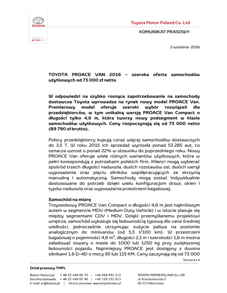 2 września 2016 TOYOTA PROACE VAN 2016 – szeroka oferta samochodów użytkowych od 73 000 zł netto W odpowiedzi na szybko rosnące zapotrzebowanie na samochody dostawcze Toyota wprowadza na rynek nowy model PROACE Van. Premierowy model oferuje szeroki wybór rozwiązań dla przedsiębiorców, w tym unikalną wersję PROACE Van Compact o długości tylko 4,6 m, która tworzy nowy podsegment w klasie samochodów użytkowych. Ceny rozpoczynają się od 73 000 netto (89 790 zł brutto). Polscy przedsiębiorcy kupują coraz więcej samochodów dostawczych do 3,5 T. W roku 2015 ich sprzedaż wyniosła ponad 53 285 aut, co oznacza wzrost o ponad 22% w stosunku do poprzedniego roku. Nowy PROACE Van oferuje wiele różnych wariantów użytkowych, które w pełni korespondują z potrzebami polskich firm. Klienci mogą wybierać spośród trzech długości nadwozia, dwóch rozstawów osi, dwóch wersji wyposażenia oraz pięciu silników współpracujących ze skrzynią manualną i automatyczną. Samochody mogą zostać indywidualnie dostosowane do potrzeb dzięki wielu konfiguracjom drzwi, okien i typów nadwozia oraz wyposażenia przestrzeni bagażowej. Samochód na miarę Trzyosobowy PROACE Van Compact o długości 4,6 m jest najkrótszym autem w segmencie MDV (Medium Duty Vehicle) i w istocie plasuje się między segmentami CDV i MDV. Dzięki przemyślanemu projektowi wnętrza, samochód wykazuje się ładownością typową dla vana średniej wielkości, jednocześnie utrzymując zużycie paliwa na poziomie analogicznym do minivanów (od 5,5 l/100 km). W przestrzeni bagażowej o pojemności 4,6 m2, długości 2,1 m i szerokości 1,6 m można załadować towary o masie do 1000 lub 1250 kg przy zwiększonej ładowności pojazdu. Najmniejszy PROACE jest dostępny z dwoma silnikami 1.6 D-4D o mocy 95 lub 115 KM. Ceny zaczynają się od 73 000 Strona 1 z 4 zł netto (89 790 zł brutto) za wersję Life, zaś wersja Active jest tylko o 5900 zł netto droższa. PROACE Compact jest dostępny w wersjach częściowo i całkowicie przeszklonej oraz jako furgon. PROACE Van Medium ma długość 4,9 m i rozstaw osi 3,2 m, co przekłada się na 2,5 m długości przestrzeni bagażowej i 5,3 m2 objętości. W zależności od wersji maksymalna ładowność wynosi od 1000 do 1400 kg. PROACE średniej wielkości jest dostępny z pełną paletą silników w dwóch pojemnościach i aż pięciu wariantach mocy od 95 KM do 180 KM. Wygodę prowadzenia zwiększa automatyczna skrzynia biegów współpracująca z silnikiem 2.0 180 KM. Wszystkie silniki wyróżniają się najlepszą emisją CO2 w swoich klasach w segmencie MDV i spełniają normę Euro 6. Wersja Medium jest dostępna z nadwoziem furgon, jako półprzeszklony lub przeszklony van, z dwoma rzędami siedzeń, w wersji kombi i z platformą. Ceny zaczynają się od 78 400 zł netto (96 400 zł brutto) dla wersji Life i od 83 400 zł netto (102 580 brutto) dla wersji Active. Wersja Long z tym samym rozstawem osi ma wydłużony tylny zwis, który zwiększa długość pojazdu do 5,3 m. Samochód jest dostępny jako furgon, półprzeszklony lub przeszklony van, wersja z dwoma rzędami siedzeń i kombi. Część bagażowa o długości 2,8 m i 1,6 m szerokości zapewnia objętość przestrzeni ładunkowej na poziomie 6,1 m3. Maksymalna ładowność wynosi od 1200 do 1400 kg. Do jest paleta silników o mocy 95 KM, 120 KM, 150 KM ze skrzynią manualną i 180 KM z przekładnią automatyczną. Najdłuższy PROACE Van w wersji Life kosztuje od 86 200 zł netto (106 020 zł brutto), zaś w wersji Active od 91 200 zł netto (112 170 zł brutto). Wersje wyposażenia Podstawowa wersja Life zawiera centralny zamek, elektryczne szyby przednie, gniazdko 12 V na desce rozdzielczej, fotel kierowcy z podłokietnikiem, tapicerkę materiałową i pełną przegrodę przestrzeni bagażowej. Bezpieczeństwo zapewniają poduszki powietrzne chroniące kierowcę i 2 pasażerów, układ stabilizacji toru jazdy ESC, system wspomagający pokonywanie podjazdów HAC oraz system odcięcia paliwa w przypadku uderzenia i czujnik niezapiętych pasów bezpieczeństwa. Wskaźnik zmiany biegów wspomaga kierowcę w Strona 2 z 4 ekonomicznej jeździe, podobnie jak system Start&Stop dostępny z niemal wszystkimi rodzajami silników. Wersja Active została wzbogacona o klimatyzację oraz system audio ze zintegrowanym wyświetlaczem, Bluetooth i wejściem USB. Fotel kierowcy ma regulację wysokości i odcinka lędźwiowego. Samochód jest wygodniejszy w użytkowaniu także dzięki dodatkowym gniazdkom 12V w schowku i z tyłu pojazdu oraz kluczykowi z pilotem. Przegroda przestrzeni ładunkowej jest w tej wersji przeszklona, a materiałowa tapicerka ma elementy winylowe, co zwiększa jej trwałość i ułatwia czyszczenie. Maksymalna funkcjonalność Atutem wersji Active jest system Smart Cargo, który łączy otwieraną przegrodę z unoszonym przednim siedzeniem pasażera, aby zwiększyć długość przestrzeni bagażowej o 1,16 m, a ładowność o 0,5 m3. W ramach tej opcji samochód otrzymuje dodatkowy schowek pod środkowym fotelem pasażera i ruchomy stolik przyczepiony do oparcia fotela z uchwytem do bezpiecznego przytrzymywania przedmiotów takich jak dokumenty czy laptop. Zaletą wszystkich wersji są praktyczne, przesuwne drzwi boczne (w wersji Medium i Long są wystarczająco szerokie, aby zmieściła się euro paleta) oraz podwójne tylne drzwi otwierane na szerokość 180 stopni. Opcjonalnie występują także automatyczne boczne drzwi przesuwne. Tylne drzwi dzielone w proporcji 50:50 w standardzie mogą być zastąpione przez 3 alternatywne konfiguracje, poprawiające własności użytkowe samochodu. Kompleksowa lista opcji i akcesoriów pozwala zaadaptować samochód do różnorodnych potrzeb. Składają się na nie rozwiązania ułatwiające użytkowanie (bezkluczykowe otwieranie samochodu, automatyczne światła i wycieraczki, czujniki parkowania z przodu i z tyłu, kamera cofania, system 