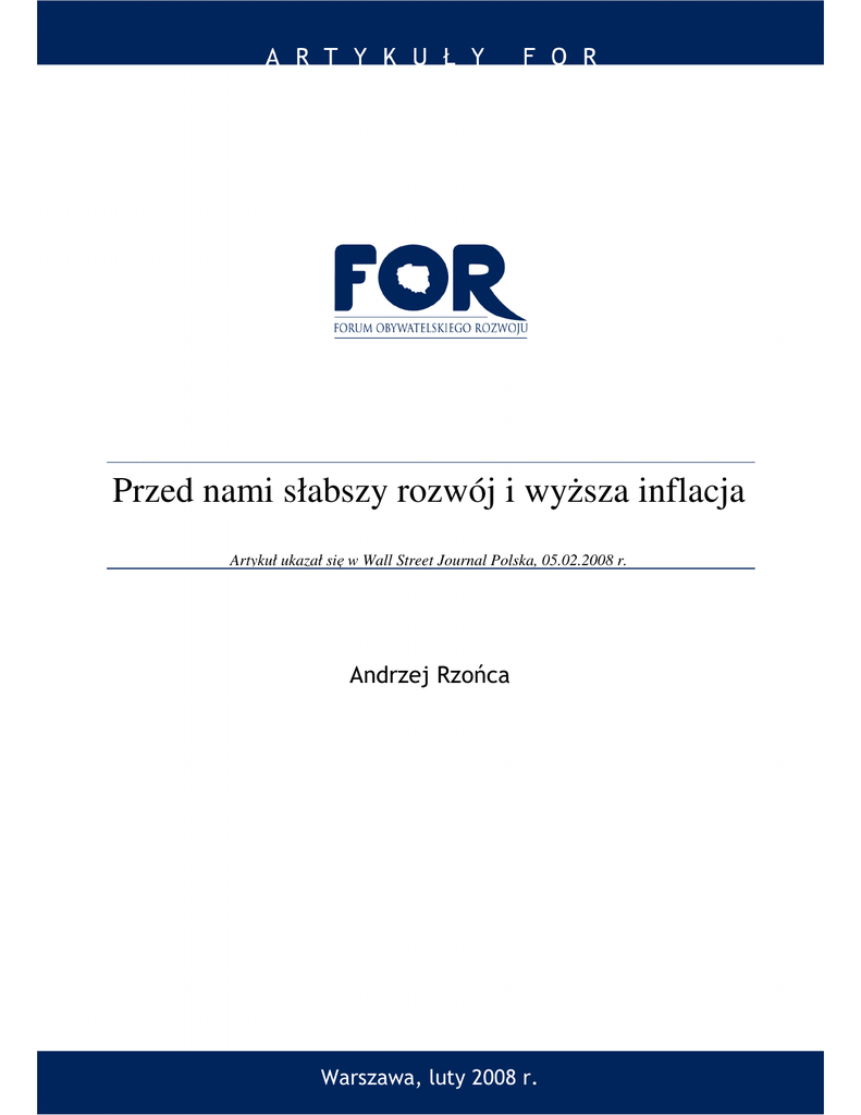Przed nami słabszy rozwój i wyższa inflacja Artykuł ukazał się w Wall Street Journal Polska, 05.02.2008 r. Andrzej Rzońca Warszawa, luty 2008 r. Nowy 2008 rok na giełdach papierów wartościowych zaczął się fatalnie i to właściwie wszędzie. Znacząco spadły indeksy w Nowym Jorku, w Tokio i Londynie. Indeks WIG giełdy w Warszawie obniżył się o kilkanaście procent. Skąd wzięły się te spadki? Bezpośrednią przyczyną wyprzedaży było gwałtowne pogorszenie się sytuacji na rynku tzw. subprime loans w Stanach Zjednoczonych, czyli rynku kredytów hipotecznych dla osób o niskiej zdolności kredytowej. Problemy z tymi kredytami musiały się pojawić, bo udzielano ich wedle bardzo łagodnych kryteriów i na bardzo korzystnych warunkach. Osoby, które je otrzymywały, nazywano żartobliwie „ninja” (skrót od angielskich słów „no income, no job or assets). Wielkość kredytów sięgała 100 proc. wartości transakcji. Przez okres 2-3 lat banki gwarantowały kredytobiorcom stałe niskie oprocentowanie. Banki nie przejmowały się ryzykiem, bo sprzedawały je na rynku finansowym. Tak im się przynajmniej wydawało. Co więcej, na samej sprzedaży ryzyka także zarabiały np. pobierając opłaty za dystrybucję papierów wartościowych zabezpieczanych przychodami z kredytów hipotecznych, które emitowały zakładane przez banki specjalne spółki SPV lub SIV. W rzeczywistości, ryzyko w dużym stopniu nadal obciążało banki. Po pierwsze, to one w dużym stopniu były właścicielem kapitału tych spółek i najgorzej zabezpieczonych części emitowanych przez nie papierów wartościowych. Oznaczało to, że w przypadku zmaterializowania się ryzyka, przed którym banki chciały się zabezpieczyć, ich roszczenia wobec spółek będą zaspokajane w ostatniej kolejności. Po drugie, banki udzielały spółkom gwarancji kredytowych na wypadek trudności ze spłatą zobowiązań. Kiedy bańka na amerykańskim rynku nieruchomości pękła i najbardziej renomowane banki popadły w kłopoty finansowe, wywołując jednocześnie gwałtowną wyprzedaż akcji na giełdach całego świata, zaczęło się poszukiwanie winnych. Najczęściej za obecne zawirowania obwinia się innowacje finansowe. Nie zwraca się uwagi, że ci, którzy od dawna bardzo aktywnie w nie inwestowali, nie ponieśli jak dotąd dużych strat lub nawet zarobili (fundusze hedgingowe, a z banków np. Goldman Sachs), a zawirowania boleśnie dotknęły tych, którzy mocno zaangażowali się w nie 2 stosunkowo niedawno (np. Citibank). Innowacje łatwo się obwinia, bo mało kto się na nich zna. W końcu nawet nadzorcy sektora finansowego nie potrafili w porę ocenić ryzyka, jakie może wiązać się z nieumiejętnym korzystaniem z innowacji. To, czego się nie zna, często wywołuje obawy. W potoku nawoływań do zaostrzenia regulacji ograniczających swobodę inwestowania przez instytucje finansowe gubi się prawdziwą przyczynę obecnych zawirowań. Odpowiedzialne za nie są zbyt głębokie obniżki stóp procentowych w reakcji na pęknięcie bańki dotcomów w 2000 roku i zbyt długie ich utrzymywanie na niskim poziomie w latach późniejszych w obawie przed deflacją. Aby sobie uświadomić, że takie właśnie jest źródło obecnych zaburzeń, wystarczy powiązać kilka prostych faktów. Dlaczego rosły ceny nieruchomości? Bo ludzie, w tym także ci, którzy mieli niewielkie dochody, masowo się zapożyczali, aby je kupić. Dlaczego się zapożyczali? Bo stopy procentowe były na tak niskim poziomie, że spłata odsetek od kredytów stanowiła niewielkie obciążenie ich dochodów. Dlaczego banki masowo udzielały kredytów hipotecznych, a papiery wartościowe zabezpieczone przychodami z tych kredytów cieszyły się powodzeniem? Bo rosnące ceny nieruchomości oznaczały wzrost wartości zabezpieczenia kredytów. Jakie były inne skutki obniżki stóp? Skokowo zwiększyły się również wydatki inne niż na zakup nieruchomości, bo łatwo można było je sfinansować bądź to kredytem, bądź to środkami ze spieniężenia części majątku, którego wzrost wyceny – związany ze spadkiem stóp – pozwalał ludziom jednocześnie optymistycznie patrzeć w przyszłość. Co stało się, gdy skokowo zwiększyły się wydatki? Wzrósł import oraz pojawiła się presja na wzrost cen, bo nie da się zdolności wytwórczych gospodarki zwiększyć równie szybko jak wydatków. Jak zmienił się kurs dolara i jakie były tego skutki? Dolar osłabł, bo wraz ze wzrostem zadłużenia Stanów Zjednoczonych za granicą na pokrycie luki między importem a eksportem zmniejszyła się skłonność inwestorów do lokowania kolejnych porcji swoich oszczędności w dolary. Słabnący dolar dodatkowo podsycił inflację, bo podbił ceny dóbr importowanych. Co zrobił Fed, kiedy iluzję deflacji zastąpiła szybko rosnąca inflacja? Długo się ociągał, ale musiał w końcu podnieść stopy procentowe – z 1 proc. w 2003 roku do 5,25 proc. w połowie 2007 roku, bo inaczej nie zahamowałby wzrostu wydatków, a tym samym narastania inflacji, która obecnie przekracza 4 proc. w skali roku i jest najwyższa od 17 lat. Co 3 stało się z dochodami ludzi? Zostały, z jednej strony, nadszarpnięte przez rosnącą inflację, a z drugiej strony, znacznie obciążone spłatą odsetek od kredytów hipotecznych. Jak zareagowały na to ceny nieruchomości? Spadły, bo zmniejszyła się liczba chętnych do dalszych zakupów, a wzrosła – tych, którzy chcieli lub musieli się ich pozbyć. Jak zmienił się popyt na papiery wartościowe zabezpieczone przychodami z kredytów hipotecznych? Wysechł, bo zabezpieczenie okazało się iluzoryczne. Ot i całe wyjaśnienie obecnych problemów. Jak powinna wyglądać kuracja? Od diagnozy zależy kuracja. Identyfikacja rzeczywistej przyczyny obecnych zawirowań jest tym ważniejsza, że wiele osób domaga się, aby Fed zaaplikował amerykańskiej gospodarce to samo lekarstwo, któr