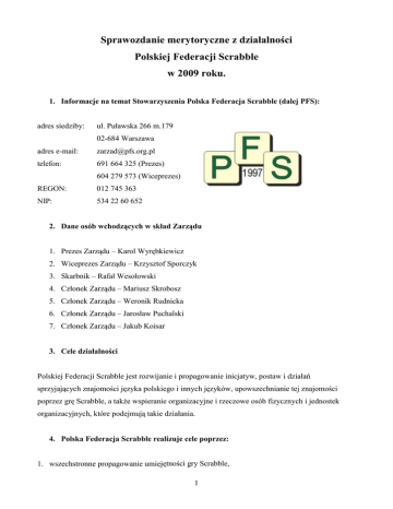 Sprawozdanie merytoryczne z działalności Polskiej Federacji Scrabble w 2009 roku. 1. Informacje na temat Stowarzyszenia Polska Federacja Scrabble (dalej PFS): adres siedziby: ul. Puławska 266 m.179 02-684 Warszawa adres e-mail: [email protected] telefon: 691 664 325 (Prezes) 604 279 573 (Wiceprezes) REGON: 012 745 363 NIP: 534 22 60 652 2. Dane osób wchodzących w skład Zarządu 1. Prezes Zarządu – Karol Wyrębkiewicz 2. Wiceprezes Zarządu – Krzysztof Sporczyk 3. Skarbnik – Rafał Wesołowski 4. Członek Zarządu – Mariusz Skrobosz 5. Członek Zarządu – Weronik Rudnicka 6. Członek Zarządu – Jarosław Puchalski 7. Członek Zarządu – Jakub Koisar 3. Cele działalności Polskiej Federacji Scrabble jest rozwijanie i propagowanie inicjatyw, postaw i działań sprzyjających znajomości języka polskiego i innych języków, upowszechnianie tej znajomości poprzez grę Scrabble, a takŜe wspieranie organizacyjne i rzeczowe osób fizycznych i jednostek organizacyjnych, które podejmują takie działania. 4. Polska Federacja Scrabble realizuje cele poprzez: 1. wszechstronne propagowanie umiejętności gry Scrabble, 1 2. współpracę i wzajemną pomoc członków Stowarzyszenia, 3. współpracę z osobami i instytucjami w zakresie zbierania informacji i wymiany doświadczeń związanych z grą Scrabble, 4. organizowanie i prowadzenie: a. w sposób bezpośredni lub pośredni zawodów regionalnych, krajowych, pucharowych, treningowych, propagandowych i innych zgodnie z ustalonym systemem współzawodnictwa sportowego, b. centralnej krajowej klasyfikacji sportowej, c. obozów i wczasów rekreacyjno-scrabblowych, 5. ustalanie kalendarza sportowego i regulaminu rozgrywek, 6. rozwijanie umiejętności gry wśród młodzieŜy, 7. prowadzenie ewidencji graczy oraz sekcji i klubów, 8. prowadzenie rejestracji zawodów, wyników oraz ewidencji , dokumentacji i sprawozdawczości sportowej i organizacyjnej, 9. prowadzenie działalności integrującej członków Stowarzyszenia poprzez aktywność kulturalną, rekreacyjną i towarzyską, 10. inne działania sprzyjające rozwojowi statutowych celów organizacji. 5. W 2009 roku Polska Federacja Scrabble realizowała następujące działania: 1. Organizacja Mistrzostw Polski w Scrabble, Klubowych Mistrzostw Polski w Scrabble, Pucharu Polski w Scrabble oraz Turnieju 24h „Le Mans”. To najwaŜniejsze i najbardziej prestiŜowe zawody w corocznym kalendarzu turniejów Scrabble. W Pucharze Polski udział wzięły 54 osoby, w Mistrzostwach Polski – 111, w turnieju Le Mans 24h – 88, a w Klubowych Mistrzostwach Polski – 11 pięcioosobowych druŜyn klubowych. 2. Organizacja Mistrzostw Polski w Scrabble po angielsku oraz udział reprezentanta Polski w Mistrzostwach Świata w Scrabble (w listopadzie w Johor Bahru w Malezji). 3. Współorganizacja Mistrzostw Polski Nauczycieli (28 uczestników), Mistrzostw Polski Gimnazjów (18 dwuosobowych druŜyn) oraz Mistrzostw Polski Szkół Ponadgimnazjalnych (13 dwuosobowych druŜyn). 4. Organizacja cyklu imprez scrabblowych pod szyldem Grand Prix 2009 (10 turniejów). Czołówka klasyfikacji GP 2 5. Pod egidą Polskiej Federacji Scrabble odbyły się w roku 2009 ponad 40 ogólnopolskich turniejów (w tym 34 rankingowe), w których łącznie wzięło udział ponad 2100 osób.. Statystyki turniejowe Najliczniejsze turnieje 6. W Rejestrze Klubów na koniec 2009 roku znajdowało się 25 klubów. W kaŜdym z nich regularnie (w niektórych klubach nawet dwa razy w tygodniu) odbywają się rozgrywki w których bierze udział do kilkunastu osób na kaŜdym spotkaniu. Miasta w których działają kluby scrabble’owe 3 7. Pod egidą Polskiej Federacji Scrabble odbyły się w roku 2009 trzy tygodniowe zjazdy integracyjne pogłębiające umiejętności gry w Scrabble – wczasy scrabblowe. Wczasy odbywały się w lutym w Zakopanem, w lipcu w Sudomiu (Kaszuby) i we wrześniu we Władysławowie. Podczas wczasów, codziennie, odbywa się szereg rozgrywek w Scrabble, połączonych z aktywnym wypoczynkiem. 8. Liczba członków Polskiej Federacji Scrabble na koniec roku 2009 wyniosła 156 osób. Ze składek członków PFS realizowane są cele statutowe. 9. Aktywnie rozwija się program „Scrabble w szkole”, którego celem jest popularyzacja gry w Scrabble wśród dzieci i młodzieŜy, a takŜe pogłębianie znajomości języka polskiego w tym środowisku. Na koniec 2009 roku w ramach programu działały 43 szkolne koła scrabble’owe. Większość kół jest wspieranych i współfinansowanych ze środków samorządowych. Przez cały rok w zajęciach organizowanych w ramach programu wzięło udział ponad 1000 dzieci. 10. W ramach programu „Scrabble w szkole” w 2009 roku odbyły się dwa ogólnopolskie turnieje dla uczestników programu. W rozgrywkach wzięło udział ponad 120 dzieci z całej Polski. 11. Turnieje Scrabble odbyły się równieŜ w trakcie Igrzysk Lekarskich, Spartakiady Prawników oraz Przeglądu Kabaretów „PAKA”. Przy okazji Mistrzostw Wrocławia zorganizowano „Turniej Osobistości” z udziałem m. in. Grzegorza Miecugowa, Marka Borowskiego, Moniki Krupy i braci Ligockich. Sporządził: Rafał Wesołowski – skarbnik PFS Warszawa, 28.03.2010 4