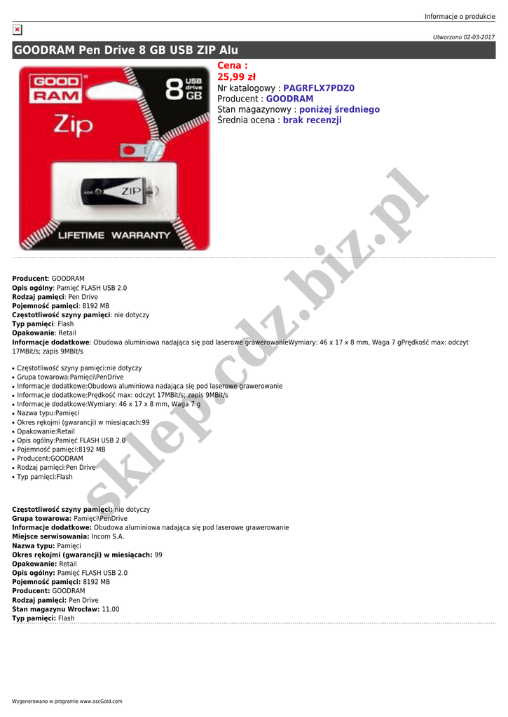 Informacje o produkcie Utworzono 02-03-2017 GOODRAM Pen Drive 8 GB USB ZIP Alu Cena : 25,99 zł iz .p l Nr katalogowy : PAGRFLX7PDZ0 Producent : GOODRAM Stan magazynowy : poniżej średniego Średnia ocena : brak recenzji ● ● ● ● ● ● ● ● ● ● .c ● Częstotliwość szyny pamięci:nie dotyczy Grupa towarowa:Pamięci\PenDrive Informacje dodatkowe:Obudowa aluminiowa nadająca się pod laserowe grawerowanie Informacje dodatkowe:Prędkość max: odczyt 17MBit/s; zapis 9MBit/s Informacje dodatkowe:Wymiary: 46 x 17 x 8 mm, Waga 7 g Nazwa typu:Pamięci Okres rękojmi (gwarancji) w miesiącach:99 Opakowanie:Retail Opis ogólny:Pamięć FLASH USB 2.0 Pojemność pamięci:8192 MB Producent:GOODRAM Rodzaj pamięci:Pen Drive Typ pamięci:Flash le p ● sk ● dz .b Producent: GOODRAM Opis ogólny: Pamięć FLASH USB 2.0 Rodzaj pamięci: Pen Drive Pojemność pamięci: 8192 MB Częstotliwość szyny pamięci: nie dotyczy Typ pamięci: Flash Opakowanie: Retail Informacje dodatkowe: Obudowa aluminiowa nadająca się pod laserowe grawerowanieWymiary: 46 x 17 x 8 mm, Waga 7 gPrędkość max: odczyt 17MBit/s; zapis 9MBit/s Częstotliwość szyny pamięci: nie dotyczy Grupa towarowa: Pamięci\PenDrive Informacje dodatkowe: Obudowa aluminiowa nadająca się pod laserowe grawerowanie Miejsce serwisowania: Incom S.A. Nazwa typu: Pamięci Okres rękojmi (gwarancji) w miesiącach: 99 Opakowanie: Retail Opis ogólny: Pamięć FLASH USB 2.0 Pojemność pamięci: 8192 MB Producent: GOODRAM Rodzaj pamięci: Pen Drive Stan magazynu Wrocław: 11.00 Typ pamięci: Flash Wygenerowano w programie www.oscGold.com