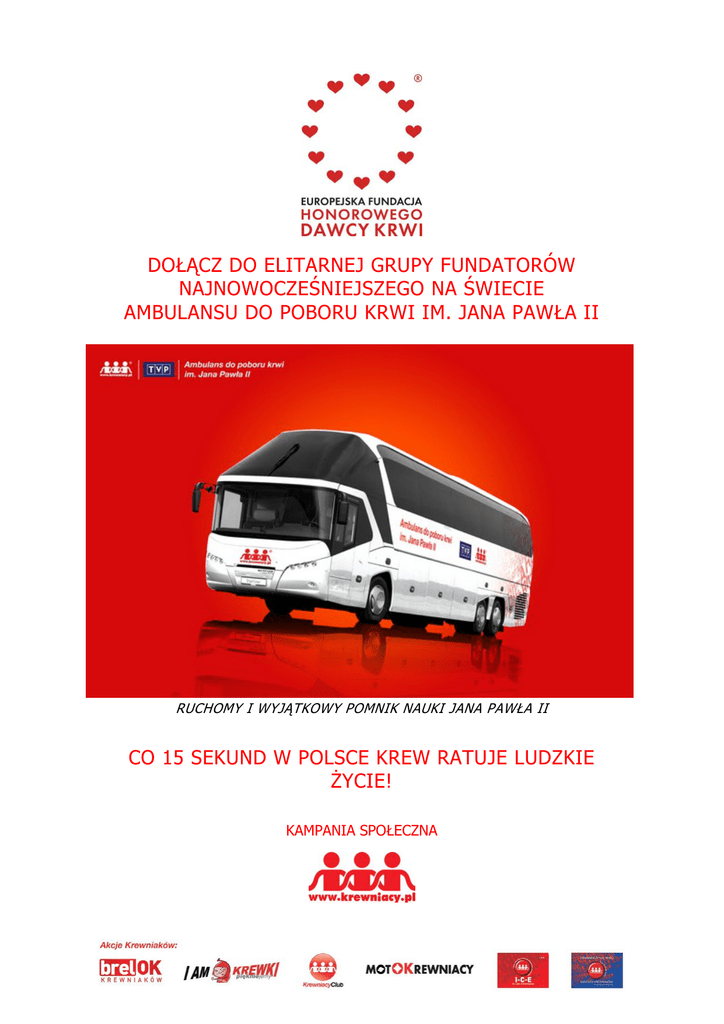DOŁĄCZ DO ELITARNEJ GRUPY FUNDATORÓW NAJNOWOCZEŚNIEJSZEGO NA ŚWIECIE AMBULANSU DO POBORU KRWI IM. JANA PAWŁA II RUCHOMY I WYJĄTKOWY POMNIK NAUKI JANA PAWŁA II CO 15 SEKUND W POLSCE KREW RATUJE LUDZKIE ŻYCIE! KAMPANIA SPOŁECZNA Szanowni Państwo! W Polsce co 15 sekund ludzkie życie zostaję ocalone dzięki podaniu krwi. Codziennie krew jest niezbędna w Polskich szpitalach. Dlatego Europejska Fundacja Honorowego Dawcy Krwi wraz z całą Rodziną Krewniaków od wielu lat aktywnie i z wieloma sukcesami uczestniczy w propagowaniu idei Honorowego Krwiodawstwa i Transplantacji. Nasze kampanie, w czasie których wraz z całym społeczeństwem zebraliśmy ponad 1,8 mln złotych, stały się największymi w historii TVP. Dziś zmienia się świadomość naszego społeczeństwa dotycząca krwiodawstwa i systematycznie zwiększa się liczba Honorowych Dawców Krwi co jest dla nas wielką radością, potwierdzeniem sensu naszych wysiłków i dodatkową motywacją do pracy. Obecny rok jest dla nas rokiem szczególnym. Jest to bowiem rok, w którym jesteśmy bliscy realizacji naszego wielkiego marzenia – uruchomienia ambulansu do poboru krwi im. Jana Pawła II. Został on zakupiony w 30-lecie pontyfikatu Jana Pawła II. Planujemy oddać go do użytku w dniach 13-14 czerwca w czasie obchodów Światowego Dnia Honorowego Dawcy Krwi. Nie będzie to ambulans podobny do innych, ale pojazd naprawdę niezwykły, najnowocześniejszy na świecie, wyposażony w taki sposób, by każdy Honorowy Dawca mógł poczuć się jeszcze bardziej wyjątkowo oddając krew. Ambulans ten będzie w nieustannym ruchu, odwiedzając rocznie setki największych imprez i miast w Polsce, na których pojawiać się będą znakomite osobistości i gwiazdy, które niejednokrotnie od lat wspierają już nasze kampanie. Nasz ambulans stanie się zapewne w szybkim tempie jednym z najbardziej rozpoznawalnych symboli Honorowego Krwiodawstwa. Dołożymy wszelkich starań, by ambulans przyjechał także do Waszego miasta! Całkowity koszt ambulansu wynosi 2,5 mln złotych. W obecnej chwili jesteśmy w końcowej fazie budowy i mimo dużego zaangażowania mediów i społeczeństwa wciąż brakuje 500 tys. zł. na zakończenie procesu zabudowy i wyposażania go w niezbędne do rozpoczęcia pracy sprzęty i urządzenia oraz na roczną eksploatację. Szanowni Państwo! Zapraszamy Państwa do budowy i wyposażania ambulansu Jana Pawła II. Tworzymy grupę 500 darczyńców, którzy mają okazję w szczególny sposób uczestniczyć we współtworzeniu tego wielkiego przedsięwzięcia. Przygotowaliśmy 500 miejsc na specjalnej tablicy pamiątkowej, którą umieścimy w widocznym i atrakcyjnym miejscu wewnątrz ambulansu. Jedno miejsce o rozmiarach ok. 2cm x 4cm na pamiątkowej tablicy przekazujemy do Państwa dyspozycji za przekazanie środków w wysokości nie mniej niż 1000 zł. Istnieje oczywiście możliwość zarezerwowania większej powierzchni na tablicy. Ilość oddanych do dyspozycji miejsc jest proporcjonalna do wysokości przekazanej darowizny. W ramach niniejszego projektu uruchomiona została także strona, która będzie elektroniczną reprezentacją rzeczywistej tablicy pamiątkowej, powstającej w ambulansie. Na stronie znajdą się także informacje na temat aktualnych dostępnych wolnych miejsc na tablicy i ich lokalizacji na tablicy. Każdy fundator otrzyma także ekskluzywny, metalowy brelok krwi z grupą krwi oraz wygrawerowaną dedykacją a także certyfikat z osobistymi podziękowaniami. Dar jaki mogą Państwo włożyć w budowę ambulansu może sprawić, że dzięki Wam już teraz w całej Polsce rozpocznie służbę pierwszy ambulans im. Jana Pawła II. Liczymy, że zechcą Państwo dołączyć do grona 500 szczególnych fundatorów, liczymy na Państwa otwartość i szeroki gest, bardzo ważny i potrzebny a którego efekt widoczny będzie każdego dnia w całej Polsce. Łączę pozdrowienia wraz z całą rodziną Krewniaków, którzy już dołączyli do nas w wysiłkach na rzecz propagowania idei Honorowego Krwiodawstwa i Transplantacji Marcin Boris Velinov (0 Rh+) prezes Europejskiej Fundacji Honorowego Dawcy Krwi Krewniakami zostali już między innymi: Olga Bończyk B Rh+, Kasia Cichopek A Rh+, Mariusz Czerkawski A Rh+, Renata Dancewicz B Rh+, Ewa Gawryluk A Rh+, Andrzej Grabarczyk A Rh-, Marcin Hakiel B Rh+, Krzysztof Ibisz 0 Rh+, Robert Korzeniowski AB Rh+, Roman Kosecki AB Rh-, Aida Kosjan B Rh+, Iwona Kubicz 0 Rh+, Marek Kościkiewicz 0 Rh+, Jacek Laszczkowski O Rh+, Małgorzata Lewińska A Rh+, Olaf Lubaszenko 0 Rh+, Laura Łącz AB Rh-, Patrycja Markowska AB Rh+, Michał Milowicz B Rh+, Marcin Mroczek 0 Rh+, Andrzej Nejman 0 Rh+, Radosław Pazura B Rh+, Anna Popek B Rh-, Justyna Sieńczyło A Rh+, Marek Siudym 0 Rh+, Tomasz Stockinger B Rh+, Andrzej Supron A Rh+, Piotr Szwedes A Rh+, Borys Szyc 0 Rh-, Grażyna Torbicka A Rh+, Dorota Wellman A Rh-, Kuba Wesołowski A Rh+, Agnieszka Włodarczyk A Rh+, Małgorzata Wyszyńska 0 Rh-, Marcin Velinov 0 Rh+, Piotr Zelt B Rh+
