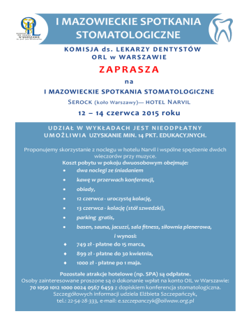 I MAZOWIECKIE SPOTKANIA STOMATOLOGICZNE KOMISJA ds. LEKAR ZY DENTY STÓW ORL w WARSZAWIE ZAPRASZA na I MAZOWIECKIE SPOTKANIA STOMATOLOGICZNE Serock (koło Warszawy)— hotel Narvil 12 – 14 czerwca 2015 roku UDZIAŁ W WYKŁADACH JEST NIEODPŁATNY U M O Ż L I W I A UZYSKANIE MIN. 14 PKT. EDUKACYJNYCH. Proponujemy skorzystanie z noclegu w hotelu Narvil i wspólne spędzenie dwóch wieczorów przy muzyce. Koszt pobytu w pokoju dwuosobowym obejmuje: dwa noclegi ze śniadaniem kawę w przerwach konferencji, obiady, 12 czerwca - uroczystą kolację, 13 czerwca - kolację (stół szwedzki), parking gratis, basen, sauna, jacuzzi, sala fitness, siłownia plenerowa, i wynosi: 749 zł - płatne do 15 marca, 899 zł - płatne do 30 kwietnia, 1000 zł - płatne po 1 maja. Pozostałe atrakcje hotelowe (np. SPA) są odpłatne. Osoby zainteresowane proszone są o dokonanie wpłat na konto OIL w Warszawie: 70 1050 1012 1000 0024 0567 6459 z dopiskiem konferencja stomatologiczna. Szczegółowych informacji udziela Elżbieta Szczepańczyk, tel.: 22-54-28-333, e-mail: [email protected] PIĄTEK, 12 CZERWCA 2015 ROKU 10.00 - 10.45 Rejestracja uczestników 10.45 Otwarcie konferencji 10.45 - 11.45 „Anafilaksja i stany nagłe w gabinecie stomatologicznym” cz.1 dr Marcin Aluchna i dr Jacek Smereka 11.45 - 12.00 P R Z E R W A K AW OW A 12.00- 12.45 „Anafilaksja i stany nagłe w gabinecie stomatologicznym” cz.2 dr Marcin Aluchna i dr Jacek Smereka 12.45 - 13.15 „Jak stosować antybiotyki w stomatologii? Etiologia, dawka, czas terapii” dr Elżbieta Puacz 13.15 - 14.00 „Bezpieczeństwo biologiczne stosowanych w stomatologii materiałów złożonych (uczulenia, nadwrażliwość pozabiegowa, działania niepożądane)” dr hab. Konrad Małkiewicz 14.00 - 15.00 P R Z E R W A O BI A D OW A 15.15 - 16.45 „Leczenie endodontyczne czy ekstrakcja, szanse i możliwości leczenia w sytuacji z pogranicza” dr Adrianna Adamek 16.45 - 17.00 P R Z E R W A K AW OW A 17.00 - 17.45 „Marketing a etyka czyli na co pozwala prawo” dr n. ekon. Magdalena Szumska 17.45 - 18.30 „Potęga wizerunku, znaczenie wyglądu lekarza i gabinetu, spójność wizerunku” dr Marcin Szumski 20.30 U R OC Z Y S T A K O L AC J A (NIESPODZIANKA WIECZORU) SOBOTA, 13 CZERWCA 2015 ROKU 9.00 - 9.45 „Żywienie a zdrowie jamy ustnej pacjentów w wieku rozwojowym” prof. dr hab. Dorota Olczak-Kowalczyk 9.45 - 10.45 „Okluzja statyczna i dynamiczna w leczeniu stomatologicznym” dr Andrzej Bożyk 10.45 - 10.55 P R Z E R W A K AW OW A 10.55 - 11.40 „Wirus HPV jako jeden z czynników powstawania raka jamy ustnej. Metody wizualizacji rozpoznawania zmian nowotworowych” lek. dent. Karolina Szaniawska, lek. dent. Tomasz Kamiński 11.40 - 12.10 „Współczesne trendy w leczeniu próchnicy ubytkowej” dr hab. Agnieszka Mielczarek 12.10 - 12.40 „Wykonywanie procedur minimalnie inwazyjnych w korekcie estetyki uzębienia” lek. dent. Karolina Kowalczyk 12.40 - 12.50 P R Z E R W A K A W O W A 12.50 - 13.30 „Trzeci wymiar w chirurgii stomatologicznej i implantologii – możliwości rozwiązywania problemów diagnostycznych w trudnych przypadkach klinicznych” dr hab. R. Koszowski 13.30 - 14.00 „Zabiegi kriochirurgiczne w schorzeniach jamy ustnej” dr J. Waskowska 14.00 - 15.00 P R Z E R W A O BI A D OW A 15.15 - 16.15 „Zadbajmy o własne zdrowie. Kinesiology Tape w medycynie, w tym w stomatologii oraz dla lek. stomatologów jako pacjentów” dr Z. Hamerlak 16.15 - 16.30 P R Z E R W A K AW OW A 16.30 - 18.00 „Prawo medyczne – personel medyczny działający w zespole, praktyczne aspekty odpowiedzialności prawnej” mec. P. Strzelec 20.00 K O L A C J A - S T Ó Ł SZ W E DZ KI (NIESPODZIANKA WIECZORU) W czasie, kiedy w głównej sali będą trwały wykłady, w trzech mniejszych salach będą prowadzone równolegle wykłady o innej tematyce i warsztaty, m.in. z endodoncji, pierwszej pomocy, Kinesiology Tape oraz odpłatnie (w kwocie ok. 55 zł) warsztaty z marketingu. Organizator zastrzega sobie możliwość wprowadzenia zmian w programie. Szczegółowe informacje na w w w . w a r s z a w a . o i l . o r g . p l zakładka „Szkolenia dla lekarzy dentystów”
