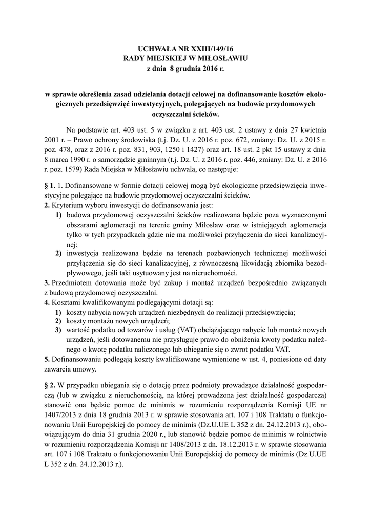 UCHWAŁA NR XXIII/149/16 RADY MIEJSKIEJ W MIŁOSŁAWIU z dnia 8 grudnia 2016 r. w sprawie określenia zasad udzielania dotacji celowej na dofinansowanie kosztów ekologicznych przedsięwzięć inwestycyjnych, polegających na budowie przydomowych oczyszczalni ścieków. Na podstawie art. 403 ust. 5 w związku z art. 403 ust. 2 ustawy z dnia 27 kwietnia 2001 r. – Prawo ochrony środowiska (t.j. Dz. U. z 2016 r. poz. 672, zmiany: Dz. U. z 2015 r. poz. 478, oraz z 2016 r. poz. 831, 903, 1250 i 1427) oraz art. 18 ust. 2 pkt 15 ustawy z dnia 8 marca 1990 r. o samorządzie gminnym (t.j. Dz. U. z 2016 r. poz. 446, zmiany: Dz. U. z 2016 r. poz. 1579) Rada Miejska w Miłosławiu uchwala, co następuje: § 1. 1. Dofinansowane w formie dotacji celowej mogą być ekologiczne przedsięwzięcia inwestycyjne polegające na budowie przydomowej oczyszczalni ścieków. 2. Kryterium wyboru inwestycji do dofinansowania jest: 1) budowa przydomowej oczyszczalni ścieków realizowana będzie poza wyznaczonymi obszarami aglomeracji na terenie gminy Miłosław oraz w istniejących aglomeracja tylko w tych przypadkach gdzie nie ma możliwości przyłączenia do sieci kanalizacyjnej; 2) inwestycja realizowana będzie na terenach pozbawionych technicznej możliwości przyłączenia się do sieci kanalizacyjnej, z równoczesną likwidacją zbiornika bezodpływowego, jeśli taki usytuowany jest na nieruchomości. 3. Przedmiotem dotowania może być zakup i montaż urządzeń bezpośrednio związanych z budową przydomowej oczyszczalni. 4. Kosztami kwalifikowanymi podlegającymi dotacji są: 1) koszty nabycia nowych urządzeń niezbędnych do realizacji przedsięwzięcia; 2) koszty montażu nowych urządzeń; 3) wartość podatku od towarów i usług (VAT) obciążającego nabycie lub montaż nowych urządzeń, jeśli dotowanemu nie przysługuje prawo do obniżenia kwoty podatku należnego o kwotę podatku naliczonego lub ubieganie się o zwrot podatku VAT. 5. Dofinansowaniu podlegają koszty kwalifikowane wymienione w ust. 4, poniesione od daty zawarcia umowy. § 2. W przypadku ubiegania się o dotację przez podmioty prowadzące działalność gospodarczą (lub w związku z nieruchomością, na której prowadzona jest działalność gospodarcza) stanowić ona będzie pomoc de minimis w rozumieniu rozporządzenia Komisji UE nr 1407/2013 z dnia 18 grudnia 2013 r. w sprawie stosowania art. 107 i 108 Traktatu o funkcjonowaniu Unii Europejskiej do pomocy de minimis (Dz.U.UE L 352 z dn. 24.12.2013 r.), obowiązującym do dnia 31 grudnia 2020 r., lub stanowić będzie pomoc de minimis w rolnictwie w rozumieniu rozporządzenia Komisji nr 1408/2013 z dn. 18.12.2013 r. w sprawie stosowania art. 107 i 108 Traktatu o funkcjonowaniu Unii Europejskiej do pomocy de minimis (Dz.U.UE L 352 z dn. 24.12.2013 r.). § 3. Dotacja przedsięwzięcia nastąpi w formie refundacji części poniesionych kosztów, pod warunkiem, że na inwestycję nie korzystano z innych możliwości dofinansowania ze środków publicznych. § 4. 1. Dotacja przysługuje w wysokości 50 % udokumentowanych kosztów kwalifikowanych realizacji inwestycji, jednak nie więcej niż 3 000,00 zł (słownie: trzy tysiące złotych) brutto. 2. W przypadku budowy jednej oczyszczalni ścieków przeznaczonej dla dwóch lub więcej budynków mieszkalnych oraz budynków wielolokalowych dotacja przysługuje w wysokości 50 % udokumentowanych poniesionych kosztów kwalifikowanych, lecz nie więcej niż 5 000,00 zł (słownie: pięć tysięcy złotych) brutto. § 5. 1. Dotacji udziela się na wniosek złożony w Urzędzie Gminy w Miłosławiu. 2. Wniosek o udzielenie dotacji winien zawierać: 1) imię i nazwisko lub nazwę wnioskodawcy; 2) NIP lub REGON; 3) adres, siedzibę wnioskodawcy; 4) numer kontaktowy, adres poczty elektronicznej; 5) miejsce realizacji budowy oczyszczalni ścieków (adres, numer ewidencyjny i obręb geodezyjny działki); 6) określenie przedsięwzięcia, w tym planowany koszt i termin realizacji; 7) wskazanie tytułu prawnego do nieruchomości, na której będzie realizowana budowa oczyszczalni ścieków; 8) datę i podpis wnioskodawcy. § 6. Do wniosku należy dołączyć: 1) kopie dokumentów potwierdzających legalność planowanej budowy oczyszczalni ścieków (pozwolenie na budowę lub potwierdzenie zgłoszenia rozpoczęcia budowy oczyszczalni w Starostwie Powiatowym we Wrześni.); 2) oświadczenie wnioskodawcy o przysługiwaniu lub nieprzysługiwaniu prawa do obniżenia kwoty podatku należnego o kwotę podatku naliczonego lub ubieganie się o zwrot podatku VAT; 3) wszystkie zaświadczenia o pomocy de minimis oraz pomocy de minimis w rolnictwie lub rybołówstwie, jakie wnioskodawca otrzymał w roku podatkowym, w którym ubiega się o pomoc oraz w ciągu dwóch poprzedzających go lat podatkowych albo oświadczenie o wielkości pomocy de minimis, de minimis w rolnictwie lub w rybołówstwie, jakie otrzymał w tym okresie, albo oświadczenie o nieotrzymaniu takiej pomocy w tym okresie; 4) inne niezbędne informacje do udzielenia pomocy de minimis, określone w rozporządzeniu Rady Ministrów z dnia 29 marca 2010r. w sprawie zakresu informacji przedstawianych przez podmiot ubiegający się o pomoc de minimis (Dz. U. z 2010 r. Nr 53, poz. 311 z późn. zm.) lub w rozporządzeniu Rady Ministrów z dnia 11 czerwca 2010 r. w sprawie zakresu informacji składanych przez podmioty ubiegające się o pomoc de minimis w rolnictwie lub rybołówstwie (Dz. U. z 2010 r. Nr 121, poz. 810). § 7. W przypadku błędów we wniosku Burmistrz Gminy wzywa wnioskodawcę do jego uzupełnienia w wyznaczonym terminie, pod rygorem pozostawienia wniosku bez rozpoznania. § 8. 1. Burmistrz Gminy najpóźniej w terminie 30 dni od daty wpływu kompletnego i poprawnego wniosku zawiadamia wnioskodawcę o miejscu i terminie zawarcia umowy o dotację. Wyznaczony termin nie może być krótszy niż 7 dni od dnia doręczenia zawiadomienia. 2. O odmowie udzielenia dotacji i przyczynach