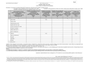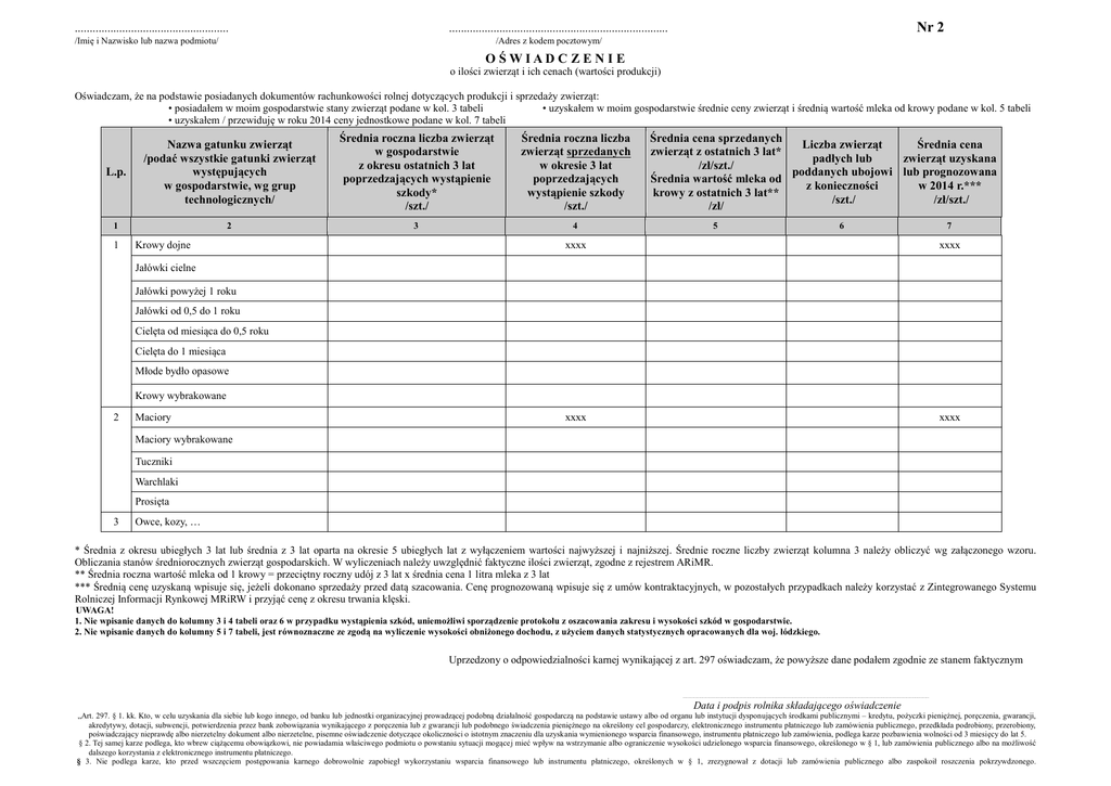 .................................................... Nr 2 .......................................................................... /Imię i Nazwisko lub nazwa podmiotu/ /Adres z kodem pocztowym/ O ŚWIAD C ZEN I E o ilości zwierząt i ich cenach (wartości produkcji) Oświadczam, że na podstawie posiadanych dokumentów rachunkowości rolnej dotyczących produkcji i sprzedaży zwierząt: • posiadałem w moim gospodarstwie stany zwierząt podane w kol. 3 tabeli • uzyskałem w moim gospodarstwie średnie ceny zwierząt i średnią wartość mleka od krowy podane w kol. 5 tabeli • uzyskałem / przewiduję w roku 2014 ceny jednostkowe podane w kol. 7 tabeli L.p. Nazwa gatunku zwierząt /podać wszystkie gatunki zwierząt występujących w gospodarstwie, wg grup technologicznych/ Średnia roczna liczba zwierząt w gospodarstwie z okresu ostatnich 3 lat poprzedzających wystąpienie szkody* /szt./ Średnia roczna liczba zwierząt sprzedanych w okresie 3 lat poprzedzających wystąpienie szkody /szt./ 1 2 3 4 1 Krowy dojne Średnia cena sprzedanych Liczba zwierząt Średnia cena zwierząt z ostatnich 3 lat* padłych lub zwierząt uzyskana /zł/szt./ poddanych ubojowi lub prognozowana Średnia wartość mleka od z konieczności w 2014 r.*** krowy z ostatnich 3 lat** /szt./ /zł/szt./ /zł/ 5 6 7 xxxx xxxx xxxx xxxx Jałówki cielne Jałówki powyżej 1 roku Jałówki od 0,5 do 1 roku Cielęta od miesiąca do 0,5 roku Cielęta do 1 miesiąca Młode bydło opasowe Krowy wybrakowane 2 Maciory Maciory wybrakowane Tuczniki Warchlaki Prosięta 3 Owce, kozy, … * Średnia z okresu ubiegłych 3 lat lub średnia z 3 lat oparta na okresie 5 ubiegłych lat z wyłączeniem wartości najwyższej i najniższej. Średnie roczne liczby zwierząt kolumna 3 należy obliczyć wg załączonego wzoru. Obliczania stanów średniorocznych zwierząt gospodarskich. W wyliczeniach należy uwzględnić faktyczne ilości zwierząt, zgodne z rejestrem ARiMR. ** Średnia roczna wartość mleka od 1 krowy = przeciętny roczny udój z 3 lat x średnia cena 1 litra mleka z 3 lat *** Średnią cenę uzyskaną wpisuje się, jeżeli dokonano sprzedaży przed datą szacowania. Cenę prognozowaną wpisuje się z umów kontraktacyjnych, w pozostałych przypadkach należy korzystać z Zintegrowanego Systemu Rolniczej Informacji Rynkowej MRiRW i przyjąć cenę z okresu trwania klęski. UWAGA! 1. Nie wpisanie danych do kolumny 3 i 4 tabeli oraz 6 w przypadku wystąpienia szkód, uniemożliwi sporządzenie protokołu z oszacowania zakresu i wysokości szkód w gospodarstwie. 2. Nie wpisanie danych do kolumny 5 i 7 tabeli, jest równoznaczne ze zgodą na wyliczenie wysokości obniżonego dochodu, z użyciem danych statystycznych opracowanych dla woj. łódzkiego. Uprzedzony o odpowiedzialności karnej wynikającej z art. 297 oświadczam, że powyższe dane podałem zgodnie ze stanem faktycznym ......................................................................................................................................................................................................................................................... Data i podpis rolnika składającego oświadczenie „Art. 297. § 1. kk. Kto, w celu uzyskania dla siebie lub kogo innego, od banku lub jednostki organizacyjnej prowadzącej podobną działalność gospodarczą na podstawie ustawy albo od organu lub instytucji dysponujących środkami publicznymi – kredytu, pożyczki pieniężnej, poręczenia, gwarancji, akredytywy, dotacji, subwencji, potwierdzenia przez bank zobowiązania wynikającego z poręczenia lub z gwarancji lub podobnego świadczenia pieniężnego na określony cel gospodarczy, elektronicznego instrumentu płatniczego lub zamówienia publicznego, przedkłada podrobiony, przerobiony, poświadczający nieprawdę albo nierzetelny dokument albo nierzetelne, pisemne oświadczenie dotyczące okoliczności o istotnym znaczeniu dla uzyskania wymienionego wsparcia finansowego, instrumentu płatniczego lub zamówienia, podlega karze pozbawienia wolności od 3 miesięcy do lat 5. § 2. Tej samej karze podlega, kto wbrew ciążącemu obowiązkowi, nie powiadamia właściwego podmiotu o powstaniu sytuacji mogącej mieć wpływ na wstrzymanie albo ograniczenie wysokości udzielonego wsparcia finansowego, określonego w § 1, lub zamówienia publicznego albo na możliwość dalszego korzystania z elektronicznego instrumentu płatniczego. § 3. Nie podlega karze, kto przed wszczęciem postępowania karnego dobrowolnie zapobiegł wykorzystaniu wsparcia finansowego lub instrumentu płatniczego, określonych w § 1, zrezygnował z dotacji lub zamówienia publicznego albo zaspokoił roszczenia pokrzywdzonego. Wzory do obliczania stanów średniorocznych zwierząt gospodarskich i przelotowości (średniej rocznej liczby zwierząt) WYJAŚNIENIA DO OBROTU STADA Sztuki przelotowe są to sztuki, które przeszły przez daną grupę technologiczną w ciągu roku, (które przebywały w danej grupie technologicznej w ciągu roku). Przelotowość, stan przelotowy – to liczba zwierząt, które przeszły przez daną grupę technologiczną w ciągu roku. Stan średnioroczny – to średnia liczba zwierząt w poszczególnych grupach technologicznych. Stan średnioroczny to okres 12 miesięcy. OBLICZANIE PRZELOTOWOŚCI I STANÓW ŚREDNIOROCZNYCH: A. Dla zwierząt przebywających w grupie technologicznej rok lub dłużej Przelotowość = stan średnioroczny Stan średnioroczny = (stan na początek roku + stan na koniec roku) / 2 B. Dla zwierząt przebywających w grupie technologicznej krócej niż 1 rok Przelotowość = sztuki na sprzedaż + na przeklasowanie + 0,5 upadków i ubojów z konieczności + 0,5 stanu na koniec roku – 0,5 stanu na początek roku Stan średnioroczny = (przelotowość x ilość miesięcy przebywania w klasie) / 12