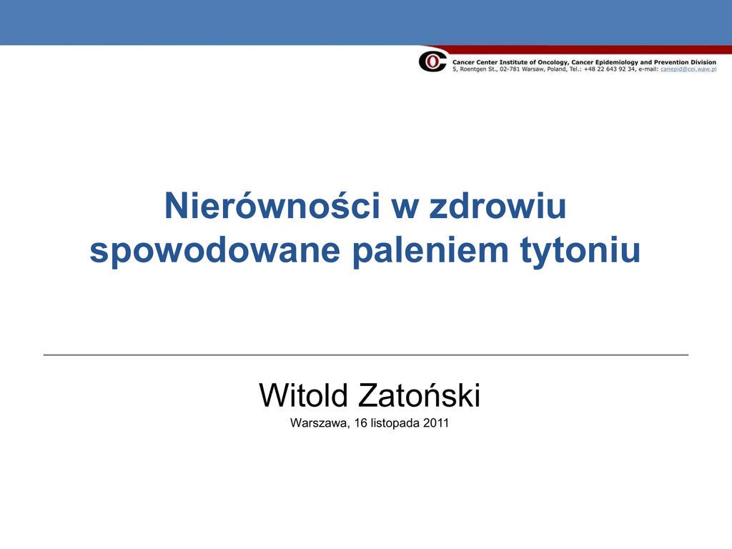Nierówności w zdrowiu spowodowane paleniem tytoniu Witold Zatoński Warszawa, 16 listopada 2011 Palenie tytoniu wywołuje w Europie, więcej szkód zdrowotnych niż alkohol, nadciśnienie tętnicze, otyłość, wysoki poziom cholesterolu i choroby zakaźne razem wzięte. Źródło: Zatoński W (ed.) with Mańczuk M, Sulkowska U, and the HEM Project team. Closing the health gap in European Union. Cancer Center and Institute of Oncology, Warsaw, 2008. Available from: http://www.hem.waw.pl W. Zatoński, 2011 2 Prawdopodobieństwo zgonu przed ukończeniem 65 r.ż., w krajach UE, 2008* Kobiety 7% 7% 7% 8% 8% 8% 8% 8% 9% 9% 9% 9% 9% 9% 10% 10% 11% 11% 12% 13% 13% 13% 14% 15% 16% 16% 17% 23% 100% 80% 60% W. Zatoński, 2011 40% 20% Mężczyźni Hiszpania Grecja Włochy Luksemburg Szw ecja Austria Portugalia UE15 Francja Finlandia Słowenia Niemcy Irlandia Holandia Belgia Wlk. Bryt. Czechy Dania Polska Słowacja Estonia UE10 Bułgaria Rumunia Węgry Łotwa Litw a Rosja 0% Szwecja Hiszpania Włochy Luksemburg Irlandia Wlk. Bryt. Hiszpania UE15 Austria Grecja Niemcy Belgia Dania Francja Portugalia Finlandia Słowenia Czechy Polska UE10 Słow acja Bułgaria Rumunia Węgry Estonia Łotwa Litwa Rosja 12% 13% 13% 14% 14% 15% 15% 16% 16% 16% 17% 18% 18% 18% 18% 19% 20% 23% 30% 31% 31% 32% 32% 34% 36% 40% 42% Bardzo istotne różnice w Europie: Jedynie 7% kobiet w Hiszpanii umiera przed 65 rokiem życia Ponad 50% mężczyzn w Rosji nie dożywa wieku 65 lat 54% 0% 20% 40% 60% 80% 100% * 2005: Belgia; 2006: Dania, Niemcy, Rosja; 2007: Włochy 3 Udział tytoniu w różnicy w oczekiwanej długości życia pomiędzy UE10 i UE15, 2002 Różnica przypisana do tytoniu mężczyźni Grupa wieku Różnica w oczekiwanej długości życia (lata) Różnica przypisana do tytoniu (lata) % 35-64 3.80 1.75 46% Grupa wieku Różnica w oczekiwanej długości życia (lata) Różnica przypisana do tytoniu (lata) % 35-64 1.42 0.28 20% kobiety W. Zatoński, 2011 4 Zmiany w postawach wobec palenia w Polsce, 1974-2010 W. Zatoński, 2011 5 Odsetek codziennych palaczy w Polsce (wśród osób w wieku 20 i więcej lat), 1974-2010 Mężczyźni Kobiety 65 30 62.4 26.1 60 25.2 23.5 25 55 25.8 25.4 22.1 54.8 20 18.6 50.5 % % 50 45 44.6 43.4 41.4 40 10 35.1 35 15 30 1974 1985- 1990- 1995- 2000- 2005- 20091989 1994 1999 2004 2008 2010 5 0 1974 1985- 1990- 1995- 2000- 2005- 20091988 1994 1999 2004 2008 2010 Źródło: dane Centrum Onkologii – Instytutu im. Marii Sklodowskiej-Curie (1974-2008), Globalny sondaż dotyczący używania tytoniu przez osoby dorosłe (GATS) (2009-2010) W. Zatoński, 2011 6 Narażenie na dym tytoniowy (w %) w zakładach pracy i lokalach gastronomicznych w Polsce przed (VII 2009) i po wprowadzeniu zakazu palenia (II i X 2011 r.) W. Zatoński, 2011 7 W. Zatoński, 2011 óps W dnat s 01 a n i ki nnyz cł óps W i cś onl ar ei mu e na woz yr a dnat s ij cal upop 000, 001 a n Umieralność z powodu nowotworów płuca, mężczyźni, Polska 18 16 14 12 10 8 6 4 2 0 1950 350 35-44 1970 1990 2010 55-64 110 99 88 77 66 55 44 33 22 11 0 1950 550 300 45-54 1970 1990 2010 65-74 440 250 200 330 150 220 100 110 50 0 1950 1970 1990 2010 0 1950 1970 1990 2010 8 Najważniejsze wyzwania W. Zatoński, 2011 9 Efektywne finansowanie polityki ograniczającej używanie tytoniu ze środków pochodzących z podatku akcyzowego od wyrobów tytoniowych Wprowadzenie w życie progresywnej polityki podatkowej i cenowej odnośnie wyrobów tytoniowych Medykalizacja leczenia uzależnienia od tytoniu Wprowadzenie obrazkowych ostrzeżeń zdrowotnych na paczkach papierosów W. Zatoński, 2011 10 Rekomendacje uczestników Konferencji Ministerialnej UE „Solidarność w zdrowiu. Wyrównanie różnic zdrowotnych między krajami Unii Europejskiej” (Poznań, 7-8 listopada 2011) Aby zamknąć lukę zdrowotną pomiędzy państwami członkowskimi UE, konieczne jest skupienie polityki zdrowotnej na programach związanych z prewencją i promocją zdrowia. Dotyczy to zwłaszcza krajów Europy środkowej i wschodniej. Kluczowym elementem programów prewencyjnych oraz promujących zdrowie powinno być wzmacnianie polityki ograniczającej używanie tytoniu. Prowadzenie progresywnej polityki podatkowej i cenowej odnośnie wyrobów tytoniowych może stanowić impuls niezbędny do wzmocnienia polityki ograniczającej używanie tytoniu w UE. Przykład Francji pokazuje, że gwałtowny wzrost podatków od wyrobów tytoniowych przyczynia się do szybkiego spadku spożycia papierosów oraz natychmiastowej poprawy wskaźników zdrowotnych. Jednocześnie zaobserwowano błyskawiczny wzrost dochodów pochodzących z akcyzy na wyroby tytoniowe. Kraje mające wkrótce objąć Prezydencję UE zadeklarowały podjęcie inicjatywy zmierzającej do harmonizacji polityki podatkowej dotyczącej wyrobów tytoniowych w Unii Europejskiej. W. Zatoński, 2011 11 Czarny: dzienne spożycie papierosów per capita we Francji (dane dla osób w wieku 15 i więcej lat) Niebieski: cena papierosów we Francji (dane uwzględniają inflację, 1990=100) Źródło: Peto R, 2011 300 Spożycie 200 Cena 100 0 W. Zatoński, 2011 12 FRANCJA 1950-2009. Śmiertelność zw. z rakiem płuca wśród Współczynnik umieralności / 100 000, standaryzowany wg wieku* kobiet i mężczyzn w wieku 35-44 lat *Średnia roczna wartość zliczona dla dwóch pięcioletnich grup wiekowych Źródło: Peto R, 2011 W. Zatoński, 2011 13 Government income from tobacco, 14 Wpływy z akcyzy od wyrobów tytoniowych 12 Billions, 2007 euros Miliardy EURO (wg wartości w 2007 r.) 10 8 6 4 2 0 1960 1970 1980 1990 2000 2010 Źródło: Peto R, 2011 W. Zatoński, 2011 14 W. Zatoński, 2011 15