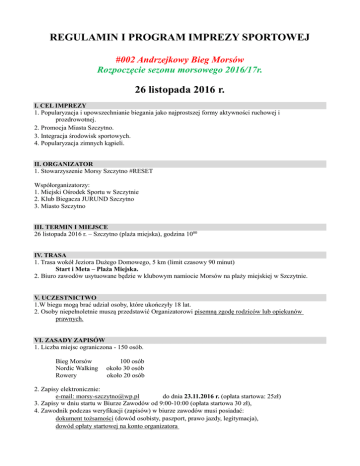 REGULAMIN I PROGRAM IMPREZY SPORTOWEJ #002 Andrzejkowy Bieg Morsów Rozpoczęcie sezonu morsowego 2016/17r. 26 listopada 2016 r. I. CEL IMPREZY 1. Popularyzacja i upowszechnianie biegania jako najprostszej formy aktywności ruchowej i prozdrowotnej. 2. Promocja Miasta Szczytno. 3. Integracja środowisk sportowych. 4. Popularyzacja zimnych kąpieli. II. ORGANIZATOR 1. Stowarzyszenie Morsy Szczytno #RESET Współorganizatorzy: 1. Miejski Ośrodek Sportu w Szczytnie 2. Klub Biegacza JURUND Szczytno 3. Miasto Szczytno III. TERMIN I MIEJSCE 26 listopada 2016 r. – Szczytno (plaża miejska), godzina 1000 IV. TRASA 1. Trasa wokół Jeziora Dużego Domowego, 5 km (limit czasowy 90 minut) Start i Meta – Plaża Miejska. 2. Biuro zawodów usytuowane będzie w klubowym namiocie Morsów na plaży miejskiej w Szczytnie. V. UCZESTNICTWO 1.W biegu mogą brać udział osoby, które ukończyły 18 lat. 2. Osoby niepełnoletnie muszą przedstawić Organizatorowi pisemną zgodę rodziców lub opiekunów prawnych. VI. ZASADY ZAPISÓW 1. Liczba miejsc ograniczona - 150 osób. Bieg Morsów Nordic Walking Rowery 100 osób około 30 osób około 20 osób 2. Zapisy elektronicznie: e-mail: [email protected] do dnia 23.11.2016 r. (opłata startowa: 25zł) 3. Zapisy w dniu startu w Biurze Zawodów od 9:00-10:00 (opłata startowa 30 zł), 4. Zawodnik podczas weryfikacji (zapisów) w biurze zawodów musi posiadać: dokument tożsamości (dowód osobisty, paszport, prawo jazdy, legitymacja), dowód opłaty startowej na konto organizatora 5. Każdy zawodnik musi podpisać KARTĘ ZGŁOSZENIOWĄ z oświadczeniem o zapoznaniu się z regulaminem. VII. WPISOWE 1. 25 zł elektroniczne zapisy do 23.11.2016 r. 2. 30 zł zapisy w dniu biegu (26.11.2016 r.), godzina 9:00- 10:00 Opłatę wpisową należy dokonać na konto: …………………………………. tytułem: „imię i nazwisko, andrzejkowy bieg morsów” Adres: 3. Opłata wpisowa nie podlega zwrotowi - oprócz ustawowych 14 dni, które przysługują konsumentowi na odstąpienie od umowy zawiązanej na odległość. Zwrot nastąpi w terminie 14 dni. 4. Opłata startowa nie może być przeniesiona na innego zawodnika oraz nie można dokonać zamiany danych w zgłoszeniu po opłaceniu wpisowego. 5. Pakiet startowy: - numer startowy (do przypięcia w widocznym miejscu), - napój/baton energetyczny (zależnie od możliwości Organizatora), - czapka, - kubek, - ciepły posiłek (na bazie MOS) 6. Uczestnicy Imprez Towarzyszących (goście, mieszkańcy, spacerowicze) wstęp bezpłatny. VIII. KLASYFIKACJE W BIEGU 1. BIEG MORSÓW OPEN Kobiety – miejsca I-III OPEN Mężczyźni – miejsca I-III 2. Nordic Walking – miejsca I-III 3. Rowery – miejsca I-III IX. NAGRODY 1. Pamiątkowy medal okolicznościowy (pod warunkiem ukończenia biegu w limicie czasowym 90 minut). 2. Po zakończeniu Imprezy zostaną wręczone: PUCHARY za Andrzejkowy Bieg Morsów - Kobiety – miejsce I-III - Mężczyźni – miejsce I-III PUCHARY dla Nordic Walking: - miejsce I-III STATUETKI dla Rowerzystów: - miejsce I-III 3. Dodatkowo wśród wszystkich uczestników (Biegacze, Nordicusy i Rowerzyści), którzy ukończyli bieg zostaną rozlosowane nagrody dodatkowe (do odbioru nagrody upoważnia „numer startowy zawodnika”). 4. Inne nagrody – dodatkowo ustalone przez Organizatora – przyznawane w wyjątkowych sytuacjach. X. IMPREZY TOWARZYSZĄCE 1.OFICJALNE Rozpoczęcie Sezonu Morsowego 2016/17 r. i działalności Stowarzyszenia. 2. Spotkanie z Gościem Specjalnym. 3. Biesiada na Bazie Miejskiego Ośrodka Sportu. PROGRAM MINUTOWY Lp Godz. Wydarzenie 1 9:00-10:00 Otwarcie Biura Zawodów, Zapisy, Potwierdzenie udziału, Odbiór pakietów startowych 2 10:30 Instruktarz Nordic Walking (wskazówki dla początkujących) Wykwalifikowany Instruktor: Regina Wiereszko-Czyż 3 10:30 START Rowery, 5 km 4 10:40 START Nordic Walking, 5 km 5 11:00 START Bieg Morsów, 5 km 6 ok.10:00-12:00 Spotkanie z Gościem Specjalnym Przeciąganie liny: „Drużynowe Mistrzostwa Super Fok” – konkurencja tylko dla Pań! 7 11:40 Rozgrzewka przed kąpielą Morsów – prowadzi Marta Nagadowska 8 11:50 Morsowanie i RESET 9 ok. 12:10 Dekoracja zwycięzców i losowanie nagród 10 ok. 12:30 Poczęstunek na bazie wodnej dla uczestników Imprezy XI. BEZPIECZEŃSTWO 1. Uczestnicy biegu nie będą ubezpieczeni od następstw nieszczęśliwych wypadków, należy ubezpieczyć się samemu indywidualnie. 2. Organizator zapewnia uczestnikom opiekę medyczną w trakcie trwania imprezy. 3. Impreza będzie ubezpieczona od odpowiedzialności cywilnej Organizatora. 4. Niezależnie od powyższego, Organizator zastrzega sobie prawo do: - ściągnięcia uczestnika z trasy biegu, gdy uzna jego stan za wymagający interwencji medycznej - dyskwalifikacji uczestnika biegu w przypadku nieprzestrzegania zasad regulaminu, narażania zdrowia/życia swojego lub innych uczestników biegu, wolontariuszy, kibiców i innych. XII. DANE OSOBOWE I OCHRONA WIZERUNKU 1. Wszyscy uczestnicy biegu wyrażają zgodę na przetwarzanie danych osobowych do celów związanych z realizacją zawodów. 2. Wszyscy uczestnicy biegu wyrażają zgodę na publikację ich wizerunku w relacjach z imprezy zamieszczonych na stronie, w mediach i materiałach promocyjnych biegu. XIII. POSTANOWIENIA KOŃCOWE 1. Bieg odbędzie się bez względu na warunki atmosferyczne. 2. Bieg z pomiarem czasu. 3. Uczestnicy podzieleni zostaną na dwie grupy i wystartują w różnych odstępach czasowych. ROWERZYŚCI 10:30 NORDIC WALKING 10:40 BIEGACZE 11:00 4. Za rzeczy pozostawione lub zagubione organizator nie ponosi odpowiedzialności. 5. Organizator zastrzega sobie prawo do upubliczniania wyników biegów, do publikacji o przebiegu zawodów oraz do zamieszczania zdjęć na stronach internetowych, w prasie i w telewizji. 6. Organizator zapewnia sędziego prowadzącego oraz zamykającego bieg. 7. We wszystkich sprawach nieujętych Regulaminem decyduje Organizator biegu. 8. Organizator zastrzega 