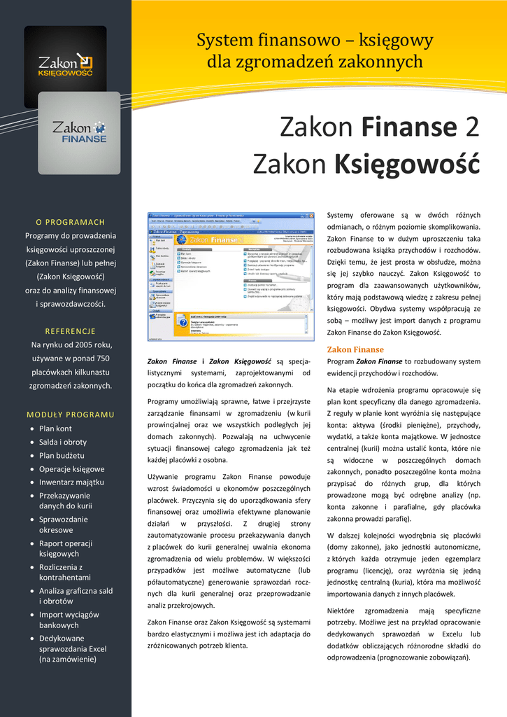 System finansowo – księgowy dla zgromadzeń zakonnych Zakon Ewid Zakon Finanse 2 Zakon Księgowość Systemy oferowane są w dwóch różnych O P ROG RAMACH (Zakon Finanse) lub pełnej odmianach, o różnym poziomie skomplikowania. Zakon Finanse to w dużym uproszczeniu taka rozbudowana książka przychodów i rozchodów. Dzięki temu, że jest prosta w obsłudze, można (Zakon Księgowośd) się jej szybko nauczyd. Zakon Księgowośd to Programy do prowadzenia księgowości uproszczonej program dla zaawansowanych użytkowników, oraz do analizy finansowej który mają podstawową wiedzę z zakresu pełnej księgowości. Obydwa systemy współpracują ze sobą – możliwy jest import danych z programu i sprawozdawczości. RE FE RE NCJE Zakon Finanse do Zakon Księgowośd. Na rynku od 2005 roku, Zakon Finanse używane w ponad 750 Zakon Finanse i Zakon Księgowość są specja- placówkach kilkunastu listycznymi zgromadzeo zakonnych. MODUŁY P ROG RAMU Plan kont Salda i obroty Plan budżetu Operacje księgowe Inwentarz majątku Przekazywanie danych do kurii Sprawozdanie okresowe Raport operacji księgowych Rozliczenia z kontrahentami Analiza graficzna sald i obrotów Import wyciągów bankowych Dedykowane sprawozdania Excel (na zamówienie) systemami, zaprojektowanymi od początku do kooca dla zgromadzeo zakonnych. Program Zakon Finanse to rozbudowany system ewidencji przychodów i rozchodów. Na etapie wdrożenia programu opracowuje się Programy umożliwiają sprawne, łatwe i przejrzyste zarządzanie finansami w zgromadzeniu (w kurii plan kont specyficzny dla danego zgromadzenia. Z reguły w planie kont wyróżnia się następujące prowincjalnej oraz we wszystkich podległych jej domach zakonnych). Pozwalają na uchwycenie konta: aktywa (środki pieniężne), przychody, wydatki, a także konta majątkowe. W jednostce centralnej (kurii) można ustalid konta, które nie sytuacji finansowej całego zgromadzenia jak też każdej placówki z osobna. Używanie programu Zakon Finanse powoduje wzrost świadomości u ekonomów poszczególnych placówek. Przyczynia się do uporządkowania sfery finansowej oraz umożliwia efektywne planowanie działao w przyszłości. Z drugiej strony zautomatyzowanie procesu przekazywania danych są widoczne w poszczególnych domach zakonnych, ponadto poszczególne konta można przypisad do różnych grup, dla których prowadzone mogą byd odrębne analizy (np. konta zakonne i parafialne, gdy placówka zakonna prowadzi parafię). W dalszej kolejności wyodrębnia się placówki z placówek do kurii generalnej uwalnia ekonoma (domy zakonne), jako jednostki autonomiczne, zgromadzenia od wielu problemów. W większości z których każda otrzymuje jeden egzemplarz przypadków jest możliwe automatyczne (lub półautomatyczne) generowanie sprawozdao rocz- programu (licencję), oraz wyróżnia się jedną jednostkę centralną (kuria), która ma możliwośd nych dla kurii generalnej oraz przeprowadzanie importowania danych z innych placówek. analiz przekrojowych. Niektóre zgromadzenia mają specyficzne Zakon Finanse oraz Zakon Księgowośd są systemami potrzeby. Możliwe jest na przykład opracowanie bardzo elastycznymi i możliwa jest ich adaptacja do zróżnicowanych potrzeb klienta. dedykowanych sprawozdao w Excelu lub dodatków obliczających różnorodne składki do odprowadzenia (prognozowanie zobowiązao). Księgowanie dokumentów jest czynnością łatwą, szybką Etapy wdrożenia systemu i przyjemną. Program wykorzystuje podpowiedzi, dzięki czemu użytkownik czuje się pewnie i komfortowo. Każda operacja jest Wdrożenie oferowanego oprogramowania realizowane jest związana z kontem środków finansowych (np. rachunek bankowy lub kasa podręczna - potocznie zwana gotówką). Klasyfikacja operacji jako przychodu lub rozchodu na konkretny cel następuje po wybraniu konta pomocniczego. Te dwie informacje oraz kwota operacji są niezbędnym minimum. Oprócz tego można wprowadzid dane kontrahenta, numer faktury, uwagi, wskazad fundusz celowy albo wyróżnid operację kolorem. w kilku etapach. W pierwszym etapie nasi specjaliści analizują potrzeby Klienta, przedstawiają na przykładach możliwości systemu i rekomendują najkorzystniejsze rozwiązania. Efektem tego etapu jest wypracowanie harmonogramu wdrożenia, uzgodnienie planu kont oraz listy ewentualnych dodatków do programu (np. formularzy sprawozdao w Excelu, algorytmów przeliczających wysokośd zobowiązao lub dotacji, funkcji do uzupełnienia oraz innych elementów). Program obsługuje także konta walutowe, automatycznie pobierając z Internetu średnie kursy NBP na dany dzieo. Bardzo duże możliwości stwarza obsługa funduszy celowych Drugi etap obejmuje zainstalowanie programu w jednostce centralnej oraz w wybranych (lub we wszystkich) placówkach i precyzyjnego rozliczania zarówno wpłat jak i wydatków na celem zweryfikowania poprawności struktury planu kont, określony cel (pieniądze mogą się przy tym znajdowad na formularzy sprawozdao i raportów. różnych kontach). Rozliczenia z kontrahentami wspiera specjalny moduł. Możliwe jest automatyczne importowanie Ostatnim etapem wdrożenia jest szkolenie dla przyszłych użytkowników systemu. Nasi specjaliści przekazują wiedzę wyciągów operacji na koncie dla niektórych systemów z zakresu księgowości zarządczej a następnie na przykładach uczą bankowości internetowej. Całośd dopełnia planowanie budżetu, pracy z programem. Każdy z uczestników szkolenia otrzymuje płytę CD z programem oraz materiały szkoleniowe. inwentarz majątku, sprawozdania okresowe i raport operacji. W ustalonych okresach (miesiące, kwartały, półrocza) placówki sporządzają sprawozdanie i wysyłają je w formie zaszyfrowanej pocztą elektroniczną do kurii (jednostki centralnej). Placówki nie Firma Ecclesia Software współpracuje ze specjalistami z zakresu księgowości i świadczy usługi doradcze na każdym etapie posiadające te