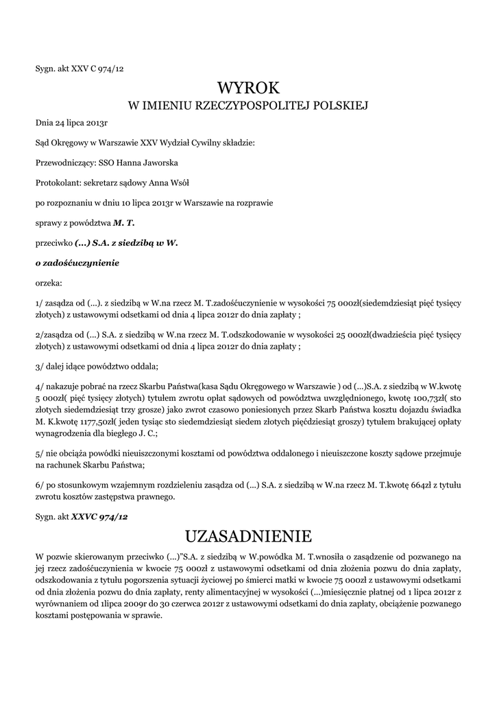 Sygn. akt XXV C 974/12 WYROK W IMIENIU RZECZYPOSPOLITEJ POLSKIEJ Dnia 24 lipca 2013r Sąd Okręgowy w Warszawie XXV Wydział Cywilny składzie: Przewodniczący: SSO Hanna Jaworska Protokolant: sekretarz sądowy Anna Wsół po rozpoznaniu w dniu 10 lipca 2013r w Warszawie na rozprawie sprawy z powództwa M. T. przeciwko (...) S.A. z siedzibą w W. o zadośćuczynienie orzeka: 1/ zasądza od (...). z siedzibą w W.na rzecz M. T.zadośćuczynienie w wysokości 75 000zł(siedemdziesiąt pięć tysięcy złotych) z ustawowymi odsetkami od dnia 4 lipca 2012r do dnia zapłaty ; 2/zasądza od (...) S.A. z siedzibą w W.na rzecz M. T.odszkodowanie w wysokości 25 000zł(dwadzieścia pięć tysięcy złotych) z ustawowymi odsetkami od dnia 4 lipca 2012r do dnia zapłaty ; 3/ dalej idące powództwo oddala; 4/ nakazuje pobrać na rzecz Skarbu Państwa(kasa Sądu Okręgowego w Warszawie ) od (...)S.A. z siedzibą w W.kwotę 5 000zł( pięć tysięcy złotych) tytułem zwrotu opłat sądowych od powództwa uwzględnionego, kwotę 100,73zł( sto złotych siedemdziesiąt trzy grosze) jako zwrot czasowo poniesionych przez Skarb Państwa kosztu dojazdu świadka M. K.kwotę 1177,50zł( jeden tysiąc sto siedemdziesiąt siedem złotych pięćdziesiąt groszy) tytułem brakującej opłaty wynagrodzenia dla biegłego J. C.; 5/ nie obciąża powódki nieuiszczonymi kosztami od powództwa oddalonego i nieuiszczone koszty sądowe przejmuje na rachunek Skarbu Państwa; 6/ po stosunkowym wzajemnym rozdzieleniu zasądza od (...) S.A. z siedzibą w W.na rzecz M. T.kwotę 664zł z tytułu zwrotu kosztów zastępstwa prawnego. Sygn. akt XXVC 974/12 UZASADNIENIE W pozwie skierowanym przeciwko (...)”S.A. z siedzibą w W.powódka M. T.wnosiła o zasądzenie od pozwanego na jej rzecz zadośćuczynienia w kwocie 75 000zł z ustawowymi odsetkami od dnia złożenia pozwu do dnia zapłaty, odszkodowania z tytułu pogorszenia sytuacji życiowej po śmierci matki w kwocie 75 000zł z ustawowymi odsetkami od dnia złożenia pozwu do dnia zapłaty, renty alimentacyjnej w wysokości (...)miesięcznie płatnej od 1 lipca 2012r z wyrównaniem od 1lipca 2009r do 30 czerwca 2012r z ustawowymi odsetkami do dnia zapłaty, obciążenie pozwanego kosztami postępowania w sprawie. Roszczenia swoje wywodziła z wypadku drogowego, który miał miejsce w dniu 5 grudnia 2003r w miejscowości W. na oznakowanym przejściu dla pieszych, kiedy to śmiertelnie została potrącona jej matka. Postępowanie karne w kierunku ustalenia sprawcy zostało prawomocnie umorzone. Kierujący pojazdem, który potrącił matkę powódki był ubezpieczony w pozwanym (...). W odpowiedzi na pozew pozwane (...) powództwa nie uznawało i wnosiło o jego oddalenie z zasądzeniem kosztów postępowania. W uzasadnieniu pozwane (...) nie kwestionowało swojej zasady odpowiedzialności, ale podnosiło ponad 50 procentowe przyczynienie się zmarłej do potrącenia przez wtargnięcie pod nadjeżdżający samochód, który nie miał szansy zatrzymania się (k 140-143). Sąd ustalił następujący stan faktyczny: W dniu (...) w miejscowości W.na oznakowanym przejściu dla pieszych, śmiertelnie została potrącona matka powódki pani E. T.. Postępowanie karne w kierunku ustalenia sprawcy zostało umorzone z uwagi na brak czynu niedozwolonego(k 13-17). W ślad za opinią biegłego wydającego opinię w sprawie niniejszej zostało ustalone przez Sąd orzekający, że samochód kierowany przez pana M. K.marki (...) był niesprawny technicznie, ponieważ na tylnej osi posiadał opony o różnej rzeźbie bieżnika. Ta sytuacja nie zapewniała stabilności ruchu podczas procesu hamowania Anie można nawet wykluczyć, że kierujący widząc piesze rozpoczął proces hamowania i utracił panowanie nad kierownicą. To mogło być przyczyną potrącenia pieszej. Przyczyną potrącenia pieszej mógł być również brak zapewnionej widoczności przez szybę przednią lub niesprawne oświetlenie – brak lewej lampy reflektorowej lub stan zdrowia kierującego jeżeli chodzi o wzrok. Dla nie posiadającego ograniczeń wzroku i posiadającego technicznie sprawny samochód istniała możliwość spostrzeżenia pieszych ( zwłaszcza, że kierujący był wyprzedzany przez inne pojazdy). Żadna ze stron nie zakwestionowała skutecznie wydanej w sprawie opinii. Powódka wnosiła o przyjecie, że matka w 50 procentach przyczyniła się do powstania wypadku. Zdaniem Sądu wydana przez biegłego inż. J. C. k 233-283 opinia nie podważyła tego przyczynienia się. Sąd przyjął, że sprawcą potrącenia pieszej, która w wyniku doznanych obrażeń zmarła był kierujący pojazdem marki (...), ubezpieczony w pozwanym (...), przyjął również w ślad za powódką 50 procentowe przyczynienie się zmarłej. Na podstawie ustalonego wyżej stanu faktycznego Sąd zważył co następuje: Materialnoprawną przesłankę roszczeń powodów stanowi art. 436kc w zw. z art. 34 ust 1 ustawy z dnia 23 maja 2003r o ubezpieczeniach obowiązkowych, Ubezpieczeniowym Funduszu Gwarancyjnym i Polskim Biurze Ubezpieczycieli Komunikacyjnych(Dz.U.nr 124 poz.1152 z późn. zm.)w zw. z art. 805 k.c. w związku z art. 444KC i 445KC i 446kc. Wyżej wymieniony przepis powołanego rozporządzenia stanowi, że z ubezpieczenia OC przysługuje odszkodowanie, jeżeli posiadacz lub kierujący pojazdem są zobowiązani do odszkodowania za wyrządzoną w związku z ruchem tego pojazdu szkodę, której następstwem jest śmierć, uszkodzenie ciała lub rozstrój zdrowia, bądź też utrata, zniszczenie lub uszkodzenie mienia. Ubezpieczeniem OC objęta jest odpowiedzialność cywilna każdej osoby, która kierując pojazdem w okresie ochrony ubezpieczeniowej wyrządziła szkodę ruchem tego pojazdu. Zgodnie z treścią art. 446. § 2.kc. osoba, względem której ciążył na zmarłym ustawowy obowiązek alimentacyjny, może żądać od zobowiązanego do naprawienia szkody renty obliczonej stosownie do potrzeb poszkodowanego oraz