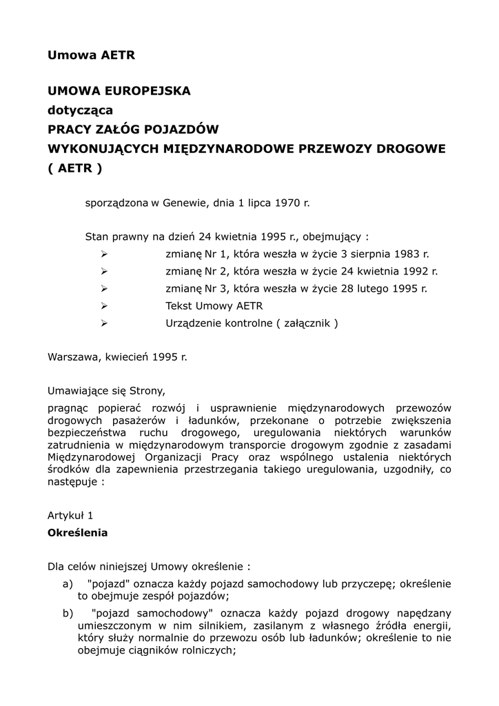 Umowa AETR UMOWA EUROPEJSKA dotycząca PRACY ZAŁÓG POJAZDÓW WYKONUJĄCYCH MIĘDZYNARODOWE PRZEWOZY DROGOWE ( AETR ) sporządzona w Genewie, dnia 1 lipca 1970 r. Stan prawny na dzień 24 kwietnia 1995 r., obejmujący : Ø zmianę Nr 1, która weszła w życie 3 sierpnia 1983 r. Ø zmianę Nr 2, która weszła w życie 24 kwietnia 1992 r. Ø zmianę Nr 3, która weszła w życie 28 lutego 1995 r. Ø Tekst Umowy AETR Ø Urządzenie kontrolne ( załącznik ) Warszawa, kwiecień 1995 r. Umawiające się Strony, pragnąc popierać rozwój i usprawnienie międzynarodowych przewozów drogowych pasażerów i ładunków, przekonane o potrzebie zwiększenia bezpieczeństwa ruchu drogowego, uregulowania niektórych warunków zatrudnienia w międzynarodowym transporcie drogowym zgodnie z zasadami Międzynarodowej Organizacji Pracy oraz wspólnego ustalenia niektórych środków dla zapewnienia przestrzegania takiego uregulowania, uzgodniły, co następuje : Artykuł 1 Określenia Dla celów niniejszej Umowy określenie : a) "pojazd" oznacza każdy pojazd samochodowy lub przyczepę; określenie to obejmuje zespół pojazdów; b) "pojazd samochodowy" oznacza każdy pojazd drogowy napędzany umieszczonym w nim silnikiem, zasilanym z własnego źródła energii, który służy normalnie do przewozu osób lub ładunków; określenie to nie obejmuje ciągników rolniczych; c) "przyczepa" oznacza każdy pojazd przeznaczony do ciągnięcia przez pojazd samochodowy; określenie to obejmuje naczepy; d) "naczepa" oznacza każdą przyczepę przeznaczoną do sprzęgania z pojazdem samochodowym w taki sposób, że część naczepy spoczywa na pojeździe samochodowym i że znaczna część masy naczepy i jej ładunku obciąża pojazd samochodowy; e) "zespół pojazdów" oznacza sprzężone ze sobą pojazdy, poruszające się po drodze jako całość; f) "dopuszczalna masa całkowita" oznacza całkowitą masę pojazdu wraz z ładunkiem ustaloną jako dopuszczalną przez właściwą władzę kraju rejestracji pojazdu; g) przez "przewóz drogowy", każde przemieszczenie pojazdu w stanie próżnym lub ładownym po drogach otwartych do użytku publicznego, przeznaczonego do przewozu pasażerów lub towarów; h) "międzynarodowy przewóz drogowy" oznacza przewóz drogowy, w czasie którego następuje przekroczenie przynajmniej jednej granicy; i) przez "usługi regularne", usługi polegające na przewozie osób z określoną częstotliwością i po określonych trasach, z możliwością wsiadania i wysiadania na ustalonych z góry przystankach. Regulamin eksploatacyjny lub zastępujące go dokumenty, zatwierdzone przez kompetentne władze państwowe Umawiających się Stron i opublikowane przez przewoźnika przed ich zastosowaniem, określają warunki przewozu, mianowicie częstotliwość, rozkłady jazdy, taryfy i obowiązek przewozu w takim zakresie, w jakim te warunki nie są ujęte w prawie lub przepisach. Są również uznane za usługi regularne te usługi, które zapewniają przewóz określonych kategorii osób, z wyłączeniem innych podróżnych, w zakresie, w jakim są świadczone na warunkach określonych w pierwszym akapicie niniejszej definicji, niezależnie od tego, kto je organizuje. Usługi tej kategorii , mianowicie zapewniające przewóz pracowników do miejsca pracy oraz z miejsca pracy do ich miejsca zamieszkania lub przewóz uczniów do szkół oraz ze szkół do ich miejsca zamieszkania, będą dalej określone jako "specjalne usługi regularne"; j) "kierowca" oznacza każdą osobę, otrzymującą wynagrodzenie lub nie, która kieruje pojazdem nawet w ciągu krótkiego okresu czasu oraz każdą osobę, która znajduje się w pojeździe, aby kierować nim w razie potrzeby; k) "członek załogi" oznacza kierowcę lub każdą z niżej wymienionych osób, niezależnie od tego, czy osoba ta otrzymuje wynagrodzenie czy też nie: i) "konwojenta" tzn. każdą osobę towarzyszącą kierowcy, która pomaga mu w niektórych manewrach i biorącą zwykle czynny udział w operacjach transportowych, chociaż nie będącą kierowcą w rozumieniu ustępu j) niniejszego artykułu; ii) "konduktora" tzn. osobę towarzyszącą kierowcy pojazdu samochodowego przeznaczonego do przewozu pasażerów, odpowiedzialną w szczególności za sprzedaż i kontrolowanie biletów lub innych dokumentów upoważniających pasażerów do podróży tym pojazdem; l) "tydzień" oznacza okres zawarty między godziną 0:00 w poniedziałek a godziną 24:00 w niedzielę; m) "odpoczynek" oznacza każdy nieprzerwany okres obejmujący co najmniej jedną godzinę podczas którego kierowca może swobodnie dysponować swoim czasem. Artykuł 2 Zakres stosowania 1. Niniejszą Umowę stosuje się na terytorium każdej Umawiającej się Strony do każdego międzynarodowego przewozu drogowego wykonywanego pojazdem zarejestrowanym na terytorium tej Umawiającej się Strony lub na terytorium każdej innej Umawiającej się Strony. 2. Jednakże: a) jeżeli podczas międzynarodowego przewozu drogowego jeden lub więcej członków załogi nie opuszcza terytorium państwowego, na którym jest normalnie zatrudniony, Umawiająca się Strona, której podlega ten obszar, może nie stosować do niego lub do nich postanowień niniejszej Umowy; b) jeśli Umawiające się Strony, których terytorium jest wykorzystywane, nie uzgodnią inaczej, niniejsza Umowa nie ma zastosowania do międzynarodowych przewozów drogowych, wykonywanych przez: 1. Pojazdy, przeznaczone do przewozu towarów i których dopuszczalna masa całkowita, łącznie z przyczepami lub naczepami, nie przekracza 3,5 tony; 2. Pojazdy, przeznaczone do przewozu pasażerów, które ze względu na typ konstrukcyjny i wyposażenie nadają się do przewozu najwyżej dziewięciu osób łącznie z kierowcą i są do tego celu przeznaczone; 3. Pojazdy, przeznaczone do przewozu pasażerów w usługach regularnych , których droga przebiegu nie przekracza 50 km ; 4. Pojazdy, których maksymalna prędkość prz