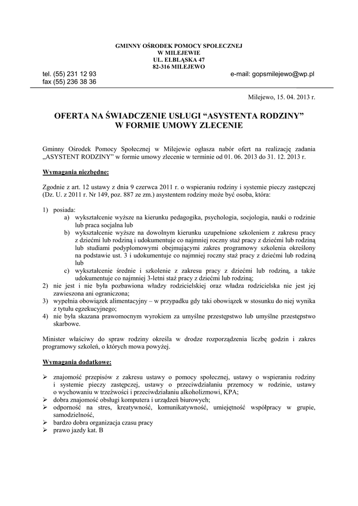 GMINNY OŚRODEK POMOCY SPOŁECZNEJ W MILEJEWIE UL. ELBLĄSKA 47 82-316 MILEJEWO tel. (55) 231 12 93 fax (55) 236 38 36 e-mail: [email protected] Milejewo, 15. 04. 2013 r. OFERTA NA ŚWIADCZENIE USŁUGI “ASYSTENTA RODZINY” W FORMIE UMOWY ZLECENIE Gminny Ośrodek Pomocy Społecznej w Milejewie ogłasza nabór ofert na realizację zadania „ASYSTENT RODZINY” w formie umowy zlecenie w terminie od 01. 06. 2013 do 31. 12. 2013 r. Wymagania niezbędne: Zgodnie z art. 12 ustawy z dnia 9 czerwca 2011 r. o wspieraniu rodziny i systemie pieczy zastępczej (Dz. U. z 2011 r. Nr 149, poz. 887 ze zm.) asystentem rodziny może być osoba, która: 1) posiada: a) wykształcenie wyższe na kierunku pedagogika, psychologia, socjologia, nauki o rodzinie lub praca socjalna lub b) wykształcenie wyższe na dowolnym kierunku uzupełnione szkoleniem z zakresu pracy z dziećmi lub rodziną i udokumentuje co najmniej roczny staż pracy z dziećmi lub rodziną lub studiami podyplomowymi obejmującymi zakres programowy szkolenia określony na podstawie ust. 3 i udokumentuje co najmniej roczny staż pracy z dziećmi lub rodziną lub c) wykształcenie średnie i szkolenie z zakresu pracy z dziećmi lub rodziną, a także udokumentuje co najmniej 3-letni staż pracy z dziećmi lub rodziną; 2) nie jest i nie była pozbawiona władzy rodzicielskiej oraz władza rodzicielska nie jest jej zawieszona ani ograniczona; 3) wypełnia obowiązek alimentacyjny – w przypadku gdy taki obowiązek w stosunku do niej wynika z tytułu egzekucyjnego; 4) nie była skazana prawomocnym wyrokiem za umyślne przestępstwo lub umyślne przestępstwo skarbowe. Minister właściwy do spraw rodziny określa w drodze rozporządzenia liczbę godzin i zakres programowy szkoleń, o których mowa powyżej. Wymagania dodatkowe: znajomość przepisów z zakresu ustawy o pomocy społecznej, ustawy o wspieraniu rodziny i systemie pieczy zastępczej, ustawy o przeciwdziałaniu przemocy w rodzinie, ustawy o wychowaniu w trzeźwości i przeciwdziałaniu alkoholizmowi, KPA; dobra znajomość obsługi komputera i urządzeń biurowych; odporność na stres, kreatywność, komunikatywność, umiejętność współpracy w grupie, samodzielność, bardzo dobra organizacja czasu pracy prawo jazdy kat. B Zakres podstawowych obowiązków: Asystent rodziny jest obowiązany do systematycznego podnoszenia w szczególności poprzez udział w szkoleniach oraz samokształcenie. swoich kwalifikacji Do zadań asystenta rodziny należy w szczególności: 1. opracowywanie i realizacja planu pracy z rodziną we współpracy z członkami rodziny i w konsultacji z pracownikiem socjalnym; 2. opracowanie, we współpracy z członkami rodziny i koordynatorem rodzinnej pieczy zastępczej, planu pracy z rodziną, który jest skoordynowany z planem pomocy dziecku umieszczonemu w pieczy zastępczej; 3. udzielanie pomocy rodzinom w poprawie ich sytuacji życiowej, w tym w zdobywaniu umiejętności prawidłowego prowadzenia gospodarstwa domowego; 4. udzielanie pomocy rodzinom w rozwiązywaniu problemów socjalnych; 5. udzielanie pomocy rodzinom w rozwiązywaniu problemów psychologicznych; 6. udzielanie pomocy rodzinom w rozwiązywaniu problemów wychowawczych z dziećmi; 7. wspieranie aktywności społecznej rodzin; 8. motywowanie członków rodzin do podnoszenia kwalifikacji zawodowych; 9. udzielanie pomocy w poszukiwaniu, podejmowaniu i utrzymywaniu pracy zarobkowej; 10. motywowanie do udziału w zajęciach grupowych dla rodziców, mających na celu kształtowanie prawidłowych wzorców rodzicielskich i umiejętności psychospołecznych; 11. udzielanie wsparcia dzieciom, w szczególności poprzez udział w zajęciach psychoedukacyjnych; 12. podejmowanie działań interwencyjnych i zaradczych w sytuacji zagrożenia bezpieczeństwa dzieci i rodzin; 13. prowadzenie indywidualnych konsultacji wychowawczych dla rodziców i dzieci; 14. prowadzenie dokumentacji dotyczącej pracy z rodziną; 15. dokonywanie okresowej oceny sytuacji rodziny i przekazywanie tej oceny Kierownikowi Gminnego Ośrodka Pomocy Społecznej w Milejewie; 16. monitorowanie funkcjonowania rodziny po zakończeniu pracy z rodziną; 17. sporządzanie, na wniosek sądu, opinii o rodzinie i jej członkach; 18. współpraca z jednostkami administracji rządowej i samorządowej, właściwymi organizacjami pozarządowymi oraz innymi podmiotami i osobami specjalizującymi się w działaniach na rzecz dziecka i rodziny; 19. współpraca z zespołem interdyscyplinarnym lub grupą roboczą, o których mowa w art. 9a ustawy z dnia 29 lipca 2005 r. o przeciwdziałaniu przemocy w rodzinie (Dz. U. Nr 180, poz. 1493, z 2009 r. Nr 206, poz. 1589 oraz z 2010 r. Nr 28, poz. 146 i Nr 125, poz. 842) lub innymi podmiotami, których pomoc przy wykonywaniu zadań uzna za niezbędną. Wymagane dokumenty: 1) 2) 3) 4) 5) list motywacyjny; CV z informacjami o wykształceniu i opisem dotychczasowego przebiegu pracy zawodowej; kserokopia dowodu osobistego; kserokopie dokumentów potwierdzających wykształcenie i dodatkowe kwalifikacje; oświadczenie kandydata o braku przeciwwskazań zdrowotnych do wykonywania pracy na w/w stanowisku; 6) oświadczenie kandydata o znajomości wymaganych przepisów / aktów prawnych 7) oświadczenie kandydata o korzystaniu z pełni praw publicznych i o niekaralności za przestępstwo popełnione umyślnie oraz umyślne przestępstwo skarbowe; 8) oświadczenie kandydata, iż nie jest i nie był pozbawiony władzy rodzicielskiej oraz władza rodzicielska nie została mu zawieszona ani ograniczona; 9) oświadczenie kandydata, że wypełnia obowiązek alimentacyjny, w przypadku, gdy taki obowiązek w stosunku do niego wynika z tytułu egzekucyjnego. Dokumenty aplikacyjne powinny być opatrzone klauzulą: „Wyrażam zgodę na przetwarzanie moich danych osobowych zawartych w ofercie pracy dla potrzeb procesu naboru zgodnie z ustawą z dnia 29. 08. 1997 r. o ochronie danych osobowych (Dz. U. z 2002 r. Nr 101, poz. 92