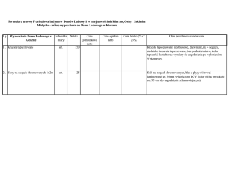 Formularz cenowy Przebudowa budynków Domów Ludowych w miejscowościach Kierzno, Osiny i Szklarka Mielęcka – zakup wyposażenia do Domu Ludowego w Kierznie Lp. Wyposażenie Domu Ludowego w Kierznie Jednostka miary Sztuki 1. Krzesła tapicerowane szt. 150 2. Stoły na nogach chromowanych 1x2m szt. 25 Cena jednostkowa netto Cena ogółem netto Cena brutto (VAT 23%) Opis przedmiotu zamówienia Krzesło tapicerowane nieobrotowe, drewniane, na 4 nogach, siedzisko i oparcie tapicerowane, bez podłokietników, kolor tapicerki, kształt oraz wymiary do uzgodnienia po wyłonienieni Wykonawcy, Stół na nogach chromowanych, blat z płyty wiórowej laminowanej gr. 36mm wykończony PCV, kolor olcha, wysokość ok. 95 cm (do uzgodnienia z Zamawiającym) 3. Stół do ping-ponga szt. 2 Wymiary stołu: długość: 274cm, szerokość: 152,5cm, wysokość: 76cm Grubość blatu (MDF)kolor zielony 16mm, pole do gry odznaczone biała lina o szerokości 2cm wzdłuż każdej bocznej i końcowej krawędzi stołu, do gier podwójnych każde pole podzielone na dwa półpola biała centralna linią o szerokości 3mm, blat stołu powinien być od spodu wzmocniony metalowa ramą, Konstrukcja wzmacniająca blat wykonana z profili stalowych o grubości 30 x 15mm Nogi wykonane z profili stalowych o grubości 30 x 30mm Osiem gumowych kółek o średnicy 55mm z hamulcem do łatwego przemieszczania stołu. Składany w celu łatwiejszego przechowywania Siatka (do każdego stołu powinna być dołączona siatka w zestawie, który to zestaw składa się z siatki, jej zawieszenia i nośnych słupków wraz z zaciskami mocującymi je do stołu. Siatka powinna być zawieszona na lince przymocowanej przy każdym końcu pionowego słupka na wysokości 15,25 cm, a boczna krawędź słupka powinna być w odległości 15,25 cm na zewnątrz od bocznej linii stołu. Górna część siatki, na całej jej długości powinna być15,25 cm powyżej powierzchni gry. Dół siatki, na całej jej długości, powinien być blisko jak jest tylko możliwe – nośnych słupków) oraz 2 zestawy paletka do ping ponga, 10sztuk piłeczek białych 4. Regały stalowe systemowe stal nierdzewna szt. 4 5. Kuchenka gazowa z piekarnikiem elektrycznym szt. 2 Wymiary dł. 139cm, szer. 37,3cm, wys. 155cm, konstrukcja oraz półki ze stali nierdzewnej, 4 półki, możliwość łączenia w moduły, demontowane półki, Wymiary min wysokość 85cm, szerokość 50cm, głębokość 60cm; czteropalnikowa (moc palników; 1000W,1800W,1800W,2800W), piekarnik elektryczny, ruszt podwójny; wymuszony obieg; zabezpieczenie przeciwwypływowe; szuflada na prowadnicach rolkowych; piekarnik wykończony emalią łatwo czyszczącą; oświetlenie wnętrza; kolor inox; kuchenkę należy wyposażyć w butlę propan butan 11kg wraz z przyłączem 6. Chłodziarka pój. 360L szt. 1 Wysoka wydajność sprężarki Niski poziom hałasu Wyświetlacz cyfrowy Automatyczne odszranianie Rodzaj chłodziwa R600 6 półek w komplecie (druciane) Pojemność 360 litrów Moc 150 W Zakres temperatur +3°C +8°C Zasilanie 230 V 7. Stół roboczy stal nierdzewna z półką 0,9mx8mb (bok skrajny zabezpieczyć osłona na wysokość 10cm) szt. 1 Stół stal nierdzewna z półką - dł. 250cm, szer. 90cm, wys. 85cm (możliwość demontażu nóg) Stół stal nierdzewna z półką (3 szt.) - dł. 150cm, szer. 90cm, wys. 85cm Stół stal nierdzewna z półką - dł. 100cm, szer. 90cm, wys. 85cm 8. Regały metalowe magazynowe 7x6x1,6m szt. 7 Regały magazynowe systemowe stalowe malowane proszkowo o regulowanym położeniu półki, 5 półek ze stali, siedem modułów systemowych o wymiarach dł. 6m, szer. 0,65m, wys. 1,6m, 9. Regały stal nierdzewna 2,7x0,6x1,6 (5 półek) szt. 1 Regał systemowy ze stali nierdzewnej, możliwość regulacji wysokości półek, obciążenie na półkę min 100kg, 5 półek - do uzgodnienia z Zamawiającym 10. Regały stal nierdzewna 2x0,6x1,6 (dł. 2m, szer. 0,6m, wys. 1,6m) szt. 2 Regał systemowy ze stali nierdzewnej, możliwość regulacji wysokości półek, obciążenie na półkę min 100kg, 5 półek - do uzgodnienia z Zamawiającym Suma