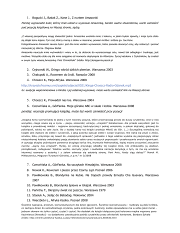 1. Bogucki J., Bzdak Z., Kane J., Z nurtem Amazonki Poniżej wypowiedzi ludzi, którzy brali udział w wyprawie Amazonką, bardzo ważne stwierdzenia, warto zamieścić pod pozycją książkową na Waszej stronie, sądzę. „Z własnej perspektywy mogę stwierdzić jedno: Amazonka uwolniła mnie z kokonu, w jakim byłem spowity, i moje życie stało się dzięki temu lepsze. Tym zaś, którzy marzą o skoku w nieznane, powiem krótko: zróbcie go. Joe Kane Fotografowanie Amazonki zawsze było i jest dla mnie wielkim wyzwaniem, które pozwala otworzyć oczy, aby zobaczyć i poznać niezwykłe jej oblicze. Zbigniew Bzdak Amazonka nauczyła mnie wytrwałości i wiary w to, że dotarcie do wyznaczonego celu, nawet tak odległego i trudnego, jest możliwe. Wszystko stało się dla mnie osiągalne od momentu dopłynięcia do Atlantyku. Życzę każdemu z Czytelników, by znalazł w swym życiu własną Amazonkę. Piotr Chmieliński” źródło: http://ksiegarnia.pascal.pl 2. Cejrowski W., Gringo wśród dzikich plemion. Warszawa 2003 3. Chałupski A., Rowerem do Indii. Rzeszów 2008 4. Choszcz K., Moja Afryka. Warszawa 2008 http://krzysztofrozmus.net/zapiski/zdjecia/0021/Kinga-Choszcz-Radio-Gdansk.mp3 tu: audycja wspomnieniowa o Kindze i jej ostatniej wyprawie, może warto zamieścić link na Waszej stronie 5. Choszcz K., Prowadził nas los. Warszawa 2004 6. Czerwińska A., GórFanka. Moje górskie ABC w skale i lodzie. Warszawa 2008 poniżej: recenzja promująca książkę, może też warto zamieścić przy pozycji „Książka Anny Czerwińskiej to jedna z tych niewielu pozycji, które przemawiają prosto do duszy czytelnika. Jest w niej wszystko, czego szuka się w życiu – pasja, szczerość, emocje, „mięsiści” bohaterowie. Ale przede wszystkim jest to książka o prawdziwej miłości - najpierw szczenięcej, bezkrytycznej i pełnej uniesienia, a potem dojrzałej, gotowej do poświęceń, takiej na całe życie. Bo z każdej karty tej książki przebija Miłość do Gór. (...) Szczególną wartością tej książki jest dystans do siebie i szczerość, z jaką autorka opisuje siebie i swoje wyprawy. Nie waha się pisać o złości, smutku, bólu, przyznaje się nawet do „niepięknych sprawek”, jednakże z tego właśnie wyłania się pasjonujący obraz nietuzinkowej kobiety owładniętej pasją stawiania sobie coraz wyższych poprzeczek i przekraczania swoich ograniczeń. A czytając akapity poświęcone partnerce drugiego końca liny, Krystynie Palmowskiej, lepiej można zrozumieć znaczenie zwrotu: „Łączy nas przyjaźń”. Myślę, że wilczą przysługę oddałby tej książce ktoś, kto próbowałby ją uładzać, porządkować, redagować. Właśnie wartki, soczysty język i swobodna narracja decydują o tym, że ma się wrażenie intymnej rozmowy z autorką i z żalem odwraca się ostatnią stronę. Pani Aniu, kiedy ciąg dalszy?” Marek M. Mikłaszewicz, Magazyn Turystyki Górskiej „n.p.m.” nr 3/2008 7. Czerwińska A., GórFanka. Na szczytach Himalajów. Warszawa 2008 8. Nowak K., Rowerem i pieszo przez Czarny Ląd. Poznań 2006 9. Pawlikowska B., Blondynka na Kubie. Na tropach prawdy Ernesta Che Guevary. Warszawa 2007 10. Pawlikowska B., Blondynka śpiewa w Ukajali. Warszawa 2003 11. Perkitny T., Okrążmy świat raz jeszcze. Warszawa 1979 12. Stasiuk A., Jadąc do Babadag. Wołowiec 2004 13. Wierzbicki Ł., Afryka Kazika. Poznań 2008 Świetnie napisana, prostym, komunikatywnym dla dzieci językiem. Świetnie skonstruowana - rozdziały są dość krótkie, co zachęca dzieci do samodzielnego czytania, pełna kolorowych ilustracji, każde opowiadanie ma w sobie jakiś morał jednym słowem nic tylko czytać, czytać i czytać. Na dodatek do książki dołączona jest kolorowa mapka wyprawy pana Kazimierza [Nowaka] - co dodatkowo uatrakcyjnia podróż czytelnika przez afrykański kontynent. Barbara Sykała źródło: http://merlin.pl/Afryka-Kazika_Lukasz-Wierzbicki/browse/product/1,584530.html