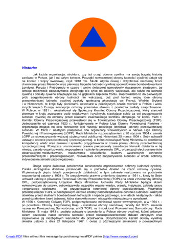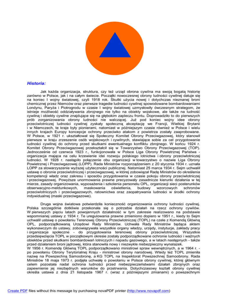 OBRONA CYWILNA Historia: Jak każda organizacja, struktura, czy też urząd obrona cywilna ma swoją bogatą historię zarówno w Polsce, jak i na całym świecie. Początki nowoczesnej obrony ludności cywilnej datuje się na koniec I wojny światowej, czyli 1918 rok. Skutki użycia nowej i dotychczas nieznanej broni chemicznej przez Niemców oraz pierwsze tragedie ludności cywilnej spowodowane bombardowaniami Londynu, Paryża i Piotrogrodu w czasie I wojny światowej uzmysłowiły ówczesnym strategom, że istnieje możliwość oddziaływania zbrojnego nie tylko na obiekty wojskowe, ale także na ludność cywilną i obiekty cywilne znajdujące się na głębokim zapleczu frontu. Doprowadziło to do pierwszych prób zorganizowania obrony ludności nie walczącej. Już pod koniec wojny idee obrony przeciwlotniczej ludności cywilnej zyskały społeczną akceptację we Francji, Wielkiej Brytanii i w Niemczech, te kraje były pionierami, natomiast w późniejszym czasie również w Polsce i wielu innych krajach Europy koncepcje ochrony przeciwko atakom z powietrza zostały zaaprobowane. W Polsce, w 1921 r. ukształtował się Społeczny Komitet Obrony Przeciwgazowej, który stanowił pierwsze w kraju zrzeszenie osób wojskowych i cywilnych, stawiające sobie za cel przygotowanie ludności cywilnej do ochrony przed skutkami ewentualnego konfliktu zbrojnego. W końcu 1924 r. Komitet Obrony Przeciwgazowej przekształcił się w Towarzystwo Obrony Przeciwgazowej (TOP). Jednocześnie od czerwca 1923 r., funkcjonowała w Polsce Liga Obrony Powietrznej Państwa organizacja mająca na celu krzewienie idei rozwoju polskiego lotnictwa i obrony przeciwlotniczej ludności. W 1928 r. nastąpiło połączenie obu organizacji w towarzystwo o nazwie Liga Obrony Powietrznej i Przeciwgazowej (LOPP). Rada Ministrów rozporządzeniem z 20 stycznia 1934 r. uznała LOPP za stowarzyszenie wyższej użyteczności publicznej. Natomiast 25 marca 1934 r. Sejm uchwalił ustawę o obronie przeciwlotniczej i przeciwgazowej, w której zobowiązał Radę Ministrów do określenia kompetencji władz oraz zakresu i sposobu przygotowania w czasie pokoju obrony przeciwlotniczej i przeciwgazowej. Powyższe unormowania prawne precyzowały zasadnicze kierunki działania w tej mierze, zasady organizowania, wyposażenia i szkolenia personelu OPL, organizacji sieci posterunków obserwacyjno-meldunkowych, maskowania oświetlenia, budowy wzorcowych schronów przeciwlotniczych i przeciwgazowych, ratownictwa oraz zaopatrywania ludności w środki ochrony indywidualnej (maski przeciwgazowe). Druga wojna światowa potwierdziła konieczność organizowania ochrony ludności cywilnej. Polska szczególnie dotkliwie przekonała się o potrzebie działań na rzecz ochrony cywilów. W pierwszych pięciu latach powojennych działalność w tym zakresie realizowano na podstawie wspomnianej ustawy z 1934 r. Te uregulowania prawne zmieniono dopiero w 1951 r., kiedy to Sejm uchwalił ustawę o powołaniu Terenowej Obrony Przeciwlotniczej (TOPL) na czele z Komendą Główną OPL, podporządkowaną Urzędowi Rady Ministrów. Uchwała Rady Ministrów będąca aktem wykonawczym do ustawy, zobowiązywała wszystkie organy władzy, urzędy, instytucje, zakłady pracy i organizacje społeczne - do przygotowania terenowej obrony przeciwlotniczej. Wszystkie przedsięwzięcia TOPL w początkowym okresie zostały podporządkowane ochronie ludności i ważnych obiektów przed skutkami bombardowań lotniczych i napadu gazowego, a w latach następnych - także przed działaniem broni jądrowej, która stanowiła nowy i niezwykle niebezpieczny wynalazek. W 1956 r. Komendę Główną TOPL podporządkowano ministrowi spraw wewnętrznych, a w 1964 r. po powołaniu Obrony Terytorialnej Kraju - ministrowi obrony narodowej. Wtedy też TOPL zmieniła nazwę na Powszechną Samoobronę, a KG TOPL na Inspektorat Powszechnej Samoobrony. Rada Ministrów 18 maja 1973 r. podjęła uchwałę o powołaniu w Polsce obrony cywilnej, której głównym celem pozostała nadal ochrona ludności przed niebezpieczeństwami działań zbrojnych oraz zapewnienie jej niezbędnych warunków do przetrwania. Dotychczasowy kształt obrony cywilnej określa ustawa z dnia 21 listopada 1967 r. (wraz z późniejszymi zmianami) o powszechnym Create PDF files without this message by purchasing novaPDF printer (http://www.novapdf.com) obowiązku obrony Rzeczpospolitej Polskiej oraz wydane na jej podstawie dokumenty wykonawcze, w szczególności; - rozporządzenie Rady Ministrów z dnia 28 września 1993 r. w sprawie obrony cywilnej; - rozporządzenie Rady Ministrów z dnia 28 września 1993 r. w sprawie szczegółowego zakresu działania Szefa Obrony Cywilnej Kraju, szefów obrony cywilnej województw i gmin oraz zasad i trybu koordynowania przez nich przygotowań i realizacji przedsięwzięć obrony cywilnej; - rozporządzenie Rady Ministrów z dnia 28 września 1993 r. w sprawie powszechnej samoobrony ludności. Dokumenty te uwzględniają w znacznej mierze postanowienia międzynarodowego prawa wojennego dotyczącego obrony cywilnej, w tym zwłaszcza Protokoły Dodatkowe I i II do Konwencji Genewskiej z dnia 12 sierpnia 1949 r. ratyfikowanego przez Polskę 19 września 1991 r. Tworzeniu nowoczesnego systemu obrony cywilnej sprzyja fakt usytuowania jej od 1997 r. w resorcie Spraw Wewnętrznych i Administracji, co niewątpliwie ułatwia kontakty z całą administracją publiczną (rządową, samorządową) oraz współdziałanie z pozostałymi uczestnikami systemu ochrony ludności. Minister Spraw Wewnętrznych i Administracji powołał 12 kwietnia 1998 r Zespół Reagowania Kryzysowego, który odpowiada za koordynację działań mających na celu zapobieganie i zwalczanie naturalnych klęsk żywiołowych, jak również klęsk spowodowanych przez człowieka oraz usuwanie ich skutków. W dniu 26 listopada 1998 r. Urząd Szefa Obrony Cywilnej Kraju zmienił nazwę na Urząd Zarządzania Kryzysowego i