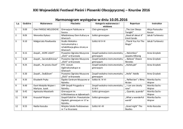 XXI Wojewódzki Festiwal Pieśni i Piosenki Obcojęzycznej – Knurów 2016 Harmonogram występów w dniu 10.05.2016 L.p. Godzina Wykonawca Placówka 1 9.00 Chór PAROLE MELODICHE 2 9.05 Weronika Dykacz 3 9.10 Małgorzata Pawłowska 4 9.15 Zespół „ HOPE LIGHT” 5 9.20 Zespół „ Secrets&Voices” 6 9.25 Zespół „ Po prostu Duet” 7 9.30 Zespół „ Sta&Stam” 8 9.35 Elisabeth Pryka 9 9.40 10 9.45 Duet Matylda Wajner i Martyna Juzek Agnieszka Mazelanik 11 9.50 Krzysztof Wajner 12 9.55 Nadia Kaszuba Gimnazjum Publiczne w Suszcu Młodzieżowy Dom Kultury w Gliwicach Studio WokalnoInstrumentalne z rehabilitacja głosu struny w Gliwicach Prywatne Ognisko Muzyczne „DUO” w Knurowie Prywatne Ognisko Muzyczne „DUO” w Knurowie ETE- Liceum Ogólnokształcące w Gliwicach Prywatne Ognisko Muzyczne „DUO” w Knurowie Śląskie Centrum Muzyczne w Rybniku OPP-Zespół Przygoda w Rybniku Gimnazjum im. A.Mickiewicza w Jejkowicach Zespół Szkół im. Powstańców Sląskich, gimnazjum nr 17 w Rybniku Miejska Szkoła Podstawowa nr 7 w Knurowie Kategoria wykonawcza i wiekowa Chór gimnazjum Repertuar Instruktor „The Lion Sleeps Tonight” „Read all about it” Emeli Sande „Thank You For The Magic” Alicja PastuszkaKoczar Jakub Turkiewicz Zespół wokalno-instrumentalny gimnazjum Zespół wokalno-instrumentalny gimnazjum Zespół wokalno-instrumentalny gimnazjum „ Relentless” zespołu Hillsong „ Believe” Shawn Mendes „Hallelujah” Anna Grzybek Zespół wokalno-instrumentalny gimnazjum Soliści kl. IV-VI „Hello” Adelle Anna Grzybek „ Reflection” z filmu Mulan „ I can see clearly now” „ Quando, quando” Monika SachsWajner Monika SachsWajner Monika SachsWajner Monika SachsWajner Soliści gimnazjum Soliści kl IV-VI Zespół wokalno-instrumentalny kl III-V Soliści gimnazjum Soliści gimnazjum „What a wonderful world” Soliści kl I-III „Good night” The Beatles Jakub Turkiewicz Anna Grzybek Anna Grzybek Anita Kaszuba XXI Wojewódzki Festiwal Pieśni i Piosenki Obcojęzycznej – Knurów 2016 Harmonogram występów w dniu 10.05.2016 13 10.00 Zespół „ Jumpasso” Szkoła Podstawowa nr 19 w Rybniku Szkoła Podstawowa nr 19 w Rybniku Szkoła Podstawowa nr 19 w Rybniku Zespół Szkół Ogólnokształcących w Kmieńcu Szkoła Podstawowa nr 41 w Gliwcach Zespół wokalno-instrumentalny kl. IV-VI Soliści kl.IV-VI 14 10.05 Julia Ziółkowska 15 10.10 Sonia Skarupa 16 10.15 Wiktoria Gittman 17 10.20 Zespół „ Sikorki” 18 10.25 Zespół „ THE BLUE JEANS” Szkoła Podstawowa nr 41 w Gliwcach Zespół wokalno-instrumentalny kl. IV-VI „Lemon tree” 19 10.30 Radosław Garbiec Szkoła Podstawowa nr 41 w Gliwcach Soliści kl. IV-VI „Jozin z bazin” 20 10.35 Szymon Piontek Soliści gimnazjum 21 10.40 Magdalena Hudzikowska Zespół Szkolno – Przedszkolny w Paniówkach Zespół Szkolno – Przedszkolny w Paniówkach 22 10.45 Maja Bogacz Soliści kl. IV-VI 23 10.50 Zespół „ Dziewiątka” 24 10.55 Julia Hemmerling Zespół Szkolno – Przedszkolny w Paniówkach Szkoła Podstawowa nr 9 im. Króla Jana III Sobieskiego w Gliwicach Miejskie Gimnazjum nr 3 w Knurowie „ Ain’t no sunshine” Bill Withers „Medhel An Gwyns” Eleanor Tomlinson „Fields of gold” Sting „ Bridge Over Troubled Water” Paul Simon „ Je suis Malade” Soliści kl.IV-VI Soliści gimnazjum Zespół wokalno-instrumentalny kl. I-III Soliści kl. I-III Zespół wokalno-instrumentalny kl. IV-VI Soliści gimnazjum „ Hallelujah” Leonard Cohen „Say with me” Sam Smith „Titanium” Dawid Guetta „ Break the Distance” Ashton Edminster „il caffe delle Peppina” Beata Wawoczny Beata Wawoczny Beata Wawoczny Rita Bulińska Małgorzata Morawska, Beata Haładus Małgorzata Morawska, Beata Haładus Małgorzata Morawska, Beata Haładus Beata Łakomska Beata Łakomska Beata Łakomska Beata Śmietanka Jacek Żyła XXI Wojewódzki Festiwal Pieśni i Piosenki Obcojęzycznej – Knurów 2016 Harmonogram występów w dniu 10.05.2016 25 11.00 Bartosz Kaszuba 26 12.10 27 12.15 Zespół „ Sky Is Not The Limit” Duet Nikola&Arek Miejskie Gimnazjum nr 3 w Knurowie Zespół Szkół Urszulańskich w Rybniku Gimnazjum nr 2 w Bytomiu 28 12.20 Zespół Bell’TeamCanto Gimnazjum nr 2 w Bytomiu 29 12.25 Tolia Kopczyk 30 12.30 Kaja Krukowska 31 12.35 Paulina Lisiewicz 32 12.40 Karolina Cibis 33 12.45 Zespół „ Yellow” 34 12.50 35 12.55 Zespół WokalnoInstrumentalny Gimnazjum Filomata Aleksandra Korus Szkoła Podstawowa Filomata w Gliwicach Szkoła Podstawowa Filomata w Gliwicach Gimnazjum Filomata w Gliwicach Gimnazjum Filomata w Gliwicach Szkoła Podstawowa Filomata w Gliwicach Gimnazjum Filomata w Gliwicach 36 13.00 Zespół Remedium 37 13.05 Duet Kardamon 38 13.10 Zespół „Stokroty” 39 13.15 Michalina Porszke Zespół Szkół Technicznych w Rybniku OPP Zespół Przygoda w Rybniku OPP Zespół Przygoda w Rybniku Szkoła Podstawowa nr 28 w Rybniku Szkoła Podstawowa nr 28 w Soliści gimnazjum „ 7 Years” Jacek Żyła Zespół wokalno-instrumentalny szkoła ponadgimnazjalna Zespół wokalno-instrumentalny gimnazjum Zespół wokalno-instrumentalny gimnazjum Soliści kl. IV-VI „When Ilook At You” Miley Cyrus „Say Something” Dominika Zdrzałek „ Bille Jean” Michael Jackson „ One call away” Lucyna Brzeziak Soliści kl. IV-VI „Music and me” Soliści gimnazjum „Writings on the wall” Soliści gimnazjum Zespół wokalno-instrumentalny kl. IV-VI Zespół wokalno-instrumentalny gimnazjum „ With a Little Help From My Friends” „ Lemon Tree” Soliści szkoła ponadgimnazjalna „Love Me Like You Do” Zespół wokalno-instrumentalny „Man in the mirror” szkoła ponadgimnazjalna Zespół wokalno-instrumentalny „Zakrili Twoi oczi” szkoła ponadgimnazjalna Tina Karol Zespół woaklno-instrumentalny „ Can’t buy me kl. IV-VI Love” Soliści kl.IV-VI „When you believe” Lucyna Brzeziak Grazyna Dzwonowska Grażyna Dzwonowska Grażyna Dzwonowsk