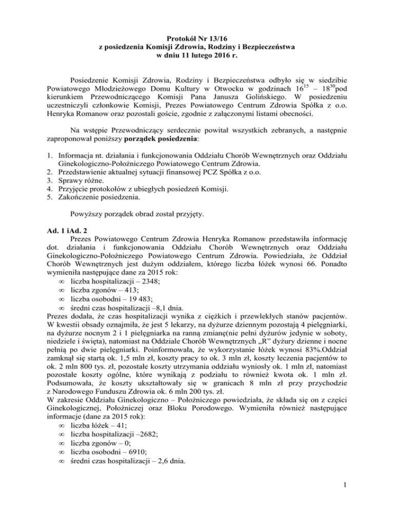 Protokół Nr 13/16 z posiedzenia Komisji Zdrowia, Rodziny i Bezpieczeństwa w dniu 11 lutego 2016 r. Posiedzenie Komisji Zdrowia, Rodziny i Bezpieczeństwa odbyło się w siedzibie Powiatowego Młodzieżowego Domu Kultury w Otwocku w godzinach 1615 – 1830pod kierunkiem Przewodniczącego Komisji Pana Janusza Golińskiego. W posiedzeniu uczestniczyli członkowie Komisji, Prezes Powiatowego Centrum Zdrowia Spółka z o.o. Henryka Romanow oraz pozostali goście, zgodnie z załączonymi listami obecności. Na wstępie Przewodniczący serdecznie powitał wszystkich zebranych, a następnie zaproponował poniższy porządek posiedzenia: 1. Informacja nt. działania i funkcjonowania Oddziału Chorób Wewnętrznych oraz Oddziału Ginekologiczno-Położniczego Powiatowego Centrum Zdrowia. 2. Przedstawienie aktualnej sytuacji finansowej PCZ Spółka z o.o. 3. Sprawy różne. 4. Przyjęcie protokołów z ubiegłych posiedzeń Komisji. 5. Zakończenie posiedzenia. Powyższy porządek obrad został przyjęty. Ad. 1 iAd. 2 Prezes Powiatowego Centrum Zdrowia Henryka Romanow przedstawiła informację dot. działania i funkcjonowania Oddziału Chorób Wewnętrznych oraz Oddziału Ginekologiczno-Położniczego Powiatowego Centrum Zdrowia. Powiedziała, że Oddział Chorób Wewnętrznych jest dużym oddziałem, którego liczba łóżek wynosi 66. Ponadto wymieniła następujące dane za 2015 rok: • liczba hospitalizacji – 2348; • liczba zgonów – 413; • liczba osobodni – 19 483; • średni czas hospitalizacji –8,1 dnia. Prezes dodała, że czas hospitalizacji wynika z ciężkich i przewlekłych stanów pacjentów. W kwestii obsady oznajmiła, że jest 5 lekarzy, na dyżurze dziennym pozostają 4 pielęgniarki, na dyżurze nocnym 2 i 1 pielęgniarka na ranną zmianę(nie pełni dyżurów jedynie w soboty, niedziele i święta), natomiast na Oddziale Chorób Wewnętrznych „R” dyżury dzienne i nocne pełnią po dwie pielęgniarki. Poinformowała, że wykorzystanie łóżek wynosi 83%.Oddział zamknął się startą ok. 1,5 mln zł, koszty pracy to ok. 3 mln zł, koszty leczenia pacjentów to ok. 2 mln 800 tys. zł, pozostałe koszty utrzymania oddziału wyniosły ok. 1 mln zł, natomiast pozostałe koszty ogólne, które wynikają z podziału to również kwota ok. 1 mln zł. Podsumowała, że koszty ukształtowały się w granicach 8 mln zł przy przychodzie z Narodowego Funduszu Zdrowia ok. 6 mln 200 tys. zł. W zakresie Oddziału Ginekologiczno – Położniczego powiedziała, że składa się on z części Ginekologicznej, Położniczej oraz Bloku Porodowego. Wymieniła również następujące informacje (dane za 2015 rok): • liczba łóżek – 41; • liczba hospitalizacji –2682; • liczba zgonów – 0; • liczba osobodni – 6910; • średni czas hospitalizacji – 2,6 dnia. 1 Na Oddziale jest 7 lekarzy, na dyżurze rannym są 2 położne, na dyżurze dziennym są 4 położne, natomiast na nocnym 3. Dodała, że w sobotę, niedzielę i święta nie ma zmiany rannej. Oznajmiła, że wykorzystanie łóżek wynosi 43-44% wykorzystania. Poinformowała, że strata oddziału w 2015 roku wynosiła ok. 700 tys. zł podkreślając, że koszty pracy były znacznie wyższe i wynosiły 2,5 mln zł przy finansowaniu przez NFZ kwotą ok. 3 mln 650 tys. zł. Powiedziała, że koszty leczenia wyniosły prawie 600 tys. zł, pozostałe koszty funkcjonowania oddziału wyniosły prawie 800 tys. zł, natomiast pozostałe koszty ogólne to ok. 600 tys. zł. Podsumowała, że koszty wyniosły prawie 4,5 mln zł przy ww. finansowaniu z NFZ. Przedstawiła także ogólną sytuację finansową Spółki PCZ. Wyjaśniła, że przychody z NFZ za rok 2015 to kwota ok. 39 mln zł, przychody z działalności zamknęły się kwotą 43 mln 600 tys. zł, natomiast koszty działalności przekroczyły 50 mln zł. W związku z powyższym ze wstępnych wyliczeń wynika, że rok 2015 zamknął się stratą 6 mln 670 tys. zł. Dodała, że jest to mniejsza strata niż była prognozowana oraz podkreśliła, że wszystkie ww. informacje to dane wstępne, faktury nadal wpływają. Radna Barbara Markowska poprosiła o uzupełnienie informacji nt. innych pracowników na ww. oddziałach. Zapytała również czy obecny stan kadrowy jest identyczny w stosunku do ubiegłego roku oraz czy są określone standardy ilu pacjentów przypada na jedną pielęgniarkę? Prezes odpowiedziała, że na ww. oddziałach nie pracują salowe, zatrudniona jest firma świadcząca usługi sprzątające. W kwestii standardów powiedziała, że takie nie istnieją i zawsze są starania, aby obsada była pełna. Oznajmiła, że obsada była pełna w ubiegłym roku i jest obecnie, pomimo iż w obsadzie nastąpiły drobne zmiany, m.in. w roku 2015 na Oddziale Ginekologiczno-Położniczym dyżury nocne pełniły 4 pielęgniarki, natomiast obecnie są 3 oraz dodała, że średnia liczba pacjentek na oddziale wynosi ok. 17-18. Powiedziała, że w związku z dużą stratą generowaną przez Spółkę, podjęto szereg działań we wszystkich możliwych obszarach, aby utrzymać Szpital. Radna Barbara Markowska poprosiła, aby przed każdą zmianą przysłuchać się opinii pielęgniarek jako grupie osób najbliższych pacjentowi. Starosta wspomniał dyskusję dot. m.in. przeprowadzenia analizy stanu zatrudnienia na poszczególnych oddziałach, przeprowadzoną podczas sesji Rady Powiatu i zauważył, że przedłożona na Komisji informacja nie jest wystarczająco pełna. Przedstawił swoje oczekiwania dot. formy ww. dokumentu oraz zwrócił się z prośbą o przedłożenie na piśmie pełnej informacji w ww. sprawie. Przewodniczący Komisji zaproponował, aby Prezes Spółki na kolejnym posiedzeniu Komisji przedłożyła ww. informacje w ramach uzupełnienia. Radny Artur Brodowski zwrócił uwagę, iż radni nie otrzymują żadnych wiarygodnych danych. Podkreślił, że również na posiedzeniu Komisji nie są udostępniane materiały związane z tematyk