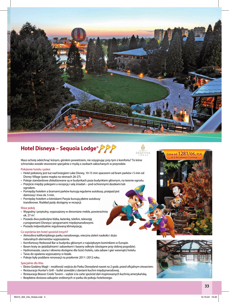 Hotel Disneya – Sequoia Lodge®® Cena od Masz ochotę odetchnąć leśnym, górskim powietrzem, nie rezygnując przy tym z komfortu? To leśne schronisko zostało stworzone specjalnie z myślą o osobach zakochanych w przyrodzie. 1281/os. PLN za 3 dni zabawy i 2 noclegi Położenie hotelu i pokoi • Hotel położony jest tuż nad brzegiem Lake Disney, 10-15 min spacerem od bram parków i 5 min od Disney Village (patrz mapka na stronach 26-27). • Pokoje standardowe zlokalizowane są w budynkach poza budynkiem głównym, na terenie ogrodu. • Przejście między pokojami a recepcją i salą śniadań – pod ochronnymi daszkami lub ogrodem. • Pomiędzy hotelem a bramami parków kursują regularne autobusy, przejazd jest darmowy i trwa ok. 5 min. • Pomiędzy hotelem a lotniskami Paryża kursują płatne autobusy transferowe. Rozkład jazdy dostępny w recepcji. Co wyróżnia ten hotel spośród innych? • Atmosfera kalifornijskiego parku narodowego, wieczna zieleń naokoło i dużo naturalnych elementów wyposażenia. • Komfortowy Redwood Bar w budynku głównym z największym kominkiem w Europie. • Basen kryty ze zjeżdżalniami i zabawkami i baseny odkryte (dostępne przy dobrej pogodzie). • Hydromasaże, sauna i siłownia dostępne dla Gości hotelu, sala zabaw i gier wewnątrz hotelu. • Taras do opalania wyposażony w leżaki. • Pokoje były poddane renowacji na przełomie 2011 i 2012 roku. Specjalnie dla Was • Ekstra Godziny Magii – możliwość wejścia do Parku Disneyland nawet na 2 godz. przed oficjalnym otwarciem. • Restauracja Hunter’s Grill – bufet szwedzki z daniami kuchni międzynarodowej. • Restauracja Beaver Creek Tavern – wybór à la carte spośród dań inspirowanych kuchnią amerykańską. • Bezpłatna dostawa zakupów zrobionych w parku do pokoju hotelowego. © Disney / © Disney-Pixar Wasz pokój • Wygodny i przytulny, wyposażony w drewniane meble, powierzchnia ok. 27 m2. • Posiada dwa podwójne łóżka, łazienkę, telefon, telewizję z programami Disneya i programami międzynarodowymi. • Posiada indywidualnie regulowaną klimatyzację. 33 tf0413_304_Info_Hotele.indd 5 12-10-24 10:40