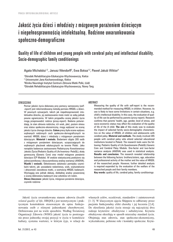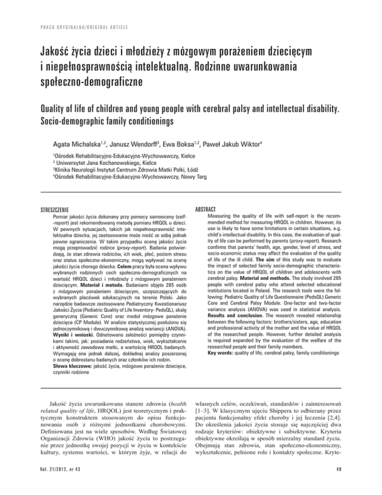 Praca O R Y G I N A L N A / O R I G I N A L A R T I C L E Jakość życia dzieci i młodzieży z mózgowym porażeniem dziecięcym i niepełnosprawnością intelektualną. Rodzinne uwarunkowania społeczno-demograficzne Quality of life of children and young people with cerebral palsy and intellectual disability. Socio-demographic family conditionings Agata Michalska1,2, Janusz Wendorff3, Ewa Boksa1,2, Paweł Jakub Wiktor4 Ośrodek Rehabilitacyjno-Edukacyjno-Wychowawczy, Kielce Uniwersytet Jana Kochanowskiego, Kielce 3 Klinika Neurologii Instytut Centrum Zdrowia Matki Polki, Łódź 4 Ośrodek Rehabilitacyjno-Edukacyjno-Wychowawczy, Nowy Targ 1 2 Streszczenie Abstract Pomiar jakości życia dokonany przy pomocy samooceny (self-report) jest rekomendowaną metodą pomiaru HRQOL u dzieci. W pewnych sytuacjach, takich jak niepełnosprawność intelektualna dziecka, jej zastosowanie może nieść ze sobą jednak pewne ograniczenia. W takim przypadku ocenę jakości życia mogą przeprowadzić rodzice (proxy-report). Badania potwierdzają, że stan zdrowia rodziców, ich wiek, płeć, poziom stresu oraz status społeczno-ekonomiczny, mogą wpływać na ocenę jakości życia chorego dziecka. Celem pracy była ocena wpływu wybranych rodzinnych cech społeczno-demograficznych na wartość HRQOL dzieci i młodzieży z mózgowym porażeniem dziecięcym. Materiał i metoda. Badaniami objęto 285 osób z mózgowym porażeniem dziecięcym, uczęszczających do wybranych placówek edukacyjnych na terenie Polski. Jako narzędzie badawcze zastosowano Pediatryczny Kwestionariusz Jakości Życia (Pediatric Quality of Life Inventory- PedsQL), skalę generyczną (Generic Core) oraz moduł mózgowe porażenie dziecięce (CP Module). W analizie statystycznej posłużono się jednoczynnikową i dwuczynnikową analizą wariancji (ANOVA). Wyniki i wnioski. Odnotowano zależności pomiędzy czynnikami takimi, jak: posiadanie rodzeństwa, wiek, wykształcenie i aktywność zawodowa matki, a wartością HRQOL badanych. Wymagają one jednak dalszej, dokładnej analizy poszerzonej o ocenę dobrostanu badanych oraz członków ich rodzin. Słowa kluczowe: jakość życia, mózgowe porażenie dziecięce, czynniki rodzinne Measuring the quality of life with self-report is the recommended method for measuring HRQOL in children. However, its use is likely to have some limitations in certain situations, e.g. child’s intellectual disability. In this case, the evaluation of quality of life can be performed by parents (proxy-report). Research confirms that parents’ health, age, gender, level of stress, and socio-economic status may affect the evaluation of the quality of life of the ill child. The aim of this study was to evaluate the impact of selected family socio-demographic characteristics on the value of HRQOL of children and adolescents with cerebral palsy. Material and methods. The study involved 285 people with cerebral palsy who attend selected educational institutions located in Poland. The research tools were the following: Pediatric Quality of Life Questionnaire (PedsQL) Generic Core and Cerebral Palsy Module. One-factor and two-factor variance analysis (ANOVA) was used in statistical analysis. Results and conclusion. The research revealed relationship between the following factors: brothers/sisters, age, education and professional activity of the mother and the value of HRQOL of the researched people. However, further detailed analysis is required expanded by the evaluation of the welfare of the researched people and their family members. Key words: quality of life, cerebral palsy, family conditionings Jakość życia uwarunkowana stanem zdrowia (health related quality of life, HRQOL) jest teoretycznym i praktycznym konstruktem stosowanym do opisu funkcjonowania osób z różnymi jednostkami chorobowymi. Definiowana jest na wiele sposobów. Według Światowej Organizacji Zdrowia (WHO) jakość życia to postrzeganie przez jednostkę swojej pozycji w życiu w kontekście kultury, systemu wartości, w którym żyje, w relacji do własnych celów, oczekiwań, standardów i zainteresowań [1–3]. W klasycznym ujęciu Shippera to odbierany przez pacjenta funkcjonalny efekt choroby i jej leczenia [2,4]. Do określenia jakości życia stosuje się najczęściej dwa rodzaje kryteriów: obiektywne i subiektywne. Kryteria obiektywne określają w sposób mierzalny standard życia. Obejmują stan zdrowia, stan społeczno-ekonomiczny, wykształcenie, pełnione role i kontakty społeczne. Kryte- Vol. 21/2012, nr 43 49 Praca O R Y G I N A L N A / O R I G I N A L A R T I C L E ria subiektywne powiązane z satysfakcją z życia to stan fizyczny (ogólna sprawność i wydolność, występowanie dolegliwości), stan psychiczny (reakcje lękowe, depresje, obraz siebie, stres), sytuacja społeczna (satysfakcja z pracy i zarobków, sposób spędzania wolnego czasu) oraz relacje międzyludzkie [1,4–6]. Przeprowadzenie pomiaru jakości życia związane jest z trudnościami wynikającymi z wyboru odpowiedniej strategii oceny. W badaniach nad HRQOL stosowane są dwa sposoby pomiaru. Jakość życia może być obiektywnie oceniana z zewnątrz poprzez określenie sytuacji życiowej pacjenta. Drugim sposobem jest subiektywna ocena dokonana bezpośrednio przez badanego. Obecnie podkreśla się znaczenie subiektywizmu oceny jako własnej charakterystyki poczucia jakości życia [1–3,5]. Samoocena (self-report) została w roku 1993 zarekomendowana przez WHO i Międzynarodowe Stowarzyszenie Psychologii i Psychiatrii Dziecięcej jako najwłaściwszy sposób pomiaru jakości życia dzieci. W pewnych sytuacjach jej zastosowanie może nieść ze sobą jednak pewne ograniczenia, jak w przypadku młodego wieku badanych, ciężkiego stopnia dysfunkcji wynikających z choroby oraz niepełnosprawności intelektualnej. Wtedy ocenę jakości życia mogą przeprowadzić rodzice (proxy-report). Oba rodzaje oceny są uważane za ważne, wzajemnie kom