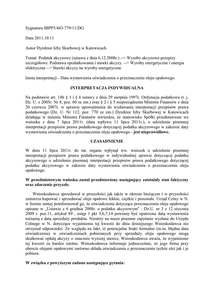 Sygnatura IBPP3/443-779/11/DG Data 2011.10.11 Autor Dyrektor Izby Skarbowej w Katowicach Temat Podatek akcyzowy (ustawa z dnia 6.12.2008r.) --> Wyroby akcyzowe-przepisy szczegółowe. Podstawa opodatkowania i stawki akcyzy. --> Wyroby energetyczne i energia elektryczna --> Stawki akcyzy na wyroby energetyczne Istota interpretacji - Data wystawienia oświadczenia o przeznaczeniu oleju opałowego. INTERPRETACJA INDYWIDUALNA Na podstawie art. 14b § 1 i § 6 ustawy z dnia 29 sierpnia 1997r. Ordynacja podatkowa (t. j. Dz. U. z 2005r. Nr 8, poz. 60 ze zm.) oraz § 2 i § 5 rozporządzenia Ministra Finansów z dnia 20 czerwca 2007r. w sprawie upoważnienia do wydawania interpretacji przepisów prawa podatkowego (Dz. U. Nr 112, poz. 770 ze zm.) Dyrektor Izby Skarbowej w Katowicach działając w imieniu Ministra Finansów stwierdza, że stanowisko Spółki przedstawione we wniosku z dnia 7 lipca 2011r. (data wpływu 11 lipca 2011r.), o udzielenie pisemnej interpretacji przepisów prawa podatkowego dotyczącej podatku akcyzowego w zakresie daty wystawienia oświadczenia o przeznaczeniu oleju opałowego - jest nieprawidłowe. UZASADNIENIE W dniu 11 lipca 2011r. do tut. organu wpłynął ww. wniosek o udzielenie pisemnej interpretacji przepisów prawa podatkowego w indywidualnej sprawie dotyczącej podatku akcyzowego o udzielenie pisemnej interpretacji przepisów prawa podatkowego dotyczącej podatku akcyzowego w zakresie daty wystawienia oświadczenia o przeznaczeniu oleju opałowego. W przedmiotowym wniosku został przedstawiony następujący zaistniały stan faktyczny oraz zdarzenie przyszłe. Wnioskodawca sprzedawał w przeszłości jak także w okresie bieżącym i w przyszłości zamierza kupować i sprzedawać oleje opałowe lekkie, ciężkie i pozostałe. Urząd Celny w N. w formie ustnej poinformował go, że oświadczenia dotyczące przeznaczenia oleju opałowego opisane w „Ustawie z 6 grudnia 2008r. o podatku akcyzowym" - Dz.U. nr 3 z 12 stycznia 2009 r. poz.11, artykuł 89 , ustęp 1 pkt 5,6,7,14 powinny być opatrzone datą wystawienia tożsamą z datą sprzedaży produktu. Niestety na nasze pisemne zapytanie wysłane do Urzędu Celnego w N. dotyczące wyjaśnienia tej kwestii do dnia dzisiejszego Wnioskodawca nie otrzymał odpowiedzi. Ze względu na fakt, iż potencjalne braki formalne (m.in. błędna data oświadczenia) w oświadczeniach pobieranych przy sprzedaży oleju opałowego mogą skutkować opłatą akcyzy o znacznie wyższej stawce, Wnioskodawca uważa, że wyjaśnienie tej kwestii za bardzo istotne. Wnioskodawca informuje jednocześnie, że jego firma przy obrocie olejami opałowymi zarówno składa oświadczenia o przeznaczeniu tychże olei jak i je pobiera. W związku z powyższym zadano następujące pytania: Z jaką datą może być wystawione oświadczenie o przeznaczeniu oleju opałowego opisane w art. 89 „Ustawy z 6 grudnia 2008 r o podatku akcyzowym" - Dz.U. nr 3 z 12 stycznia 2009 r. poz.11. Zdaniem Wnioskodawcy, w obrocie olejami opałowymi firma kupująca olej opałowy w momencie zamówienia oleju opałowego dokonuje jednocześnie czynności prawnych wskazujących, że produkt ten zostanie zużyty zgodnie z jego przeznaczeniem tj. na cele grzewcze (na użytek własny bądź do dalszej odsprzedaży). Ustawodawca natomiast nakłada na podmioty dodatkowy obowiązek wystawiania oświadczeń w formie papierowej i zachowywania ich celem możliwości skontrolowania czy faktycznie oleje opałowe zostały zużyte zgodnie z ich przeznaczeniem - „Ustawa z 6 grudnia 2008r. o podatku akcyzowym" Dz.U. nr 3 z 12 stycznia 2009 r. poz.11, artykuł 89 ustęp 1. Jednocześnie ustawodawca w przepisach szczegółowych ww. artykułu pkt 6 podpunkt 2 nakłada obowiązek określenia ilości i rodzaju oraz przeznaczenia nabywanych wyrobów, co jest możliwe wyłącznie po otrzymaniu danych załadunkowych danego oleju od sprzedającego. Ze względu na specyfikę sprzedaży tj. sprzedaż olejów opałowych w systemie ciągłym (zarówno w porach nocnych jak także podczas sobót, niedziel i dni świątecznych), często informacje o ilości załadowanego produktu kupujący może otrzymać najwcześniej dzień lub nawet 2-3 dni po załadunku. W „Ustawie z 6 grudnia 2008 r o podatku akcyzowym" - Dz.U. nr 3 z 12 stycznia 2009 r. poz.11, artykuł 89, ustęp 1 pkt 7 ustawodawca daje możliwość uzyskania oświadczenia na wystawionej fakturze sprzedaży pod pewnymi dodatkowymi warunkami tj. jeżeli jest ona czytelnie podpisana. Złożenie oświadczenia na fakturze jest możliwe dopiero po jej otrzymaniu a sprzedający ponadto ma prawo wystawić fakturę sprzedaży do 7 dni od daty sprzedaży, poza tym w ogólnych przepisach cywilno-prawnych przyjęte jest, że obieg dokumentacji drogą pocztową trwa do 7 dni. Stąd w ocenie Wnioskodawcy ustawodawca sam dopuszcza możliwość złożenia oświadczenia nawet minimum 14 dni po dacie sprzedaży produktu. Analizując „Ustawę z 6 grudnia 2008r. o podatku akcyzowym" - Dz.U. nr 3 z 12 stycznia 2009 r. poz.11, artykuł 89, ustęp 1 art. pkt 14 Wnioskodawca stoi na stanowisku, że data wystawienia oświadczenia o przeznaczeniu oleju opałowego jest limitowana wyłącznie datą obowiązku przekazania informacji do właściwego Urzędu Celnego o dokonanej sprzedaży i przesłaniu zestawień otrzymanych oświadczeń, tj. do dnia 25-tego miesiąca następującego po dacie sprzedaży. W świetle obowiązującego stanu prawnego stanowisko Wnioskodawcy w sprawie oceny prawnej przedstawionego stanu faktycznego oraz zdarzenia przyszłego uznaje się za nieprawidłowe. Z treści wniosku wynika, iż kwestia będąca przedmiotem niniejszego rozstrzygnięcia dotyczy daty złożenia przez nabywcę, sprzedawcy oleju opałowego przeznaczonego do celów opałowych, oświadczeń uprawniających do zastosowania preferencyjnej stawki akcyzy. W przedstawionym stanie faktycznym oraz zdarzeniu przyszłym Spółka stoi na stanowisku, że ustawodawca dopuszcza możliwo