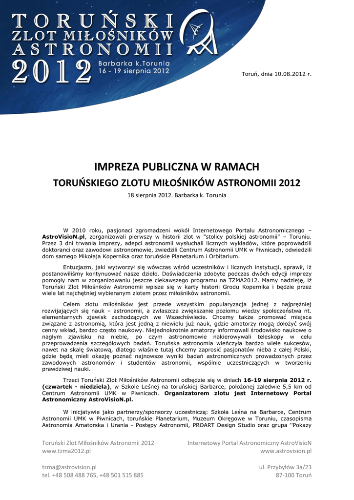 Toruń, dnia 10.08.2012 r. IMPREZA PUBLICZNA W RAMACH TORUOSKIEGO ZLOTU MIŁOŚNIKÓW ASTRONOMII 2012 18 sierpnia 2012. Barbarka k. Torunia W 2010 roku, pasjonaci zgromadzeni wokół Internetowego Portalu Astronomicznego – AstroVisioN.pl, zorganizowali pierwszy w historii zlot w "stolicy polskiej astronomii" – Toruniu. Przez 3 dni trwania imprezy, adepci astronomii wysłuchali licznych wykładów, które poprowadzili doktoranci oraz zawodowi astronomowie, zwiedzili Centrum Astronomii UMK w Piwnicach, odwiedzili dom samego Mikołaja Kopernika oraz toruńskie Planetarium i Orbitarium. Entuzjazm, jaki wytworzył się wówczas wśród uczestników i licznych instytucji, sprawił, iż postanowiliśmy kontynuować nasze dzieło. Doświadczenia zdobyte podczas dwóch edycji imprezy pomogły nam w zorganizowaniu jeszcze ciekawszego programu na TZMA2012. Mamy nadzieję, iż Toruński Zlot Miłośników Astronomii wpisze się w karty historii Grodu Kopernika i będzie przez wiele lat najchętniej wybieranym zlotem przez miłośników astronomii. Celem zlotu miłośników jest przede wszystkim popularyzacja jednej z najprężniej rozwijających się nauk – astronomii, a zwłaszcza zwiększanie poziomu wiedzy społeczeństwa nt. elementarnych zjawisk zachodzących we Wszechświecie. Chcemy także promować miejsca związane z astronomią, która jest jedną z niewielu już nauk, gdzie amatorzy mogą dołożyć swój cenny wkład, bardzo często naukowy. Niejednokrotnie amatorzy informowali środowisko naukowe o nagłym zjawisku na niebie, po czym astronomowie nakierowywali teleskopy w celu przeprowadzenia szczegółowych badań. Toruńska astronomia wieńczyła bardzo wiele sukcesów, nawet na skalę światową, dlatego właśnie tutaj chcemy zaprosić pasjonatów nieba z całej Polski, gdzie będą mieli okazję poznać najnowsze wyniki badań astronomicznych prowadzonych przez zawodowych astronomów i studentów astronomii, wspólnie uczestniczących w tworzeniu prawdziwej nauki. Trzeci Toruński Zlot Miłośników Astronomii odbędzie się w dniach 16-19 sierpnia 2012 r. (czwartek - niedziela), w Szkole Leśnej na toruńskiej Barbarce, położonej zaledwie 5,5 km od Centrum Astronomii UMK w Piwnicach. Organizatorem zlotu jest Internetowy Portal Astronomiczny AstroVisioN.pl. W inicjatywie jako partnerzy/sponsorzy uczestniczą: Szkoła Leśna na Barbarce, Centrum Astronomii UMK w Piwnicach, toruńskie Planetarium, Muzeum Okręgowe w Toruniu, czasopisma Astronomia Amatorska i Urania - Postępy Astronomii, PROART Design Studio oraz grupa ''Pokazy Toruoski Zlot Miłośników Astronomii 2012 www.tzma2012.pl [email protected] tel. +48 508 488 765, +48 501 515 885 Internetowy Portal Astronomiczny AstroVisioN www.astrovision.pl ul. Przybyłów 3a/23 87-100 Toruo Nieba w Toruniu''. Sponsorem głównym została firma Delta Optical – dystrybutor sprzętu astronomicznego. Zlot został objęty honorowym patronatem Prezydenta Miasta Torunia, Polskiego Towarzystwa Astronomicznego oraz Polskiego Towarzystwa Miłośników Astronomii. Patronat medialny sprawuje Polskie Radio Pomorza i Kujaw. Fora forumastronomiczne.pl, astro4u.net oraz serwis astronet.pl i astronomia24.com objęły imprezę internetowym patronatem medialnym. Organizatorzy zlotu przygotowali tradycyjnie niespodziankę dla mieszkańców Torunia Piknik Astronomiczny z licznymi atrakcjami. Impreza odbędzie się 18 sierpnia 2012 roku, w godzinach 19:30 - 23:00 na toruńskiej Barbarce z dala od licznych źródeł światła miasta. Happening astronomiczny rozpocznie się plenerową prelekcją poświęconą meteorytom pt. ''Intruzi spoza Ziemi'', którą poprowadzi Jacek Drążkowski z Polskiego Towarzystwa Meteorytowego. Przedstawiciele firmy Delta Optical omówią dokładnie budowę różnego rodzaju teleskopów, wyjaśnią jak powstaje obraz w okularze teleskopu i jak można zmieniać powiększenie uzyskiwanego obrazu. Nie zabraknie porad dotyczących wyboru pierwszego instrumentu obserwacyjnego, czy też pod obserwacje konkretnej klasy obiektów. Gdy zrobi się już wystarczająco ciemno zacznie się pokaz nieba przez teleskopy uczestników zlotu. Miłośnicy podzielą się swoimi doświadczeniami w podziwianiu skarbów nieba. Barbarka to świetne miejsce do obserwacji astronomicznych, więc uczestnicy imprezy zobaczą przez teleskopy garść słabych, ale bardzo pięknych obiektów nieba letniego takich jak mgławice planetarne, gromady otwarte i kuliste gwiazd oraz galaktyki. Najpierw jednak adepci astronomii poznają sylwetki gwiazdozbiorów nieba letniego wraz z ich najjaśniejszymi gwiazdami i najciekawszymi obiektami. Podniebny spektakl poprowadzą: Marcin Gładkowski, Jakub Bandrowski oraz Jarosław Suchocki z Grupy ''Pokazy Nieba w Toruniu'' (www.pokazy-nieba.pl), zainicjowanej przez portal astronomiczny AstroVisioN.pl. Podczas części obserwacyjnej odbędą się konkursy z upominkami. W sobotę kursują na Barbarkę autobusy MZK linii nr 27. Na placu Teatralnym autobus będzie o godz. 18:10, a na miejscu o godz. 18:35. Powrót do Torunia umożliwi podstawiony autobus MZK (przedłużony kurs linii nr 27 z Barbarki do przystanku ''Plac Teatralny''- biletowany), o którego przybyciu poinformują prowadzący Piknik. Poczuj magię toruńskiej astronomii! Toruoski Zlot Miłośników Astronomii 2012 www.tzma2012.pl [email protected] tel. +48 508 488 765, +48 501 515 885 Internetowy Portal Astronomiczny AstroVisioN www.astrovision.pl ul. Przybyłów 3a/23 87-100 Toruo PROGRAM IMPREZY PUBLICZNEJ TORUOSKIEGO ZLOTU MIŁOŚNIKÓW ASTRONOMII 2012 sobota, 18 sierpnia 2012 r. – Główna polana na Barbarce 19:30 – 20:30 - powitanie gości, przedstawienie programu imprezy. Plenerowa prelekcja dotycząca meteorytów pt. „Intruzi z kosmosu”, którą poprowadzi Jacek Drążkowski z Polskiego Towarzystwa Meteorytowego. 20:30 – 21:00 - prelekcja pt. „Budowa i zastosowania teleskopów”, którą poprowadzą przedstawiciele firmy Delta Optical 