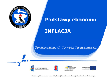 Podstawy ekonomii INFLACJA Opracowanie: dr Tomasz Taraszkiewicz Przegląd niezbędnych definicji do analizy problemu inflacji Inflacja: Proces ogólnego wzrostu cen i kosztów w pewnym okresie. Inflacja, proces wzrostu poziomu cen, powodujący niekontrolowane i nie akceptowane społecznie zmiany proporcji podziału dochodu narodowego. We współczesnej gospodarce światowej występuje ona powszechnie, choć z róŜnym nasileniem w poszczególnych krajach. Stopień nasilenia inflacji określa stopa inflacji, wyraŜająca w procentach wzrost poziomu cen w okresie badanym w stosunku do okresu ubiegłego. Deflacja: Proces ogólnego spadku cen i kosztów w pewnym okresie. Deprecjacja: Spadek siły nabywczej pieniądza. Aprecjacja: Wzrost siły nabywczej pieniądza. Dewaluacja: ObniŜenie zagranicznych. wartości jednostki walutowej danego państwa w stosunku do walut Rewaluacja: PodwyŜszenie wartości jednostki walutowej danego państwa w stosunku do walut zagranicznych. Opracowano w oparciu o materiał źródłowy Przegląd niezbędnych definicji do analizy problemu inflacji cd Denominacja: Formalne zwiększenie siły nabywczej pieniądza. Nulifikacja: Radykalne zmniejszenie obiegu pieniądza. Stagflacja: Okres współwystępowania wysokiej inflacji i wysokiego bezrobocia. Slumpflacja: Wzrost ogólnego poziomu cen i spadek PKB. Indeksacja: Automatyczne dostosowanie wielkości nominalnych do skutków inflacji. Polityka dochodowa: Próba bezpośredniego wpływu na wysokość płac i innych dochodów. Realna podaŜ pieniądza: Iloraz nominalnej podaŜy pieniądza M i poziomu cen P. Ilościowa teoria pieniądza: Zmiany nominalnej podaŜy pieniądza powodują odpowiadające im zmiany poziomu cen, lecz nie wpływają na produkcję i zatrudnienie. Hipoteza Fishera: Wzrostowi inflacji o 1% towarzyszy wzrost stopy procentowej o 1%. Opracowano w oparciu o materiał źródłowy PRZYCZYNY INFLACJI Na inflację mają wpływ następujące czynniki: -niezrównowaŜony budŜet państwa (deficyt budŜetowy); państwo wydaje za duŜo pieniędzy i musi część z nich poŜyczyć, np. poprzez emisję obligacji, - nadmierna emisja pieniądza; w przeszłości często zdarzały się sytuacje, gdy państwo dodrukowywało pieniądze, które pozwalały pokryć wydatki budŜetowe, ale miały zgubny wpływ na poziom inflacji (pieniądz ten był bez pokrycia w towarach), - znaczny wzrost cen surowców energetycznych, np. cen ropy naftowej powoduje wzrost kosztów w wielu gałęziach gospodarki, a przez to wzrost inflacji, - nadmierny wzrost poziomu płac; dochodzi wtedy do zbyt duŜej podaŜy pieniądza na rynku - wzrost płac jest szczególnie niebezpieczny, gdy nie występuje wystarczający wzrost wydajności pracy, - przeinwestowanie gospodarki, - monopolizacja gospodarki; gdy nie ma konkurentów, nie ma presji na spadek cen (konkurencja wymusza spadek cen i wzrost jakości towarów), - wysokie obciąŜenia podatkowe, powodujące wzrost kosztów, a w konsekwencji i cen. Na inflację mają wpływ dodatkowo zewnętrzne szoki podaŜowe. Przykłady: - ropa naftowa – wzrost ceny ropy naftowej powoduje wzrost cen wszystkiego. Importujemy ropę po wyŜszych cenach i wliczamy to do naszych kosztów. - susza w rolnictwie w roku 2000 wpłynęła na wzrost inflacji w lipcu 2000 do 12%. Opracowano w oparciu o materiał źródłowy POMIAR INFLACJI Do mierzenia inflacji wykorzystywane są indeksy: CPI – consumer price index – wskaźnik cen konsumpcyjnych, który odzwierciedla koszty utrzymania i wskazuje wpływ inflacji na poziom Ŝycia gospodarstw domowych. Wskaźnik mierzy koszt koszyka dóbr i usług konsumpcyjnych /Ŝywność, odzieŜ, mieszkanie, opieka lekarska/. KaŜde dobro waŜone jest zgodnie z jego znaczeniem ekonomicznym. Bierze się pod uwagę zmiany cen "koszyka towarów konsumpcyjnych". Indeks cen towarów konsumpcyjnych oblicza się dzieląc wydatki przeciętnego gospodarstwa domowego na zakup koszyka dóbr w badanym roku przez analogiczne wydatki w roku przyjętym za bazowy. Indeks obliczany jest dla przeciętnego gospodarstwa domowego. PPI – production price index – wskaźnik cen dóbr produkcyjnych, który odzwierciedla ceny, które wykazują dostawcy. SłuŜy za podstawę w przewidywaniu przyszłości. MoŜna go teŜ określić wskaźnikiem cen hurtowych, który słuŜy do mierzenia cen w miejscu pierwszej sprzedaŜy dóbr i jest uŜyteczny ze względu na swą wielką szczegółowość - obejmuje ok. 3400 produktów. Trzecim wskaźnikiem jest Korektor PNB ze względu na inflację (GNP - deflator). Jest to wskaźnik cen dla całości PNB. GNP = PNB nominalny / PNB realny Opracowano w oparciu o materiał źródłowy Wskaźniki inflacji Występują dwa główne wskaźniki inflacji: wskaźnik inflacji 12-sto- miesięcznej - wskazuje o ile wzrosły ceny np. w marcu 2001 w stosunku do marca 2000. Przykład: Rada Polityki PienięŜnej zakłada cel inflacyjny 6-8%. Jest to wskaźnik 12-miesięczny grudnia. wskaźnik inflacji średniorocznej – wskazuje o ile zmieniał się wskaźnik cen średnio w danym roku w stosunku do poprzedniego roku. Przykład – w budŜecie państwa. Opracowano w oparciu o materiał źródłowy TYPOLOGIIA INFLACJI 1. Rodzaje inflacji (ze względu na stopy procentowe): 1) Pełzająca (do kilku procent w skali rocznej): - nie powoduje zakłóceń w przebiegu procesów gospodarczych, - poddająca się kontroli. 2) Umiarkowana (mniej niŜ 10% rocznie): -ceny rosną powoli, - ludność niechętnie wydaje pieniądze, ludzie nie boją się zawierać umowy pienięŜne, nieefektywność jest stosunkowo niska. 3) Krocząca (z reguły do kilkunastu procent rocznie): - oczekiwania inflacyjne wywołują określone zachowania podmiotów gospodarczych wzmagające ten proces, - stopniowo zaczyna się wymykać spod kontroli. 4) Galopująca (ceny zaczynają rosnąć powyŜej 20%, a nawet 100 lub 200% rocznie): - pieniądz znacząco traci wartość, ludzie niechętnie trzymają pieniądze w gotówce,