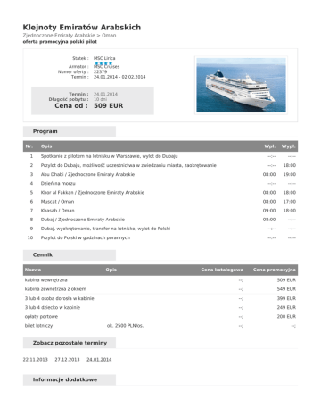 Klejnoty Emiratów Arabskich Zjednoczone Emiraty Arabskie > Oman oferta promocyjna polski pilot Statek : Armator : Numer oferty : Termin : Termin : Długość pobytu : MSC Lirica MSC Cruises 22379 24.01.2014 - 02.02.2014 24.01.2014 10 dni Cena od : 509 EUR Program Nr. Opis Wpł. Wypł. 1 Spotkanie z pilotem na lotnisku w Warszawie, wylot do Dubaju --:-- --:-- 2 Przylot do Dubaju, możliwość uczestnictwa w zwiedzaniu miasta, zaokrętowanie --:-- 18:00 3 Abu Dhabi / Zjednoczone Emiraty Arabskie 08:00 19:00 4 Dzień na morzu --:-- --:-- 5 Khor al Fakkan / Zjednoczone Emiraty Arabskie 08:00 18:00 6 Muscat / Oman 08:00 17:00 7 Khasab / Oman 09:00 18:00 8 Dubaj / Zjednoczone Emiraty Arabskie 08:00 --:-- 9 Dubaj, wyokrętowanie, transfer na lotnisko, wylot do Polski --:-- --:-- Przylot do Polski w godzinach porannych --:-- --:-- 10 Cennik Nazwa Opis Cena katalogowa Cena promocyjna kabina wewnętrzna --; 509 EUR kabina zewnętrzna z oknem --; 549 EUR 3 lub 4 osoba dorosła w kabinie --; 399 EUR 3 lub 4 dziecko w kabinie --; 249 EUR opłaty portowe --; 200 EUR --; --; bilet lotniczy ok. 2500 PLN/os. Zobacz pozostałe terminy 22.11.2013 27.12.2013 24.01.2014 Informacje dodatkowe cena obejmuje: rejs statkiem MSC Lirica ****; zakwaterowanie w kabinie wybranej kategorii (7 noclegów); serwis bagażowy i kabinowy; wyżywienie – 3 główne posiłki, przekąski między posiłkami, bufet lub przekąski o północy; korzystanie z basenu i innych urządzeń sportowo-rekreacyjnych; udział we wszystkich imprezach organizowanych na statku, transfer lotnisko – hotel - port - lotnisko, opiekę polskiego pilota. cena nie obejmuje: opłat portowych i podatków, ubezpieczenia KL, NW, bagażu (200€/os.); kosztów przelotu na trasie Warszawa – Dubaj – Warszawa ok. 2500-3300 PLN/os.; wycieczek fakultatywnych; korzystania z punktów usługowych (pralnia, fotograf, salon piękności i odnowy biologicznej, internet); napojów do obiadów i kolacji oraz drinków; napiwków obowiązkowych dla obsługi statku (ok. 7€/dzień/os.) kosztu wiz do Emiratów Arabskich ok. 150€/os. uwagi: kabiny 3/4 osobowe są dostępne tylko w wybranych kategoriach, a ich liczba jest ograniczona – sprzedaż tylko po potwierdzeniu. Pośredniczymy w załatwieniu wiz Emiratów Arabskich koszt ok. 150€/os. Grupa realizowana przy min. 14 osobach. WYCIECZKI FAKULTATYWNE Klejnoty Emiratów Arabskich