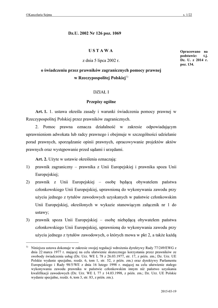 ©Kancelaria Sejmu s. 1/22 Dz.U. 2002 Nr 126 poz. 1069 USTAWA Opracowano na podstawie: t.j. Dz. U. z 2014 r. poz. 134. z dnia 5 lipca 2002 r. o świadczeniu przez prawników zagranicznych pomocy prawnej w Rzeczypospolitej Polskiej 1) DZIAŁ I Przepisy ogólne Art. 1. 1. ustawa określa zasady i warunki świadczenia pomocy prawnej w Rzeczypospolitej Polskiej przez prawników zagranicznych. 2. Pomoc prawna oznacza działalność w zakresie odpowiadającym uprawnieniom adwokata lub radcy prawnego i obejmuje w szczególności udzielanie porad prawnych, sporządzanie opinii prawnych, opracowywanie projektów aktów prawnych oraz występowanie przed sądami i urzędami. Art. 2. Użyte w ustawie określenia oznaczają: 1) prawnik zagraniczny – prawnika z Unii Europejskiej i prawnika spoza Unii Europejskiej; 2) prawnik z Unii Europejskiej – osobę będącą obywatelem państwa członkowskiego Unii Europejskiej, uprawnioną do wykonywania zawodu przy użyciu jednego z tytułów zawodowych uzyskanych w państwie członkowskim Unii Europejskiej, określonych w wykazie stanowiącym załącznik nr 1 do ustawy; 3) prawnik spoza Unii Europejskiej – osobę niebędącą obywatelem państwa członkowskiego Unii Europejskiej, uprawnioną do wykonywania zawodu przy użyciu jednego z tytułów zawodowych, o których mowa w pkt 2, a także każdą 1) Niniejsza ustawa dokonuje w zakresie swojej regulacji wdrożenia dyrektywy Rady 77/249/EWG z dnia 22 marca 1977 r. mającej na celu ułatwienie skutecznego korzystania przez prawników ze swobody świadczenia usług (Dz. Urz. WE L 78 z 26.03.1977, str. 17, z późn. zm.; Dz. Urz. UE Polskie wydanie specjalne, rozdz. 6, tom 1, str. 52, z późn. zm.) oraz dyrektywy Parlamentu Europejskiego i Rady 98/5/WE z dnia 16 lutego 1998 r. mającej na celu ułatwienie stałego wykonywania zawodu prawnika w państwie członkowskim innym niż państwo uzyskania kwalifikacji zawodowych (Dz. Urz. WE L 77 z 14.03.1998, z późn. zm.; Dz. Urz. UE Polskie wydanie specjalne, rozdz. 6, tom 3, str. 83, z późn. zm.). 2015-03-19 ©Kancelaria Sejmu s. 2/22 osobę, która przy użyciu tytułu zawodowego uzyskanego w państwie niebędącym członkiem Unii Europejskiej jest uprawniona do wykonywania zawodu odpowiadającego – pod względem wykształcenia i uprawnień oraz podstawowych zasad jego organizacji i wykonywania – zawodowi adwokata lub radcy prawnego; 4) usługa transgraniczna – jednorazową lub mającą charakter przejściowy czynność z zakresu pomocy prawnej, wykonywaną w Rzeczypospolitej Polskiej przez prawnika zagranicznego wykonującego stałą praktykę w innym państwie; 5) stała praktyka – stałe i systematyczne świadczenie pomocy prawnej przez prawnika zagranicznego w Rzeczypospolitej Polskiej; 6) państwo macierzyste – państwo, w którym prawnik zagraniczny uzyskał prawo do używania jednego z tytułów zawodowych, o których mowa w pkt 2 i 3. Art. 2a. Przepisy ustawy dotyczące prawników z Unii Europejskiej stosuje się odpowiednio także do osób, które: 1) są obywatelami państw członkowskich Europejskiego Porozumienia o Wolnym Handlu (EFTA) – stron umowy o Europejskim Obszarze Gospodarczym lub Konfederacji Szwajcarskiej, uprawnionymi do wykonywania zawodu przy użyciu jednego z tytułów zawodowych uzyskanych w tych państwach, określonych w wykazie stanowiącym załącznik nr 2 do ustawy albo przy użyciu jednego z tytułów zawodowych uzyskanych w państwach członkowskich Unii Europejskiej, określonych w wykazie stanowiącym załącznik nr 1 do ustawy; 2) są obywatelami państw członkowskich Unii Europejskiej, uprawnionymi do wykonywania zawodu przy użyciu jednego z tytułów zawodowych uzyskanych w państwach członkowskich Europejskiego Porozumienia o Wolnym Handlu (EFTA) – stronach umowy o Europejskim Obszarze Gospodarczym lub Konfederacji Szwajcarskiej, określonych w wykazie stanowiącym załącznik nr 2 do ustawy. 2015-03-19 ©Kancelaria Sejmu s. 3/22 DZIAŁ II Wykonywanie stałej praktyki Rozdział 1 Przepisy wspólne Art. 3. Na zasadzie wzajemności, o ile umowy międzynarodowe ratyfikowane przez Rzeczpospolitą Polską lub przepisy organizacji międzynarodowych, których Rzeczpospolita Polska jest członkiem, nie stanowią inaczej, prawnicy zagraniczni są uprawnieni do wykonywania stałej praktyki, na zasadach określonych w przepisach niniejszego działu, po wpisaniu na jedną z list prawników zagranicznych, prowadzoną odpowiednio przez okręgowe rady adwokackie lub rady okręgowych izb radców prawnych, zwaną dalej „listą”. Art. 4. 1. Na listę prowadzoną przez okręgowe rady adwokackie wpisuje się prawników z Unii Europejskiej zamierzających świadczyć pomoc prawną w zakresie odpowiadającym zawodowi adwokata oraz prawników spoza Unii Europejskiej, których tytuł zawodowy uprawnia do wykonywania zawodu odpowiadającego zawodowi adwokata. 2. Na listę prowadzoną przez rady okręgowych izb radców prawnych wpisuje się prawników z Unii Europejskiej zamierzających świadczyć pomoc prawną w zakresie odpowiadającym zawodowi radcy prawnego oraz prawników spoza Unii Europejskiej, których tytuł zawodowy uprawnia do wykonywania zawodu odpowiadającego zawodowi radcy prawnego. 3. Okręgowe rady adwokackie i rady okręgowych izb radców prawnych corocznie do dnia 31 marca przesyłają odpisy prowadzonej przez siebie listy właściwym prezesom sądów apelacyjnych, okręgowych i administracyjnych oraz właściwym prokuratorom apelacyjnym i okręgowym. Okręgowe rady adwokackie przesyłają ponadto odpis listy Naczelnej Radzie Adwokackiej, a rady okręgowych izb radców prawnych – Krajowej Radzie Radców Prawnych. Zawiadamiają także o zmianach na tych listach w terminie 14 dni od dokonania tych zmian. Art. 5. 1. Lista składa się z części, na którą wpisuje się prawników z Unii Europejskiej, i z części, na którą wpisuje się prawników spoza Unii Europejskiej. 2015-03-19 ©Kancelaria Sejmu 