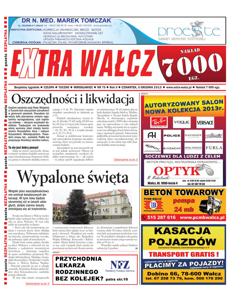 gazeta BEZPŁATNA gazeta BEZPŁATNA gazeta BEZPŁATNA gazeta BEZPŁATNA gazeta BEZPŁATNA Bezpłatny tygodnik CZŁOPA TUCZNO MIROSŁAWIEC NR 75 Rok II CZWARTEK, 5 GRUDNIA 2013 www.extra-walcz.pl Nakład 7 000 egz. Oszczędności i likwidacja Gośćmi ostatniej sesji Rady Miejskiej w Tucznie byli nauczyciele zatrudnieni w gminnych szkołach. Powodem ich wizyty była planowana zmiana regulaminu wynagradzania, czyli najkrócej mówiąc – obcięcie wysokości dodatków. Tradycyjnie nie brakowało ostrej wymiany zdań między burmistrzem Krzysztofem Harą i radnym Krzysztofem Mikołajczykiem. Powodem znowu był… protokół. Padła też propozycja likwidacji ośrodka kultury. To nie jest dobry pomysł Zdają się mówić nauczyciele, słysząc o zmianie wysokości dodatku motywacyjnego i mieszkaniowego. Propozycja włodarzy gminy to obniżenie dodatku motywa- cyjnego z 8 do 3%. Natomiast sugestia związków zawodowych to obniżenie go o 1%. Dodatek mieszkaniowy wynosi teraz: 41 zł/osobę, 55 zł/2 osoby, 68 zł/3 osoby i 82 zł na 4 i więcej osób. Gmina zaproponowała następującą wysokość – 10, 20, 30 i 40 zł, a związki zawodowe 5, 10, 15 i 20 zł. Zmiany są podyktowane koniecznością wprowadzenia programu oszczędnościowego, który ma pozwolić na zrównoważenie budżetu. Zgromadzeni na sesji nauczyciele nie są tym jednak zachwyceni. Oburza ich szczególnie zmniejszenie wysokości dodatku motywacyjnego, bo – jak mówią – to jedyny sposób nagradzania belfrów za wytężoną pracę. W ich imieniu głos zabrała dyrektor Zespołu Szkół m. Wedlów-Tuczyńskich w Tucznie Izabela Krajnik. Mówiła, że obowiązujący regulamin uchwalony został w 2009 roku i od tamtej pory nie wprowadzano w nim żadnych zmian. Według niej stawki nie są wygórowane i nie odbiegają od tych, które obowiązują w ościennych gminach. Jednocześnie podkreśliła, że rozumie konieczność wprowadzenia planu oszczędnościowego, ale zaznaczyła, że nie należy tego robić kosztem dodatku motywacyjnego. Dokończenie na str. 3 Wypalone święta Miejski plan oszczędnościowy nie ominął świątecznych dekoracji. W tym roku będzie skromniej niż w latach ubiegłych, dzięki czemu koszty zmniejszą się aż trzykrotnie. Świąteczny klimat w Wałczu trudno byłoby sobie wyobrazić bez wielkiej choinki na placu Wolności. W tym roku udało się ją pozyskać za darmo. – Przez cały rok monitorujemy podania o wycięcie drzew, które składają nasi mieszkańcy. Wybieramy najładniejsze drzewka, przeprowadzamy wycinkę, nie pobierając opłat od mieszkańców. Dzięki temu mamy piękną choinkę na placu Wolności, a właściciel nie ma kłopotu z nadmiernie rozrośniętym drzewkiem – informuje inspektor do spraw architektury przestrzeni Wydziału Infrastruktury Miejskiej, Gospodarki Komunalnej i Środowiska Urzędu Miasta w Wałczu Barbara Wojdan. – Drzewko pojawiło się już w ubiegły czwartek, 28 grudnia. Kolejne zdobić będzie ulicę Kościuszkowców, niedaleko postoju taksówek. W tym roku miasto zrezygnowało Dokończenie na str. 3 z wypożyczania świątecznych dekoracji, które można było oglądać m.in. na lampach i skwerach. Wyjątkiem jest rondo Solidarności u zbiegu ulic: Bydgoskiej, Wojska Polskiego, Kościuszki i Kilińszczaków. Miasto będzie korzystać z tego, co ma, czyli z lampek, które zostały już powieszone na drzewach. Koszty montareklama żu, demontażu i uzupełnienia dekoracji wyniosą około 30 tysięcy złotych, wcześniej były przynajmniej trzykrotnie wyższe. Na przykład w ubiegłym roku gmina na stworzenie świątecznego nastroju wydała aż 95 tys. zł. Wszystkie ozdoby pełnym blaskiem ZB zalśnią już 6 grudnia. reklama CZWARTEK, 5 GRUDNIA 2013 2 Taniec zamiast narkotyków 29 listopada w gimnazjach w Chwiramie i Lubnie odbyły się spotkania ze zwycięzcą programu „Got to Dance” Dawidem Ignaczakiem. Ich celem było przekonanie młodych ludzi, że pasje i talenty można rozwijać, nie zażywając substancji psychoaktywnych. Uczniowie mogli porozmawiać z tancerzem, zobaczyć na żywo jego krótki występ, a nawet pouczyć się tańca i zdobyć autograf. – To mój kolejny pobyt na Pojezierzu Wałeckim. Spotkania były bardzo udane, a uczniowie przyjęli mnie bardzo dobrze – mówi Dawid Ignaczak. – Mam nadzieję, że młodzież potraktowała spotkanie ze mną nie tylko jako miło spędzony czas, ale również zapamiętała to co im przekazałem na temat narkotyków. Spotkanie zorganizował i prowadził Adrian Zalewski. OPRAC. PK Ugotowany O dużym szczęściu może mówić jeden z mieszkańców ulicy Bydgoskiej, który omal nie udusił się w wyniku… spalenia garnka w swoim mieszkaniu. Pożar nastąpił w poniedziałek, 2 grudnia. Strażacy, którzy przyjechali na miejsce musieli najpierw wyważyć drzwi, żeby dostać się do mieszkania. W środku znaleźli leżącego na podłodze mężczyznę. Przystąpili do szybkiej akcji ratowniczej, udrożnili jego drogi oddechowe i przywrócili oddech. Później mężczyzna został odwieziony do szpitala przez pracowników pogotowia. Jak to możliwe, że nie zareagował, kiedy pozostawiony na kuchence garnek zaczął się palić? Odpowiedź jest prosta… Prawie trzy promile alkoholu we krwi. Mężczyzna został ukarany Z mandatem. Przykre odkrycie Na ulicy Kaszubskiej w Wałczu strażacy i policjanci dokonali makabrycznego odkrycia. W jednym z mieszkań znaleźli zwłoki kobiety. W poniedziałek, 2 grudnia opiekunka 86-letniej wałczanki nie mogła się dostać do mieszkania swojej podopiecznej. Zaalarmowała więc policjan- tów i strażaków, którzy razem dostali się do środka przez uchylone okno. Staruszka leżała na podłodze. Lekarze pogotowia stwierdzili jej zgon, a przybyły na miejsce prokurator wykluczył udział osób trzecich i polecił wydanie ciała rodzinie. Kobieta zmarła z przyczyn naturalnych. Z Bezdomni pod kontrolą Policjanci wspólnie ze strażnikami miejskimi i pra