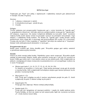 56734 Gra Gęsi Tradycyjna gra "Gęsi" jest jedną z najstarszych i najbardziej znanych gier planszowych w Europie. Gra dla 2-6 graczy. Zawiera: 1 planszę z miejscami w spirali, 6 różnokolorowych gęsi - pionki do gry, 2 kostki. Cel gry: Twoim zadaniem jest przeprowadzić bezpiecznie gęś z wieży kościoła do "ogrodu gęsi" w gospodarstwie domowym. Jeśli jako pierwszy przeprowadzisz swoją gęś do "ogrodu gęsi" (63 miejsce), wygrywasz. Ale musisz wylądować dokładnie na tym polu. Jeżeli wyrzucisz większą liczbę oczek musisz wrócić na początek i jeszcze raz przenieść swój pionek z tego miejsca, o nadmierną liczbę kroków. Na drodze do "ogrodu gęsi" trzeba przejść szereg pomieszczeń, które mogą dać ci przewagę nad przeciwnikami lub wysłać Cię z powrotem. Uważaj, aby nie było Ci zbyt wygodnie w "zajeździe" lub żebyś nie znalazł się w "więzieniu". Istnieje wiele niebezpiecznych momentów w życiu gęsi ... Przygotowanie do gry: Każdy gracz wybiera gęś, którą chciałby grać. Wszystkie grające gęsi należy umieścić w przestrzeni startowej przy kościele. Zasady: Gracze po kolei rzucają jedną kostką. Najmłodszy gracz może rozpocząć. Wszystkie pionki startują od pierwszego miejsca, każdy gracz przenosi swoją gęś o tyle pól ile wyrzucił na kostce. Kilka gęsi może stać w tym samym czasie na tym samym polu. Jeśli wylądowałeś na jednym z następujących miejsc (oznaczone na pomarańczowo), coś szczególnego wydarza się w życiu Twojej gęsi: Miejsca gęsi (pole 5, 14, 18, 23, 27, 32, 41, 45, 50, 54 i 59): Te miejsca są szczęśliwe w życiu gęsi. Tutaj można przesunąć swoją gęś do przodu o rzuconą liczbę. Jeśli wylądowałeś na kolejnym miejscu gęsi możesz poruszyć się do przodu o wyrzuconą liczbę. Most (pole 6 i 12): Jeśli Twoje gęsi wylądują na polu 6 możesz natychmiast przejść do pola 12. Jeżeli wylądowały na polu 12 musisz cofnąć się do pola 6. Zajazd (pole 19): Twoja gęś chce odpocząć. Musisz ominąć jedną kolejkę. Studnia (pole 31): Twoja gęś jest spragniona od męczącej podróży i wpada do studni podczas picia. Tracisz kolejkę, aż ktoś nie stanie na tym samym polu, bądź nie wyrzucisz na kostce „6”, wtedy możesz ruszyć dalej. Kości (pole 26 i 53 ): Jeśli twoje gęsi wylądują na polu 26 mogą się przenieść prosto na pole 53. Jeżeli wylądują na polu 53 muszą wrócić na pole 26. W obydwu przypadkach można ponownie rzucić kostką. Labirynt (pole 42): Twoja gęś zgubiła się w labiryncie - powrót na pole 30. Więzienie (pole 52): Szkoda, Twoja gęś musi iść do więzienia i traci 2 rundy! Zły lis (pole 58): Twoja gęś zostaje zaatakowana przez lisa tuż przed dotarciem do "ogrodu gęsi". Udaje, że zasłabła, lis ją zostawia i może ponownie zacząć drogę od pola nr 1. Ogród gęsi (pole 63): Wreszcie gęś jest bezpieczna. Jeśli Twoja gęś jest pierwsza na tym polu to wygrałeś. Możecie razem cieszyć się spokojnym życiem na farmie. Warianty gry: Gra staje się szybsza jeśli uzgodnicie, że nie jest konieczne wylądowanie dokładnie na polu 63, aby wygrać. Grę wygra osoba, która stanie bezpośrednio w polu 63 lub osoba, która wyrzuci liczbę oczek, która przeniesie gracza za pole 63. Dystrybutor: MAXIMA zabawki drewniane, Gorzów Wlkp.